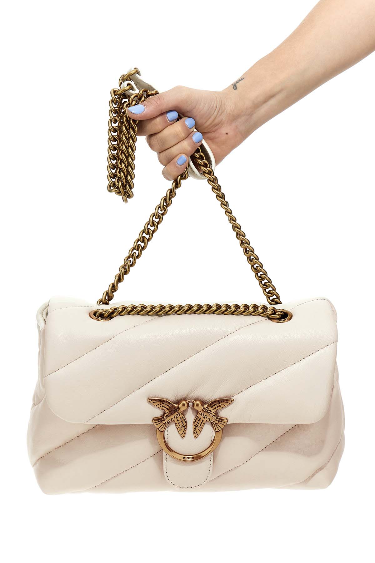 'Love one classic' quilted leather crossbody bag with flap closure, metallic front logo, fitted with chain to be carried over the shoulder.