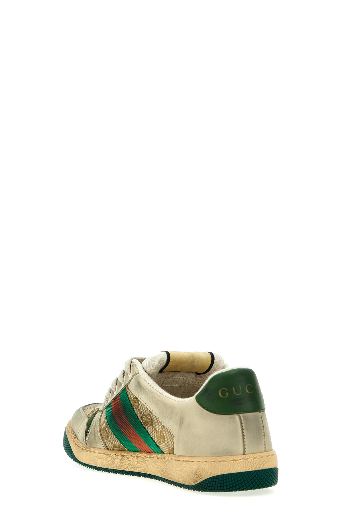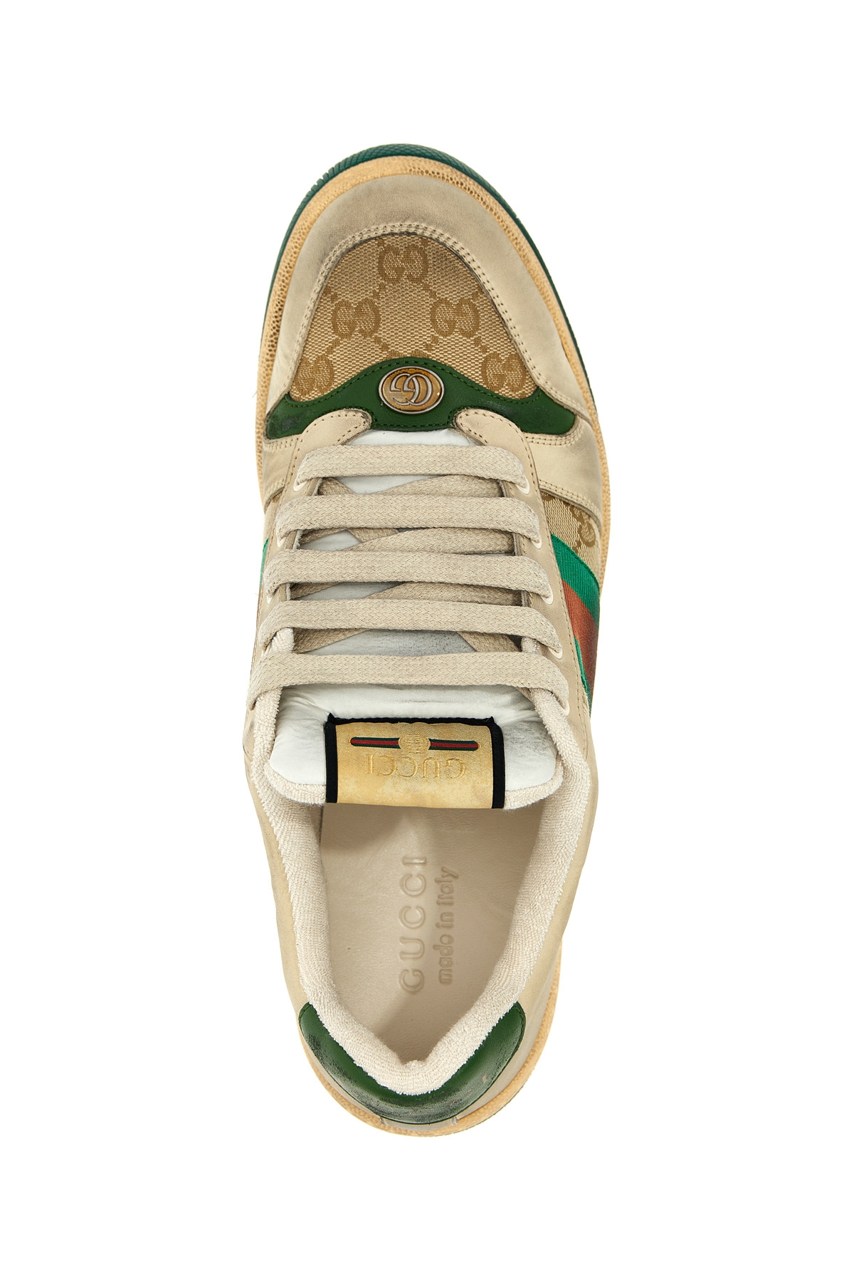 'Screener GG' sneakers in white leather and Original GG fabric, green and orange web ribbon in vintage-effect nylon, green leather details, treated for a vintage and worn effect, enamelled oval detail with Double G in metal, Gucci vintage logo label, two-tone rubber sole, laces. A pastiche of influences from different decades, Gucci shoes feature shapes and materials typical of retro sportswear. Inspired by the classic sneakers of the 70s.