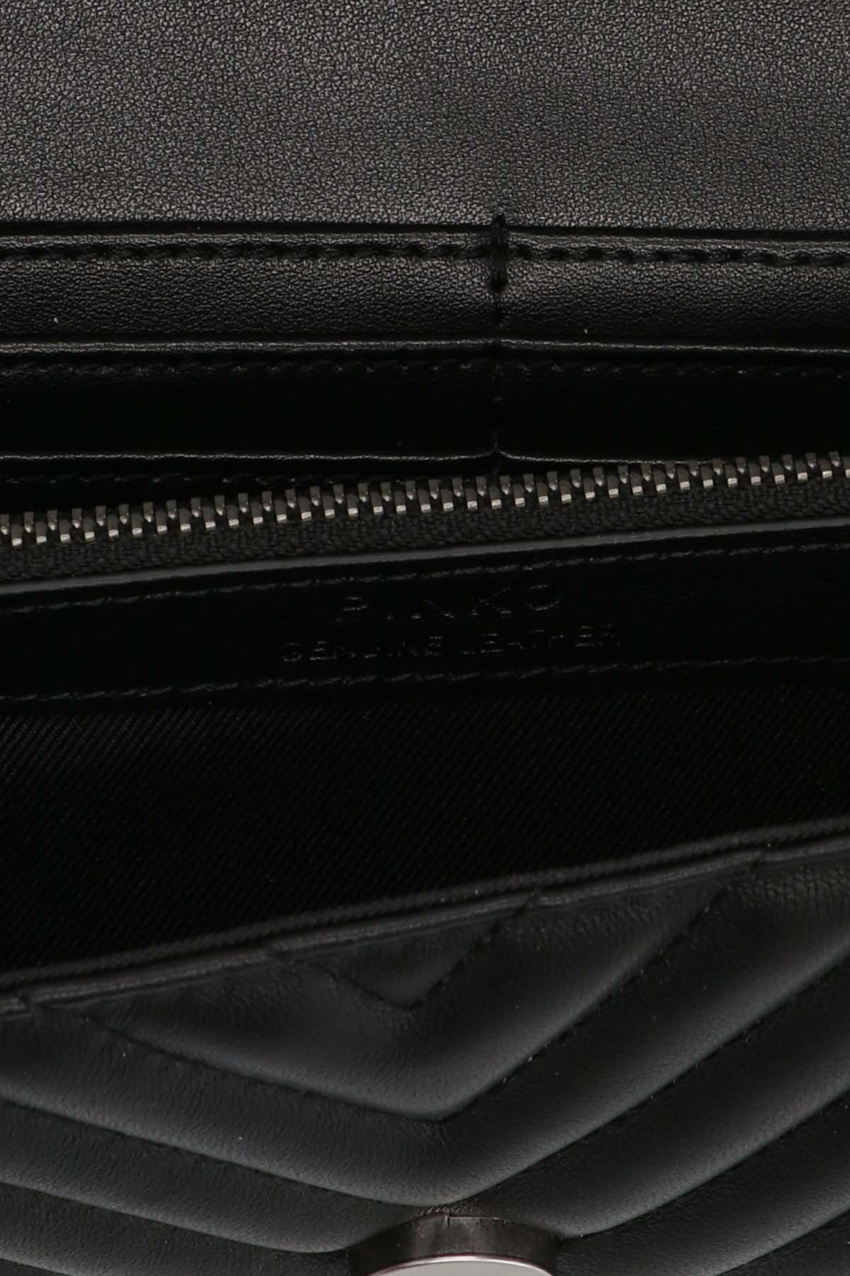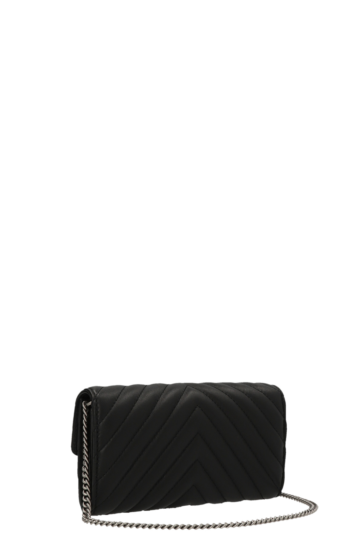 Love One' quilted leather wallet with front metal logo patch and a removable chain shoulder strap.