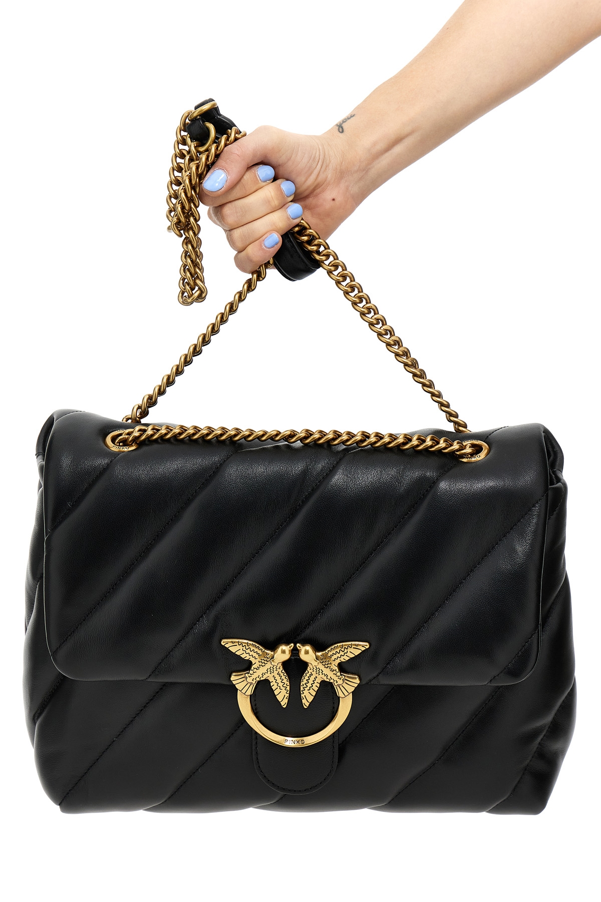 Love big puff' matelasse leather crossbody bag with metal hardware, a flap closure with metal logo.