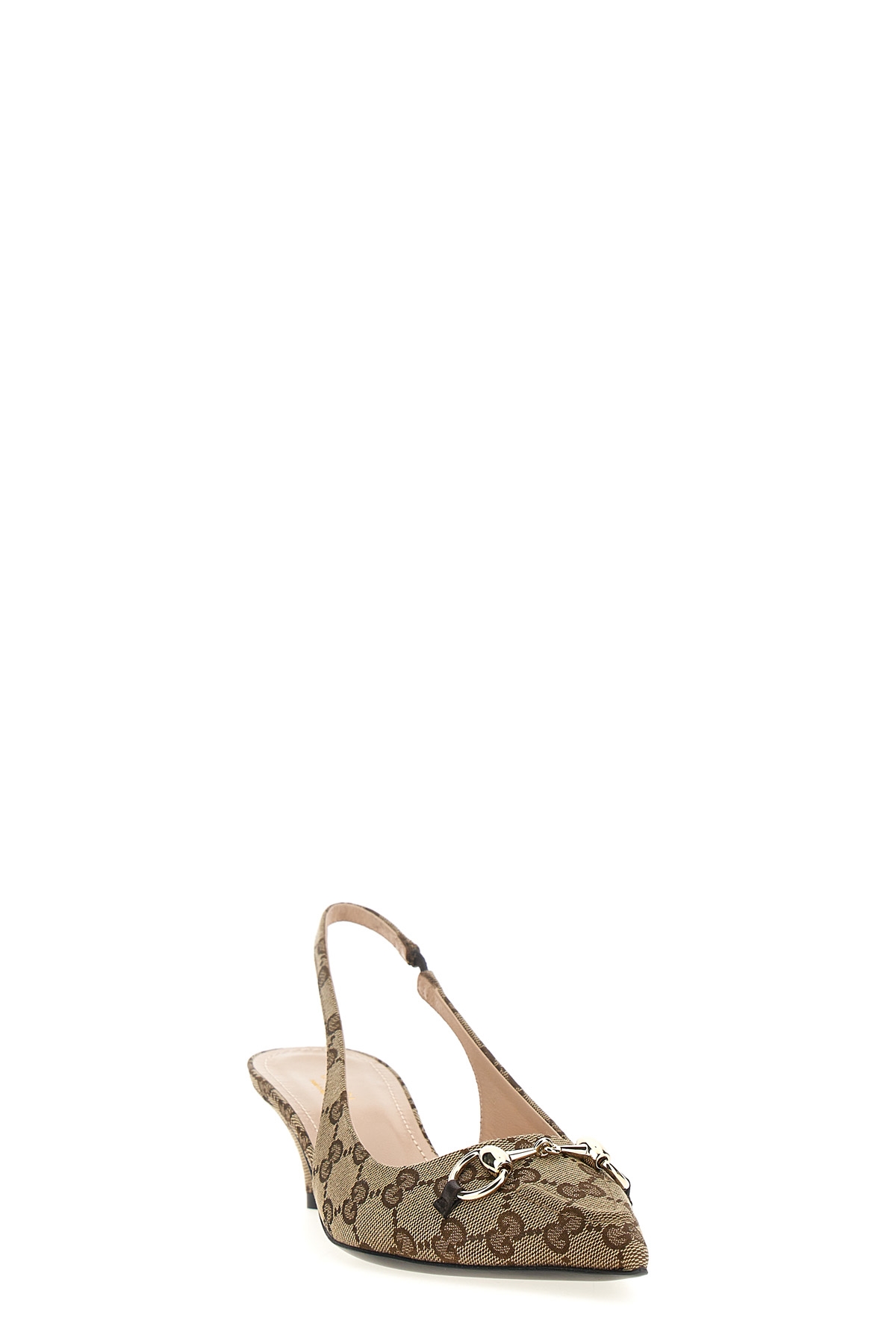 Original 'GG' fabric slingbacks, front clamp application, elastic strap, low heel.
