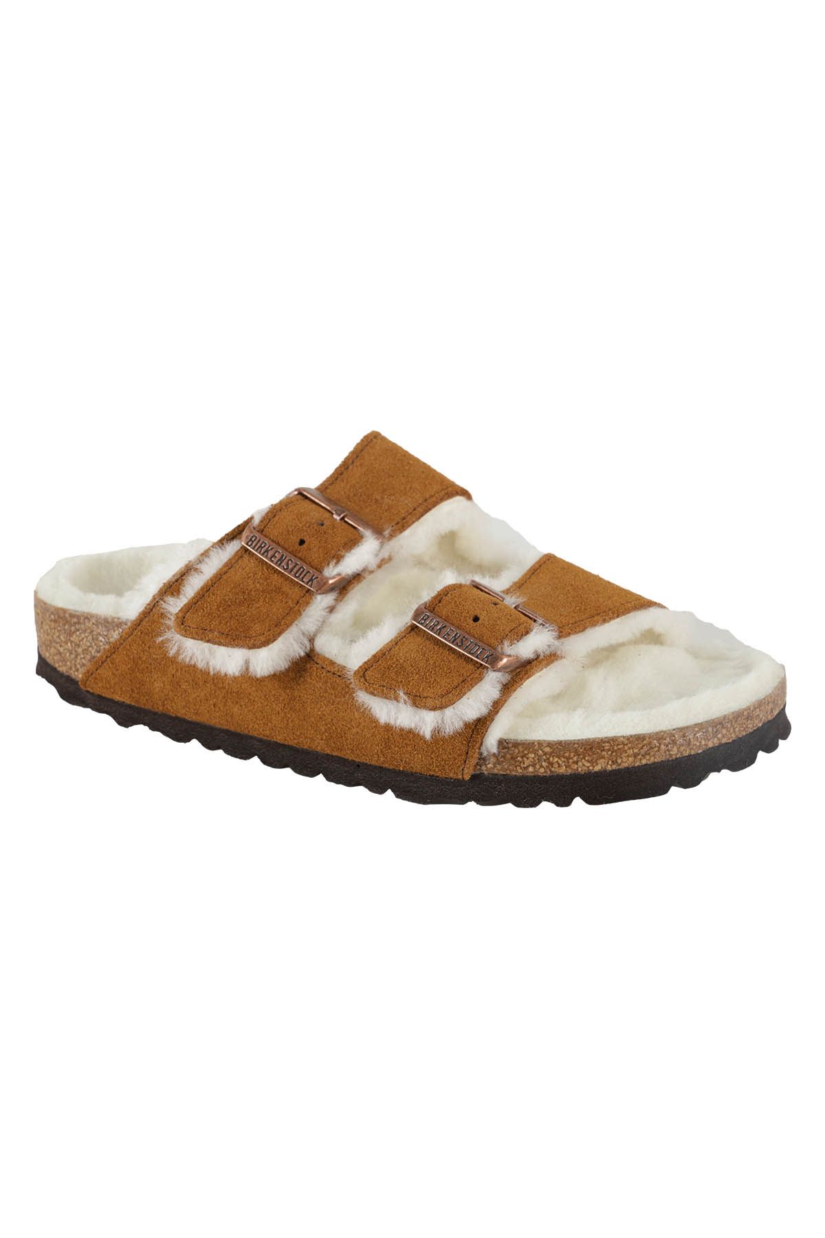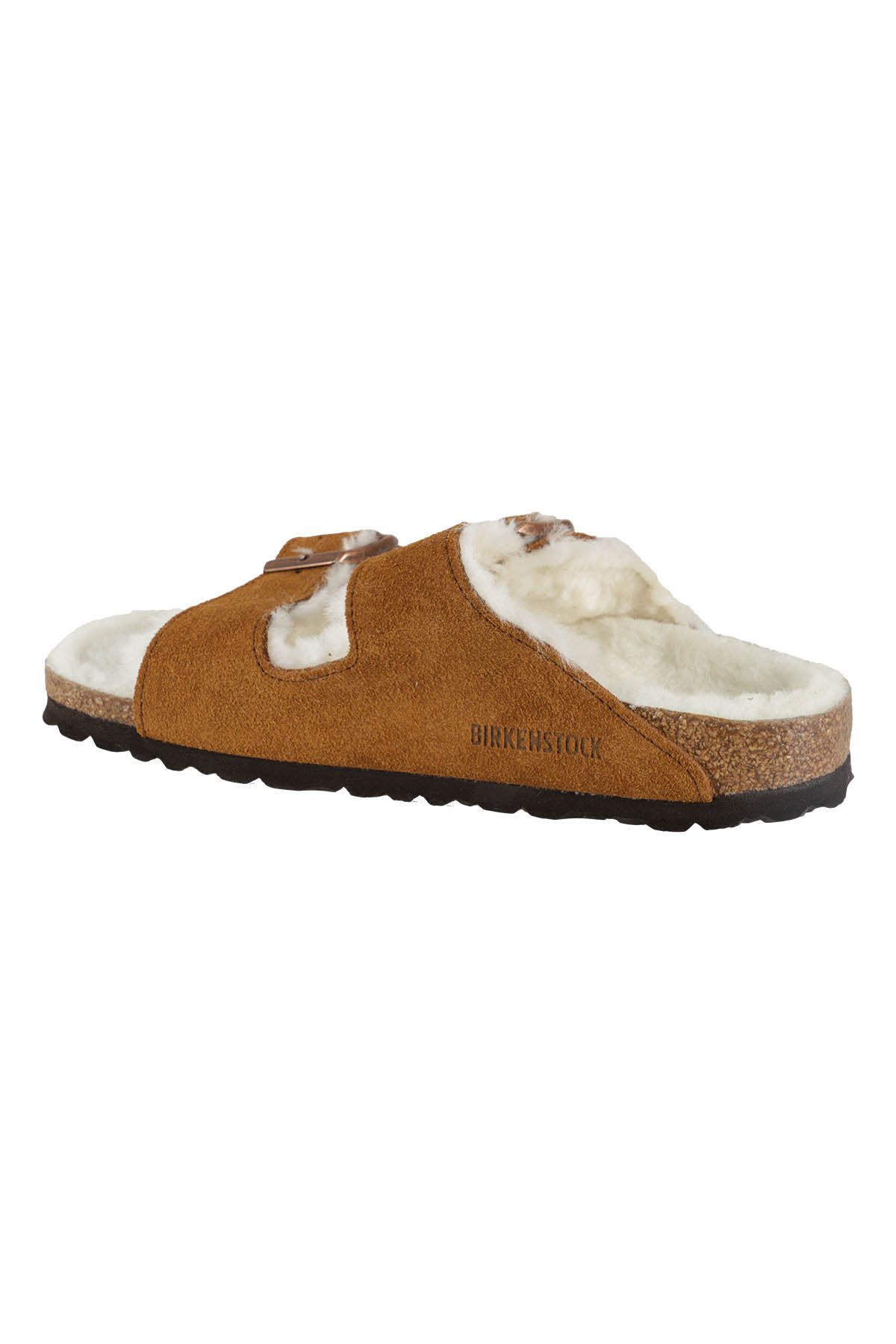 - Arizona Shearling Sandal - Birkenstock - Brown color - Suede upper with lamb fur lining - Lamb fur lining on straps - Cork footbed - Copper-colored metal buckle with logo