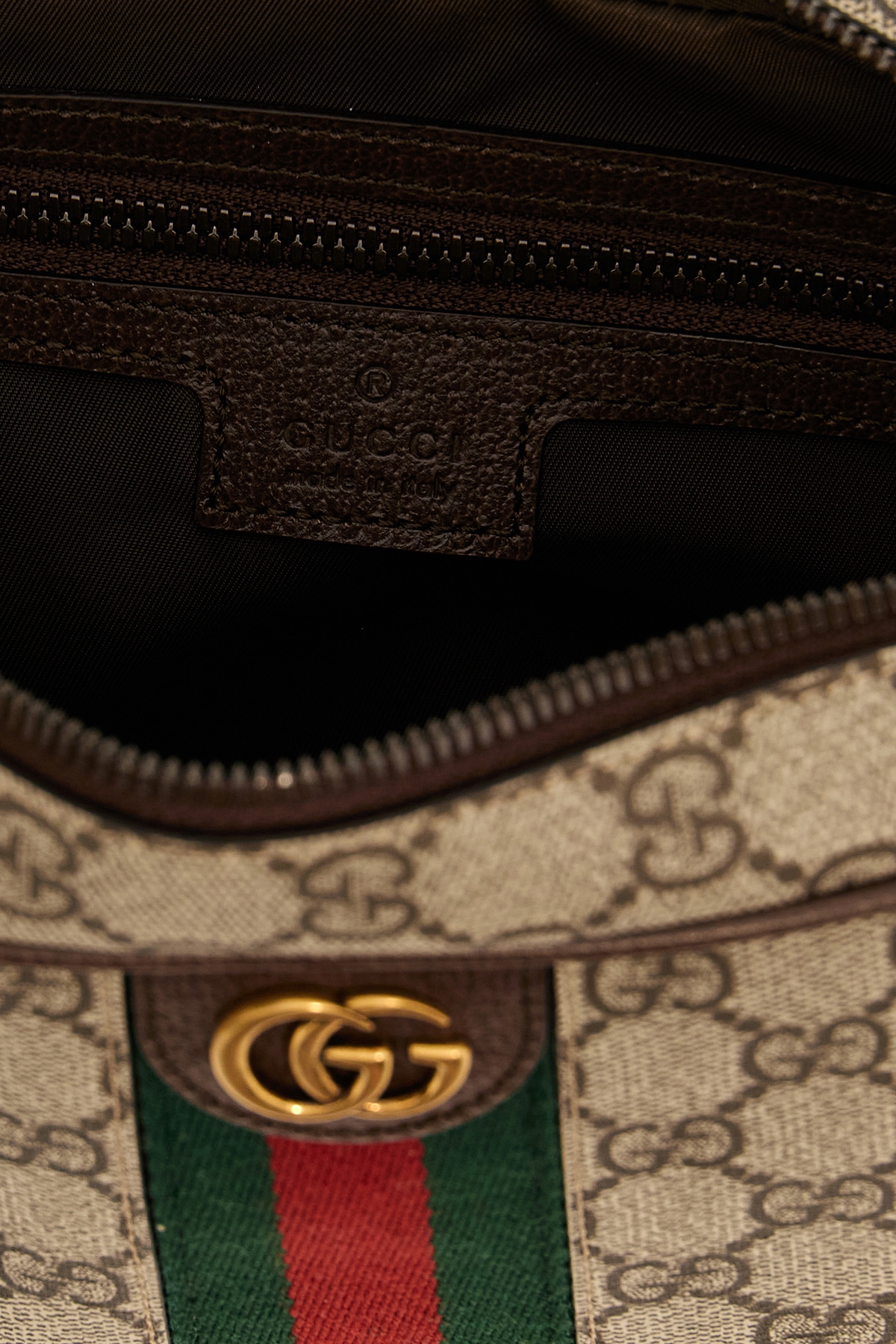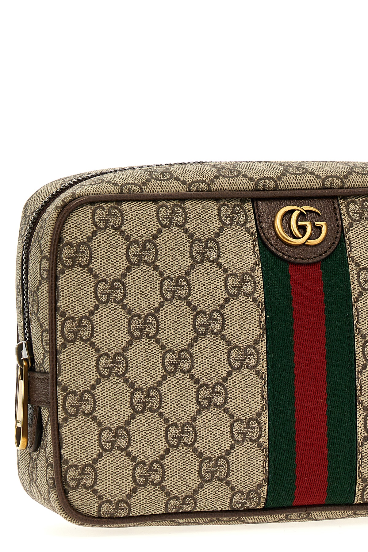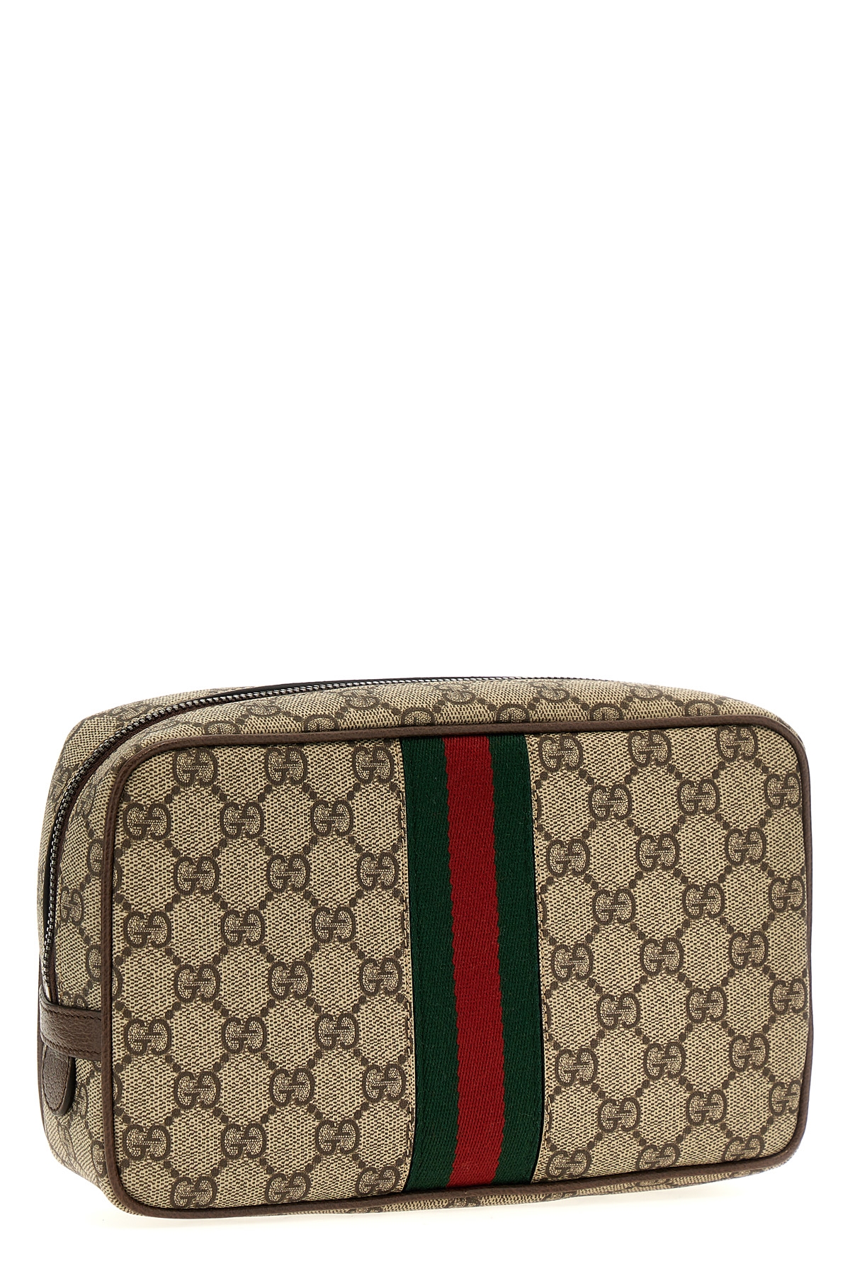 'Gucci Savoy' beauty in GG Supreme fabric with leather details, web ribbon, zip closure.