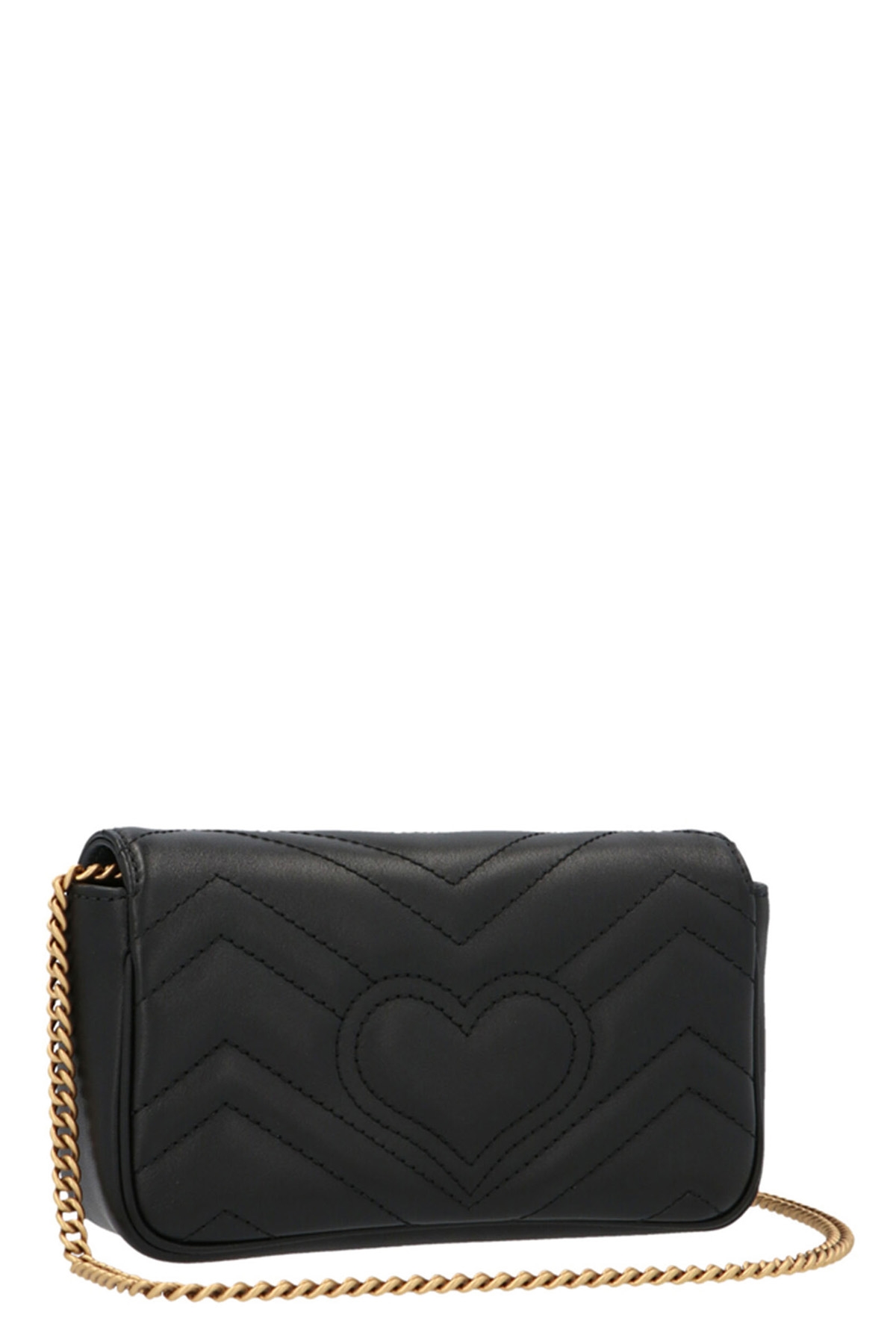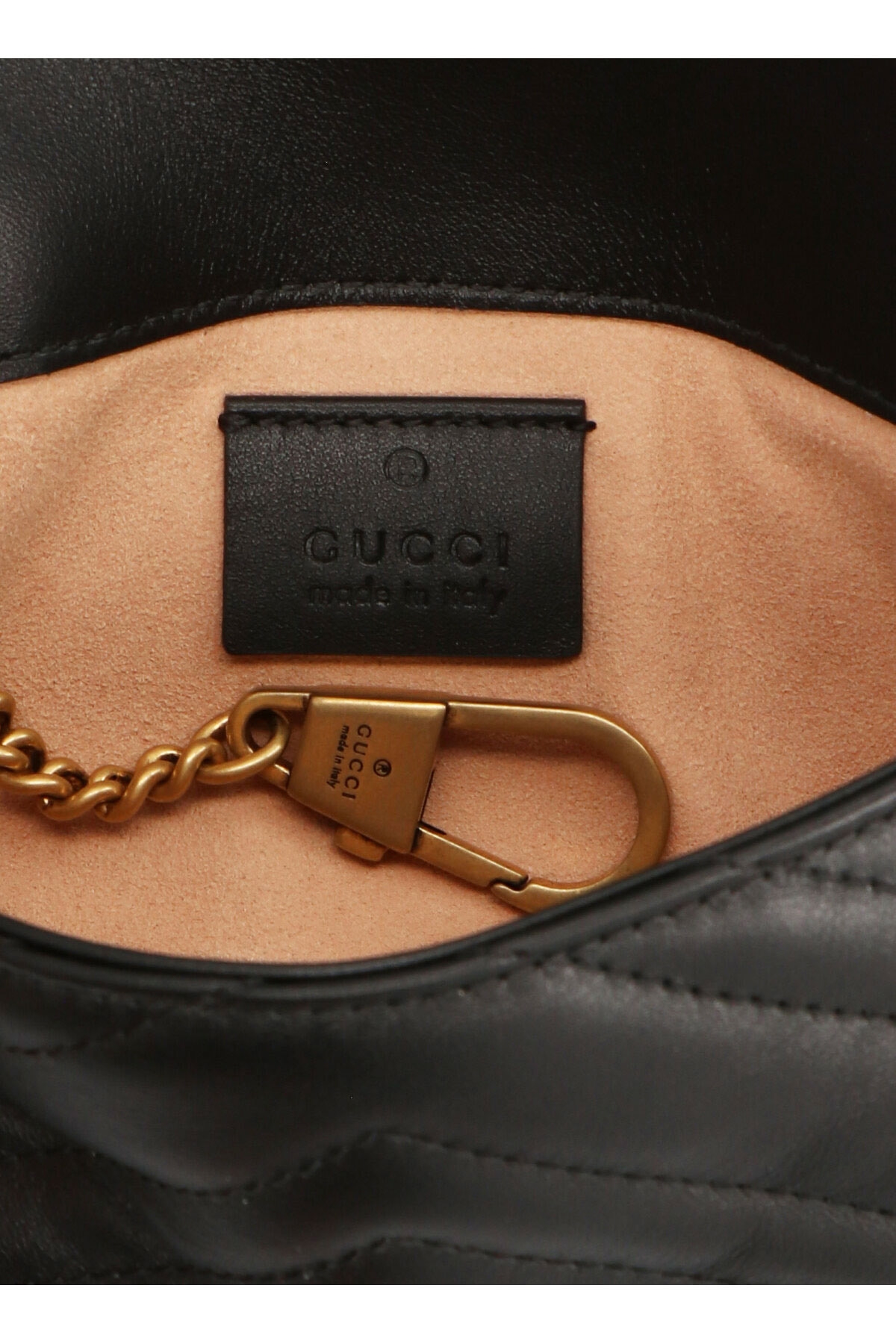 GG Marmont Mini crossbody bag in matelasse leather, magnetic flap closure with metal logo application, chain shoulder strap.