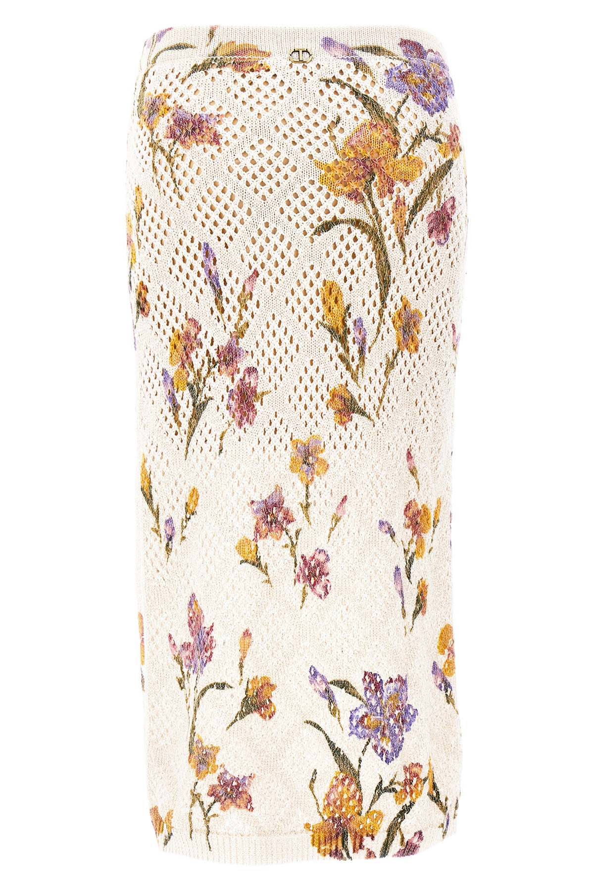 Longuette skirt in cotton blend with mesh and all-over ramage flower print, elastic waistband with applied metal logo, side split, removable underskirt.