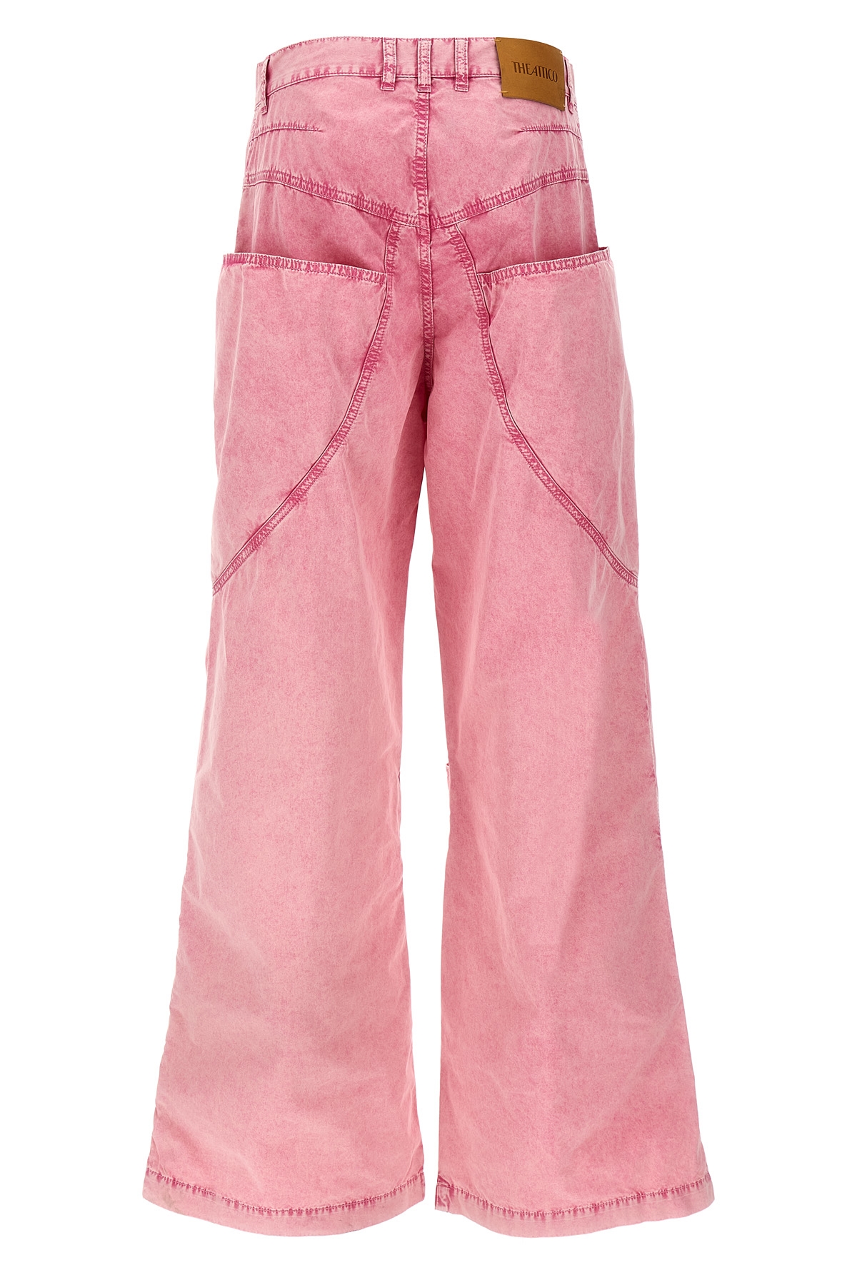 Muave washed cotton trousers, maxi pockets below the knee, zip and button closure, baggy style with wide leg, back leather logo tag, pockets.