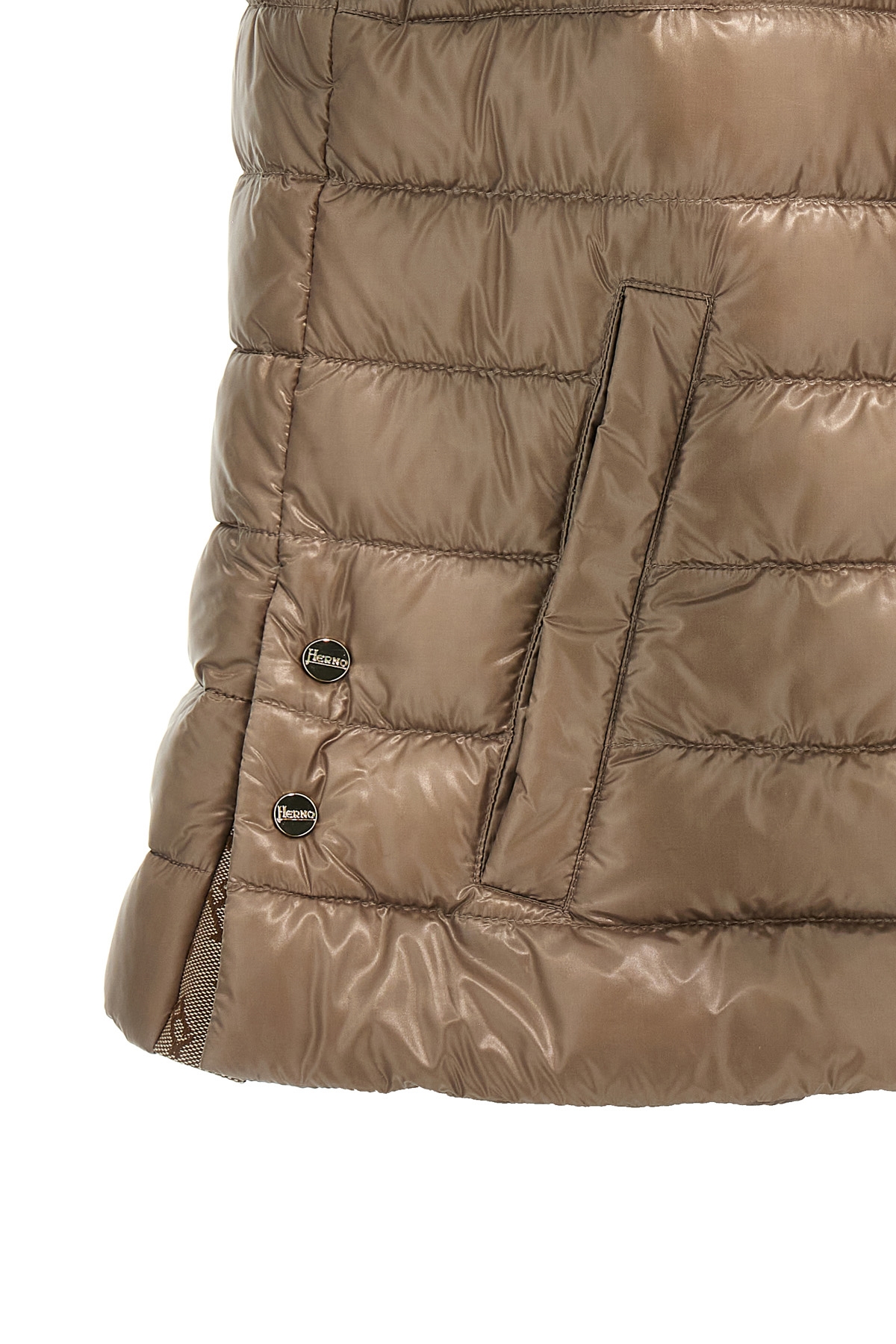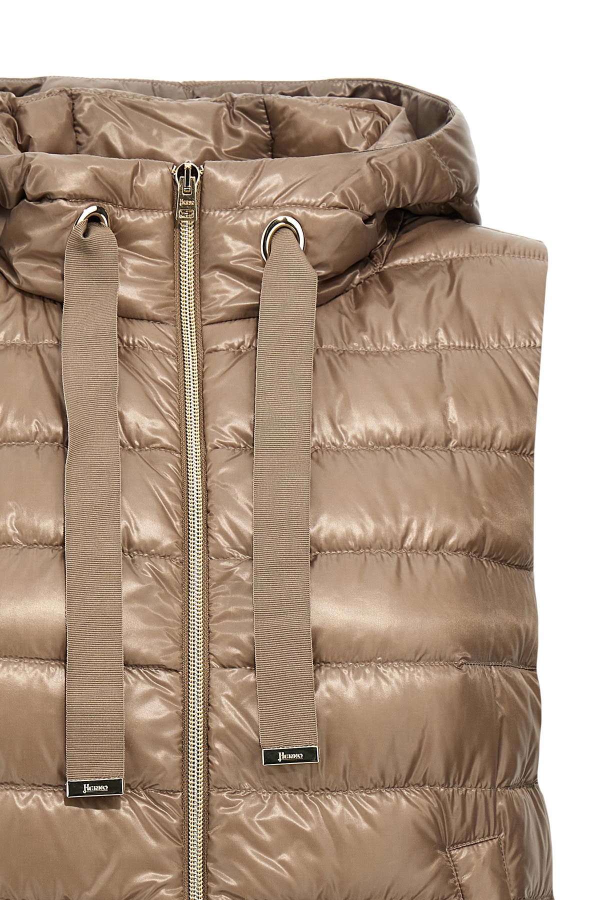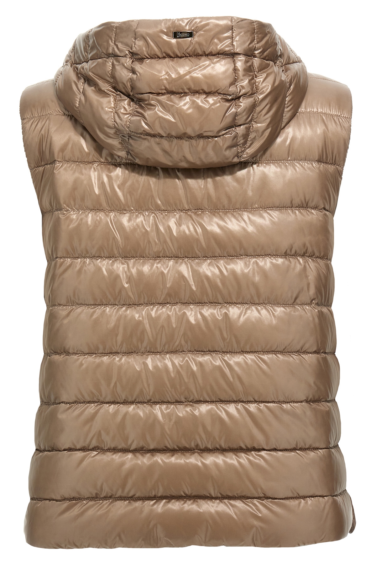 Ultralight nylon hooded vest with down padding, zip closure, pockets, side slits with snap button closure and logo grosgrain tape.