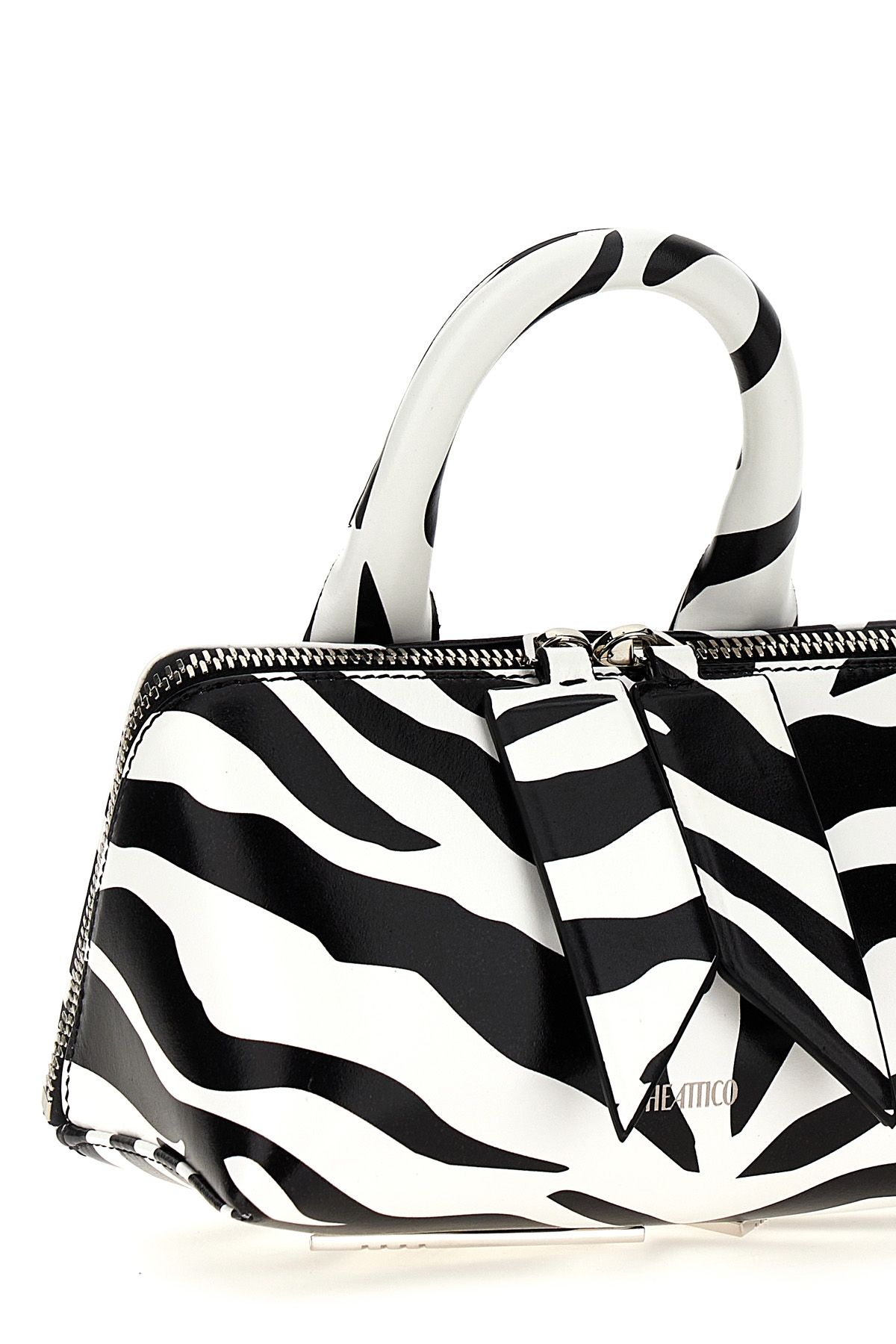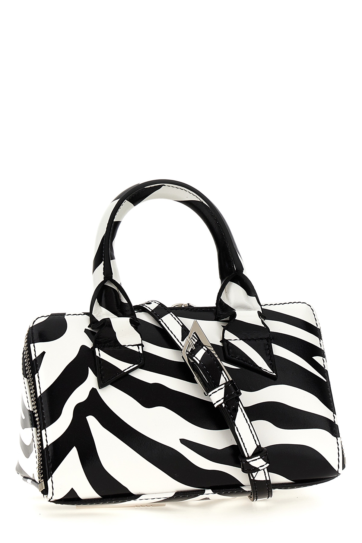 'Friday' mini zebra print leather handbag with top handle, zip closure, removable shoulder strap that can also be used as a belt, and front logo print.