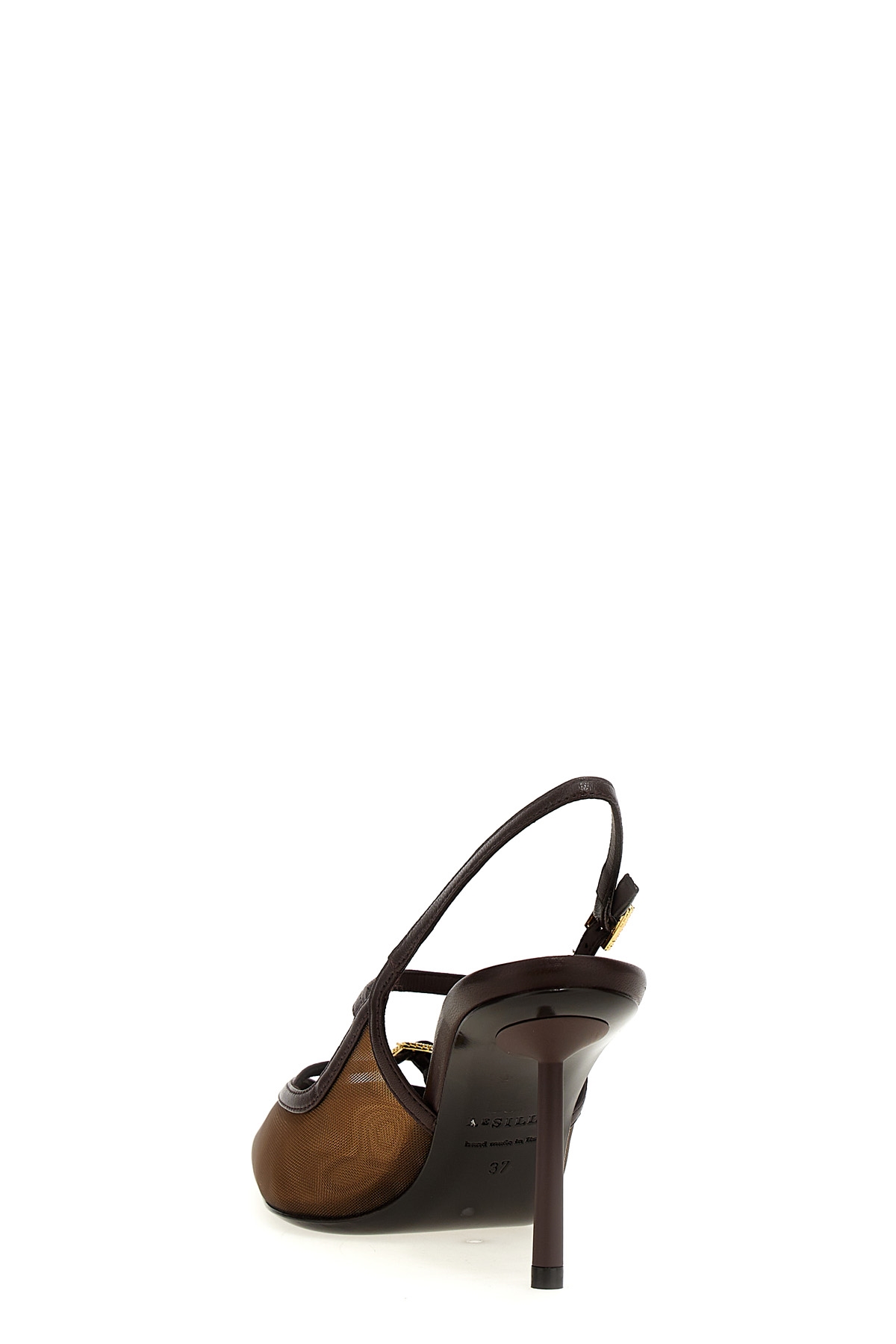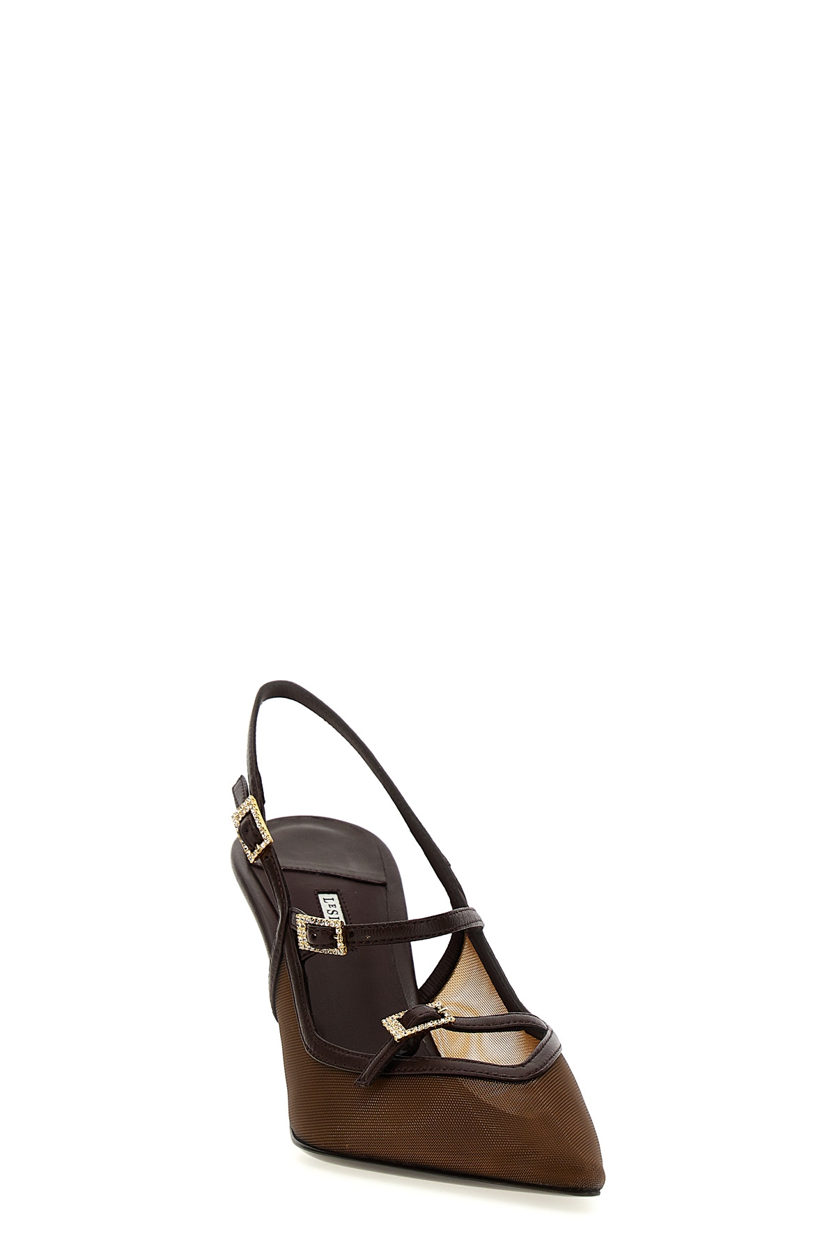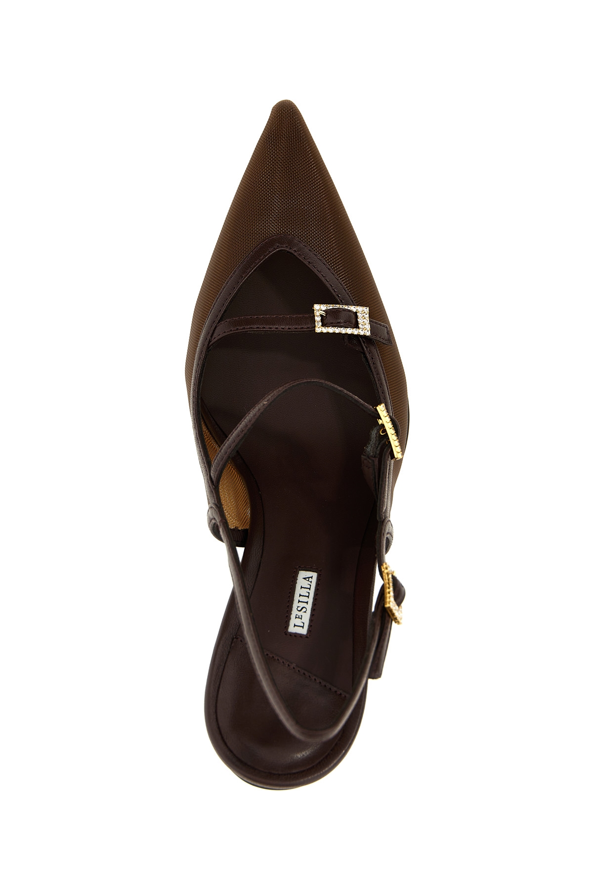 'Morgana' slingbacks in openwork fabric and leather, adjustable jewel buckle straps, heel, rubber sole.