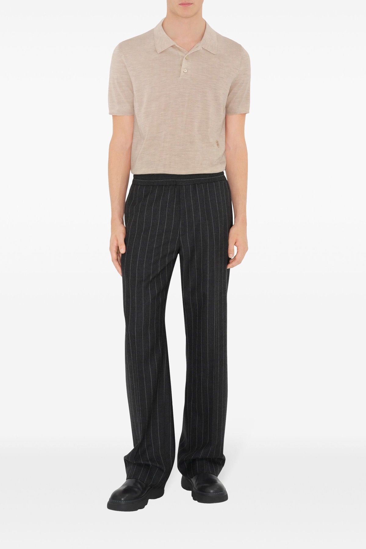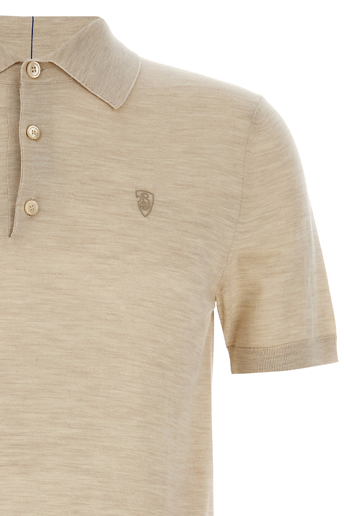 Wool polo shirt, front logo embroidery, collar and buttons, short sleeves, back detail with contrast embroidery and central split.
