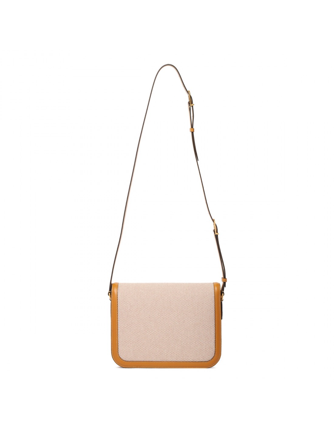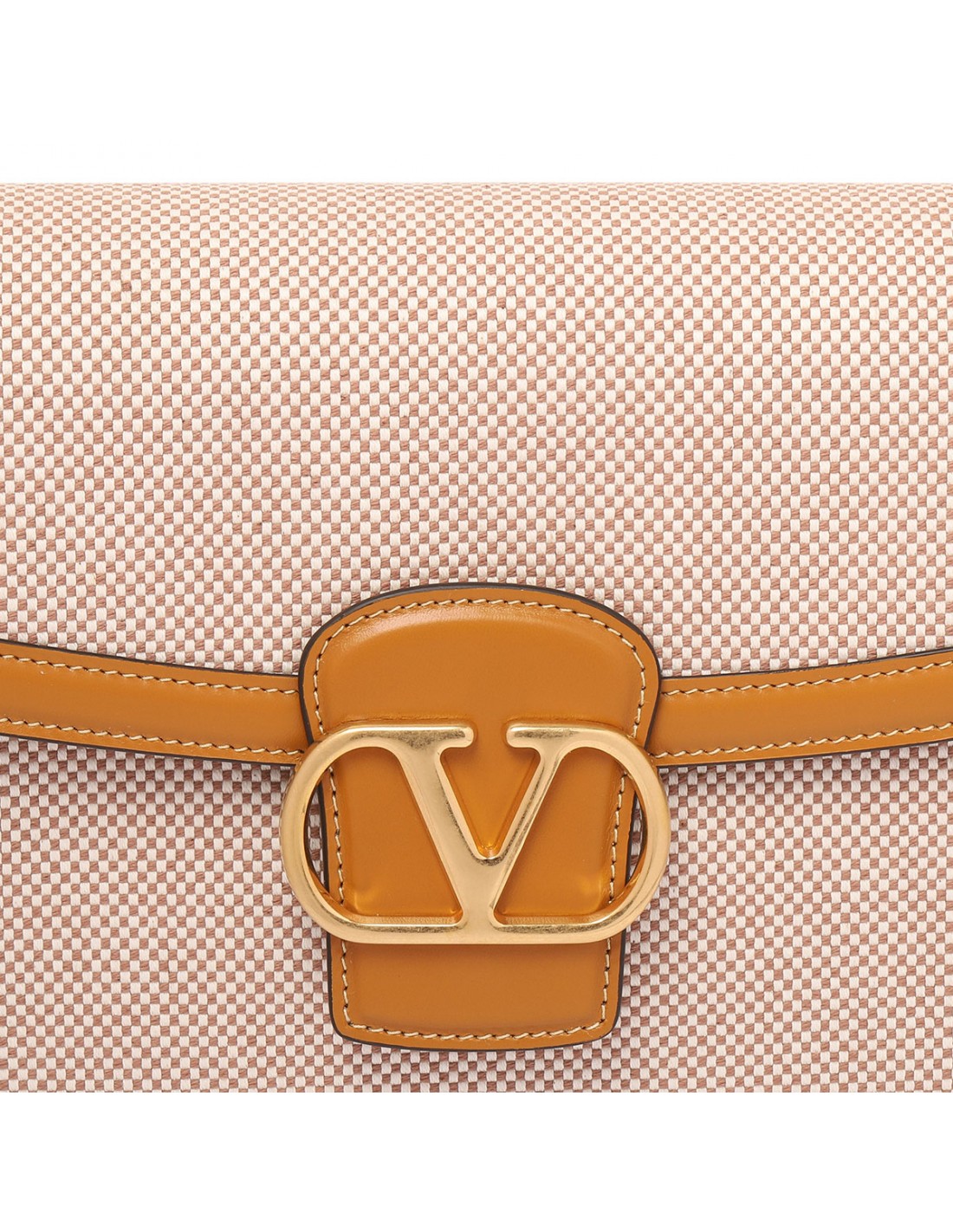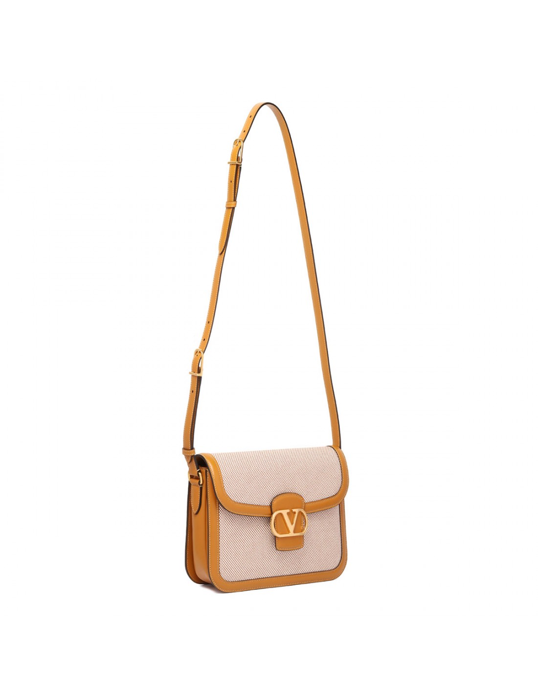 Natural canvas 9TO5 shoulder bag from Valentino Garavani featuring tobacco leather trims, magnetic closure with VLogo Signature fastening, adjustable leather shoulder strap, antique brass-finish hardware, nappa leather lining, internal three compartments, slip pocket with button.