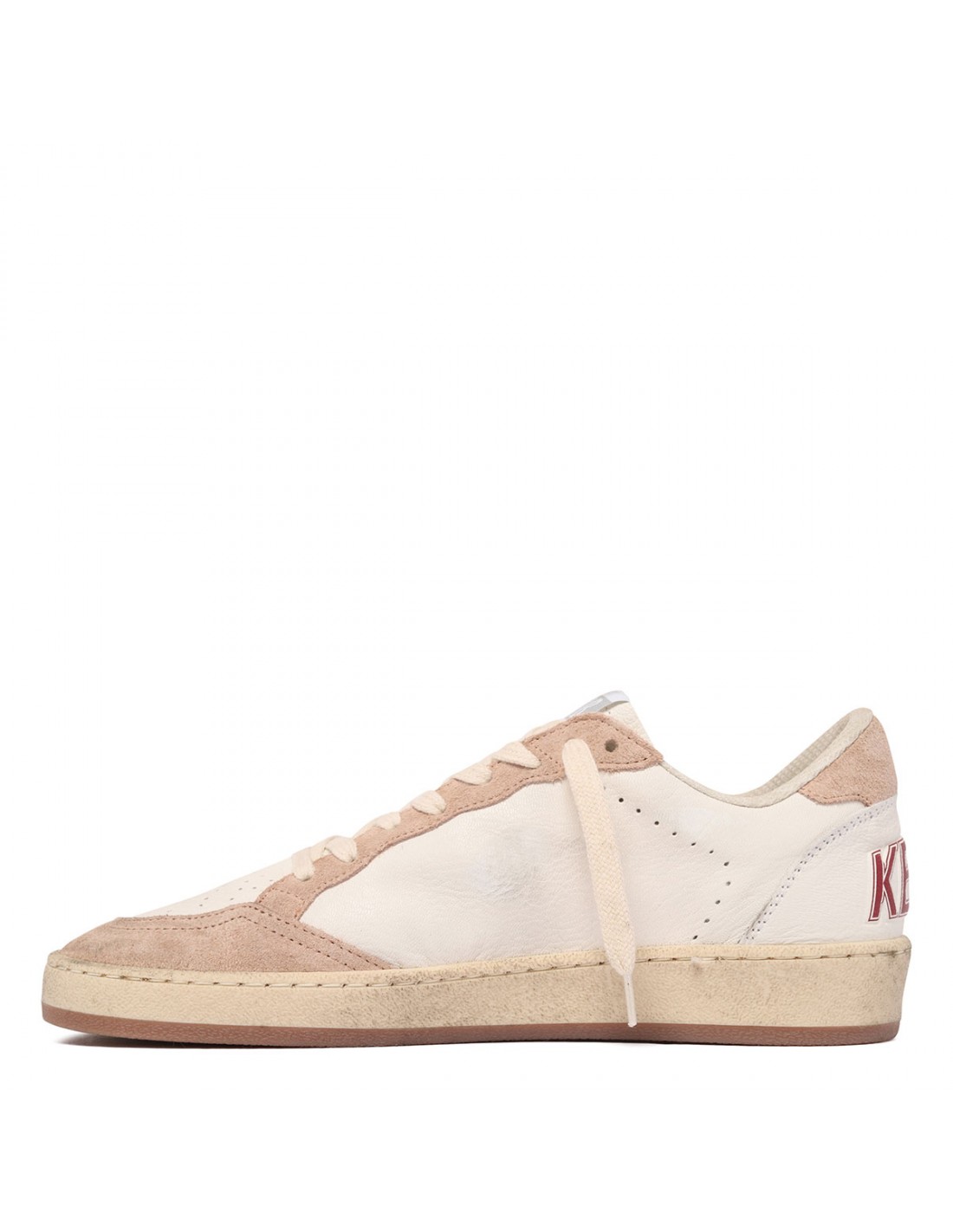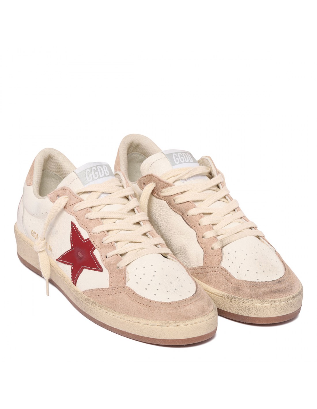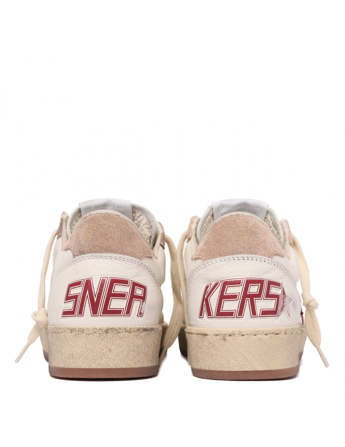 White leather BallStar sneakers from Golden Goose featuring red star on side, golden logo printed on side, pink suede heel tab and detail, vintage finish, round toe, lace-up closure, logo label on tongue, perforated toecap and rubber sole.