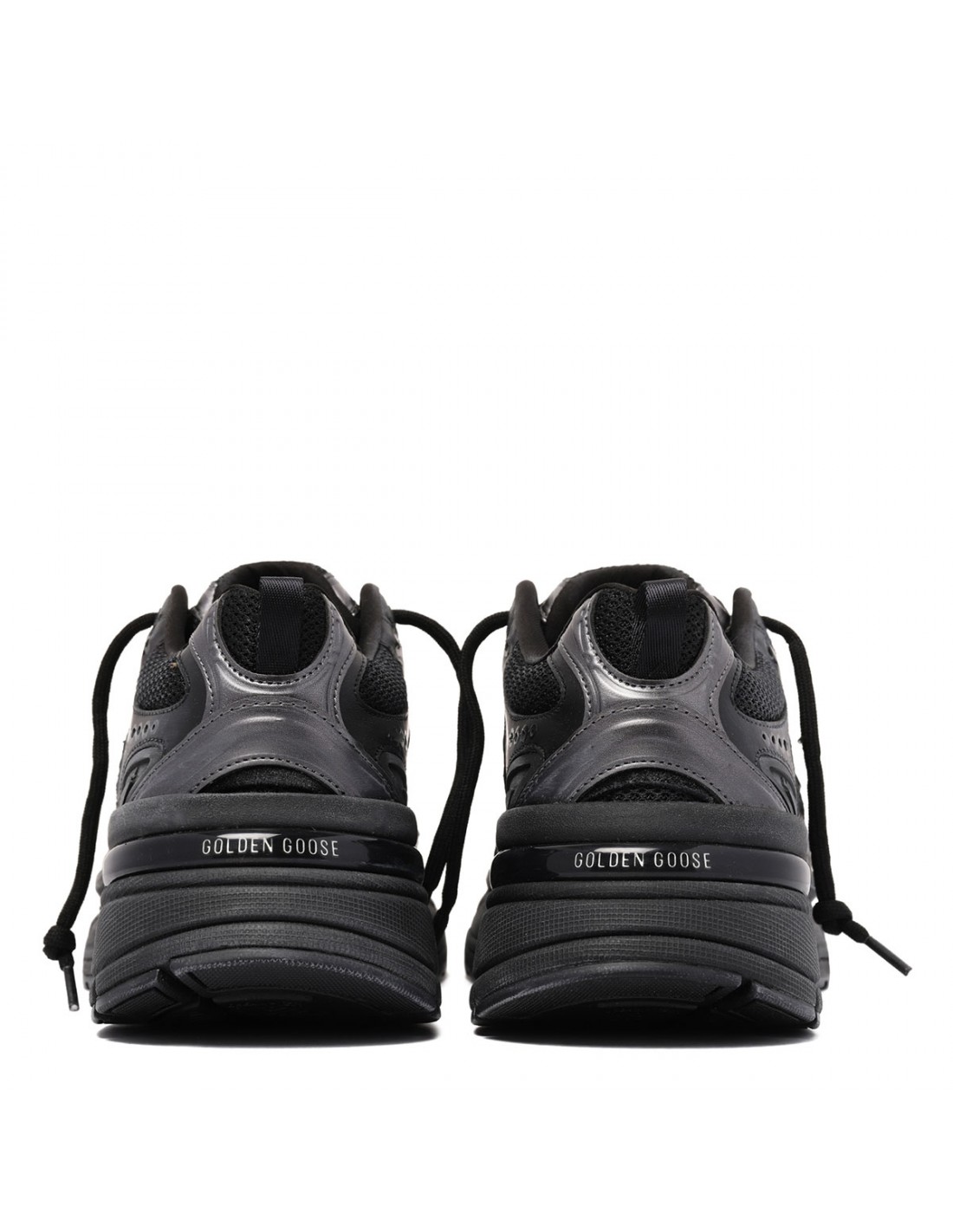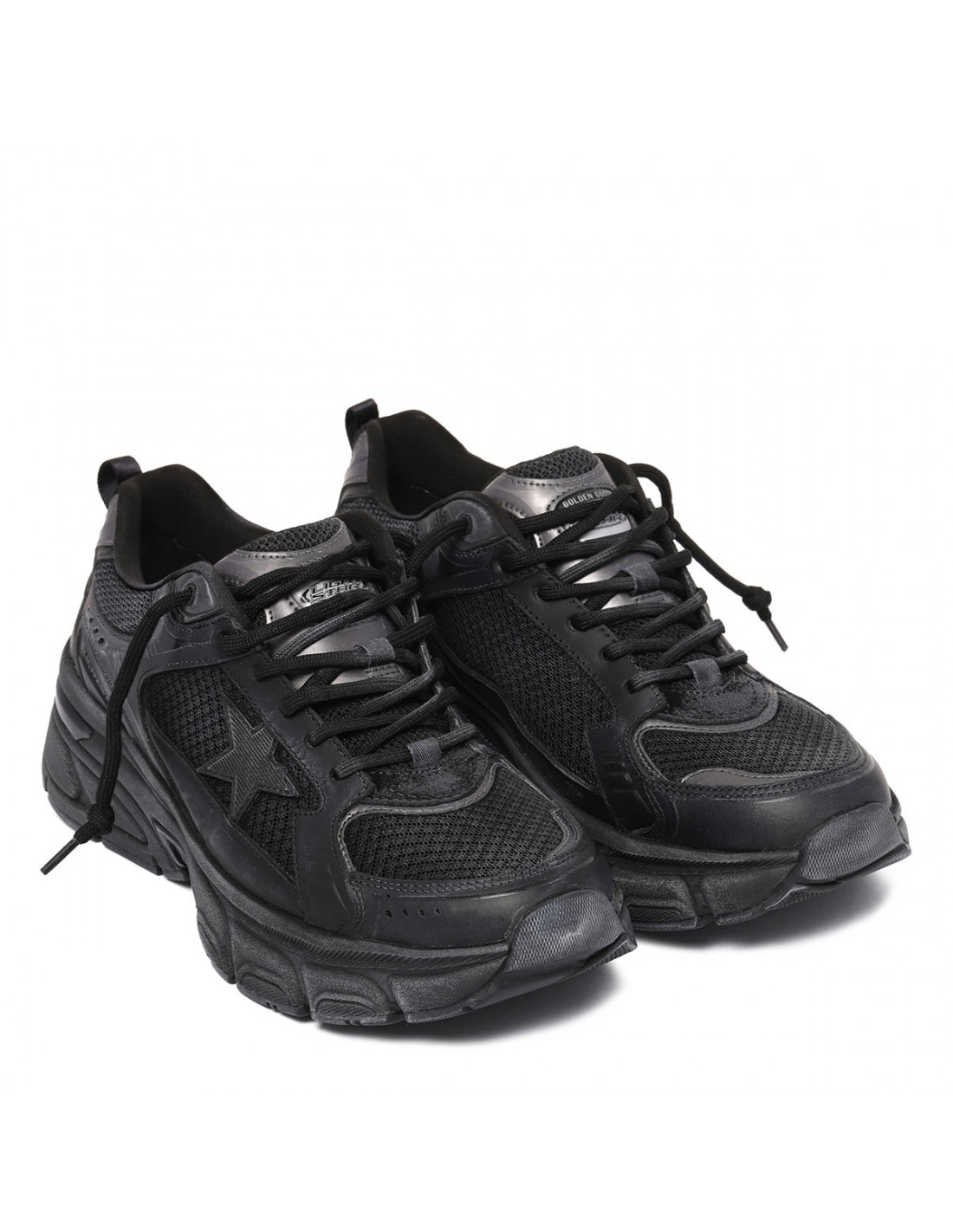 Black LightStar sneakers from Golden Goose featuring leather and mesh upper, black TPU star and heel tab, TPU inserts, lived-in finish, round toe, black tube laces fastening, "Lightstar" insole, logo label on tongue, logo on the heel, rubber sole.
