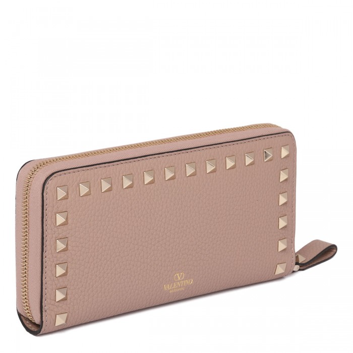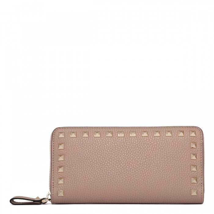 Powder pink grained leather Rockstud zip around wallet from Valentino Garavani featuring zip fastening, platinum-finish studs, three fold-out compartments divided by a zipped coin pocket and a flat pocket, twelve card slots and two flat pockets.