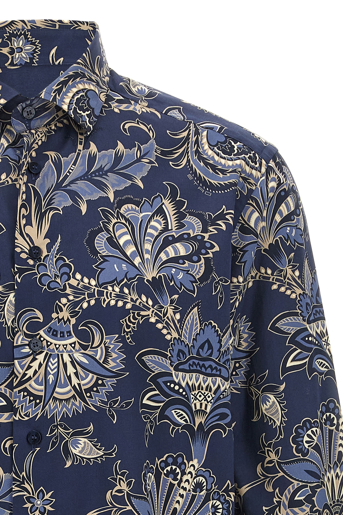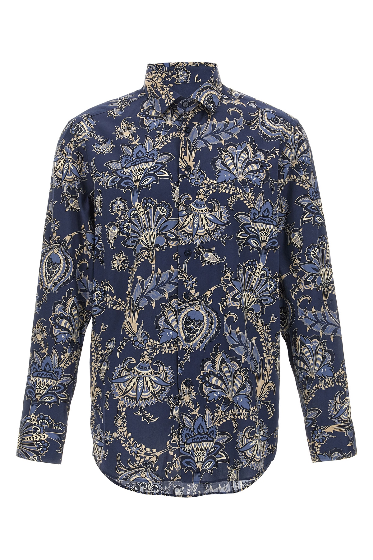 All-over maxi flower print cotton shirt, button closure, long cuffed sleeves.