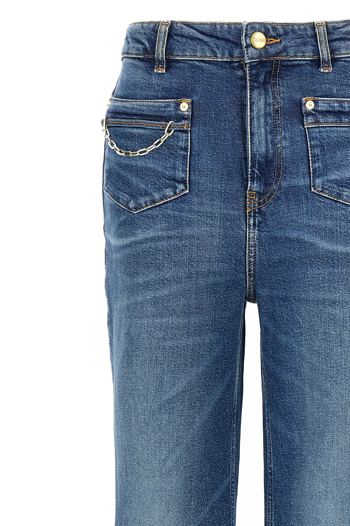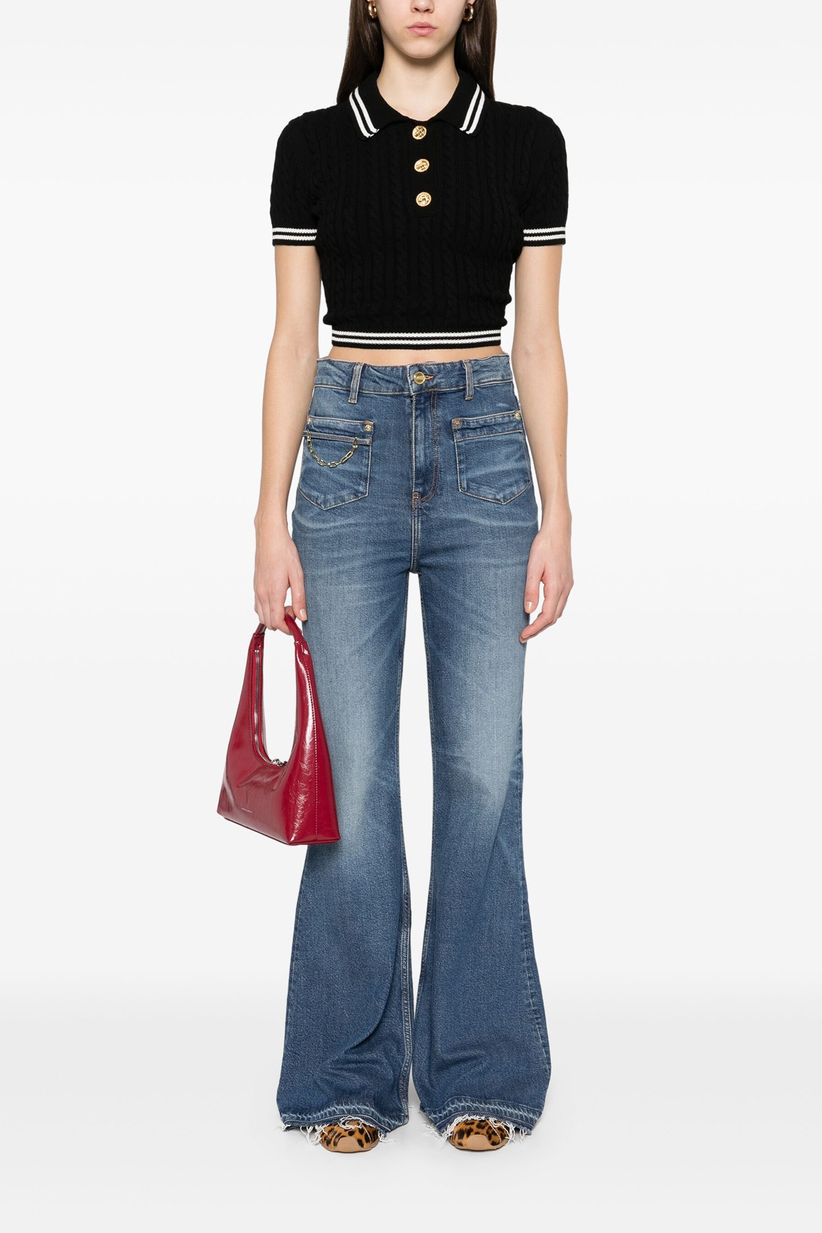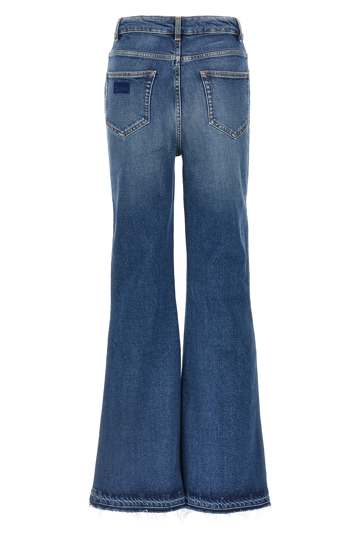 High-waisted 'Goddi' jeans in delave cotton denim with flared leg, zip and button closure, pockets, metal details, back logo patch, raw cut leg bottoms.