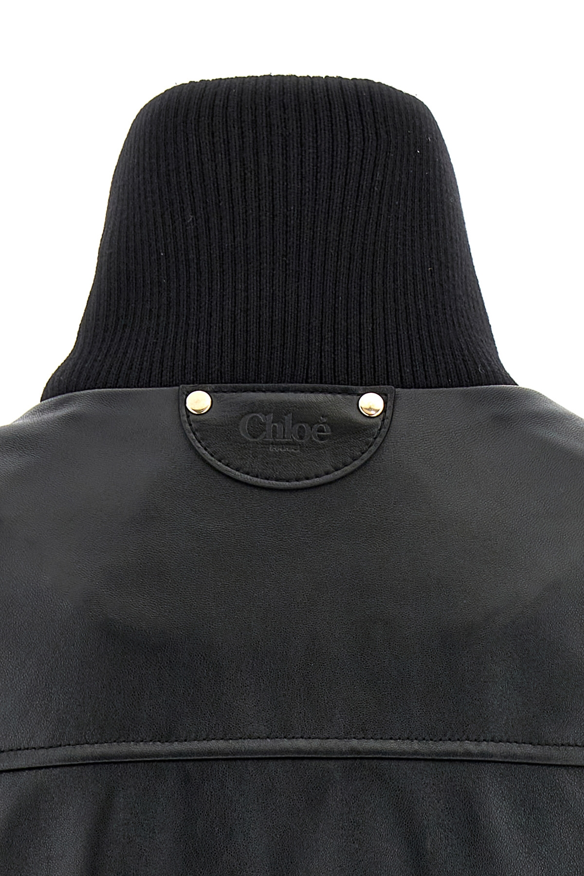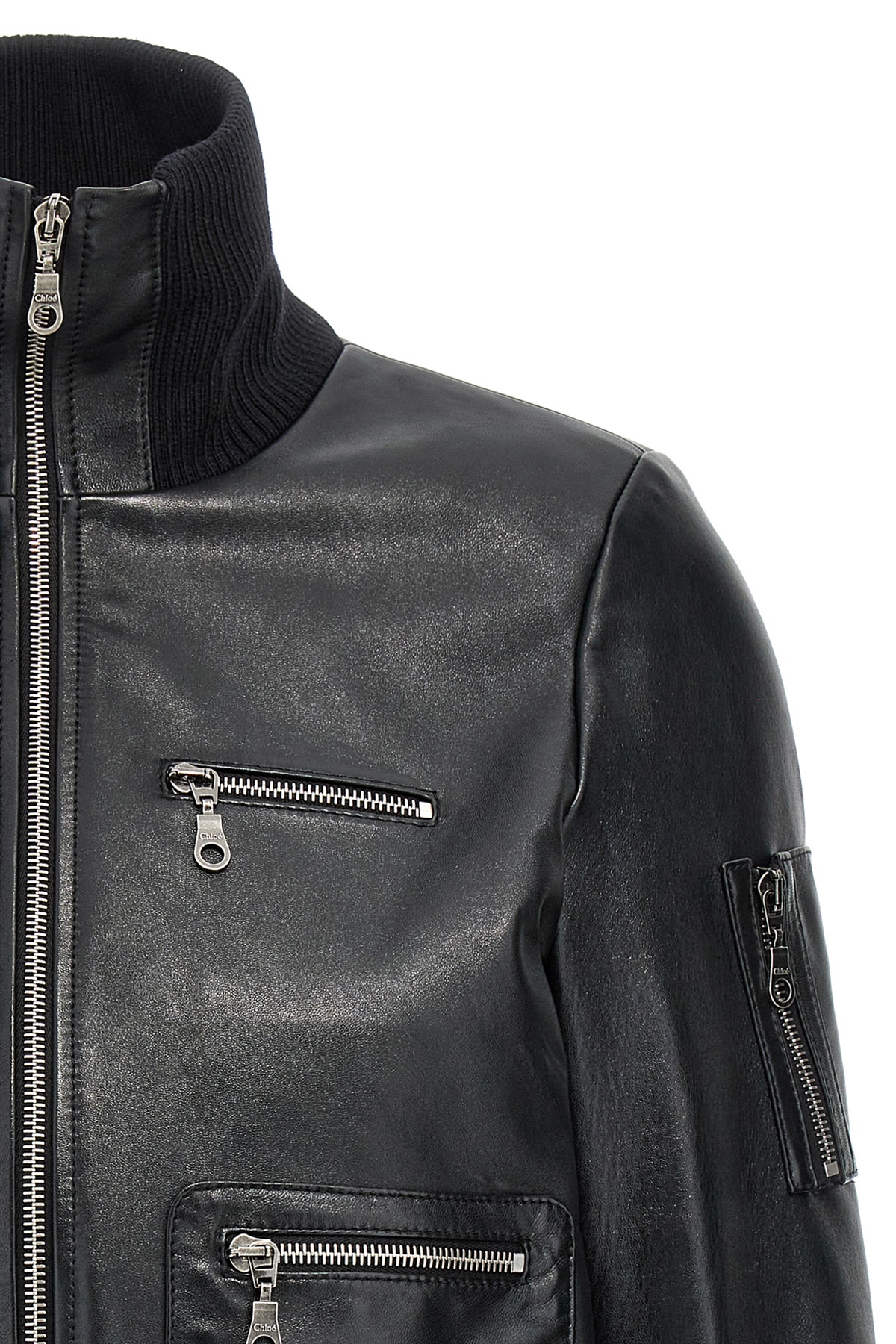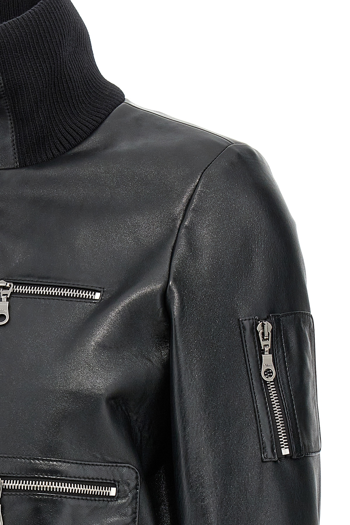 Leather bomber jacket with ribbed knit details, high neck, zip closure, pockets, long cuffed sleeves, tone-on-tone logo patch at the back.