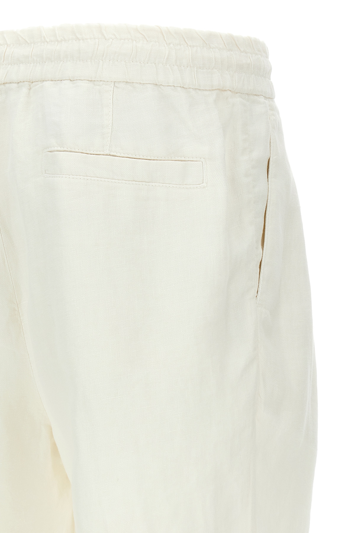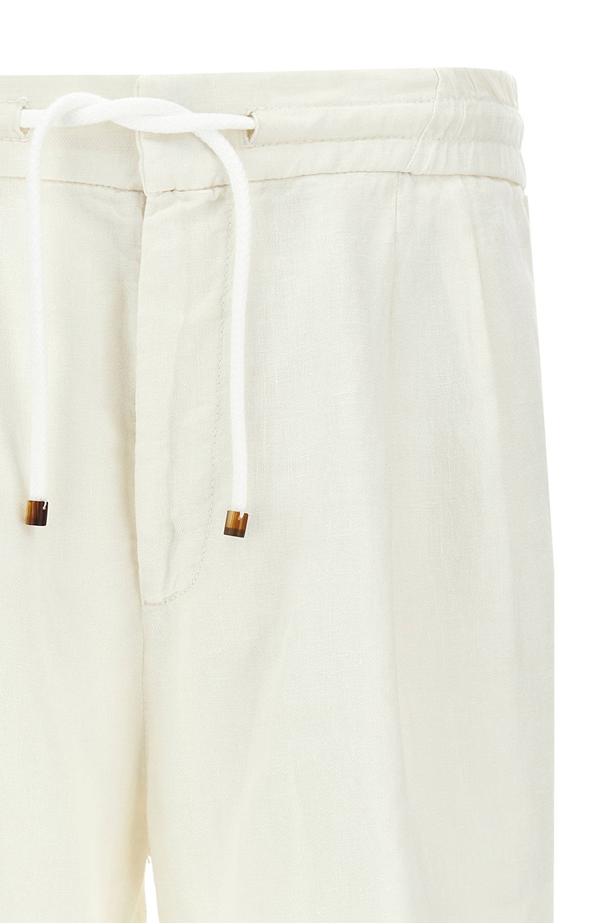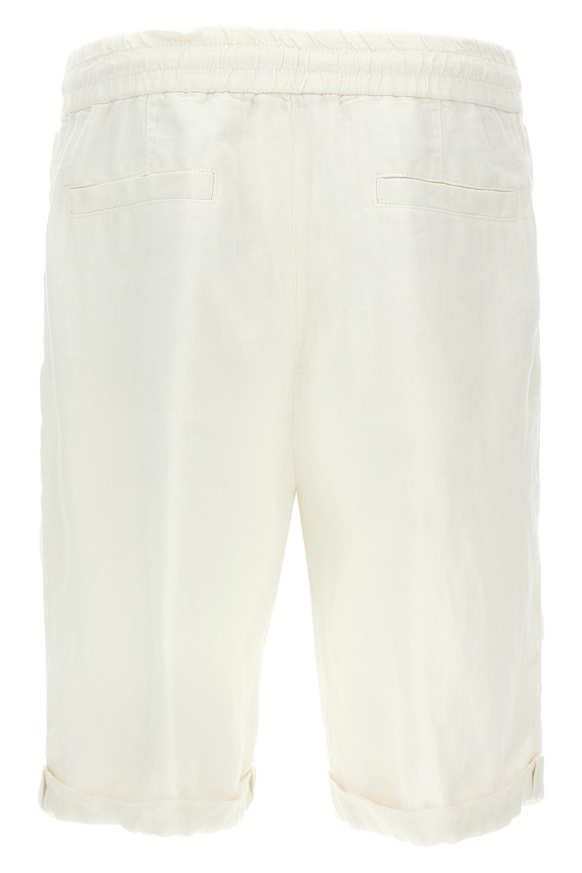 Garment-dyed linen bermuda shorts, pins, hook and button zip closure, adjustable drawstring elastic waistband, pockets, turn-up hem.