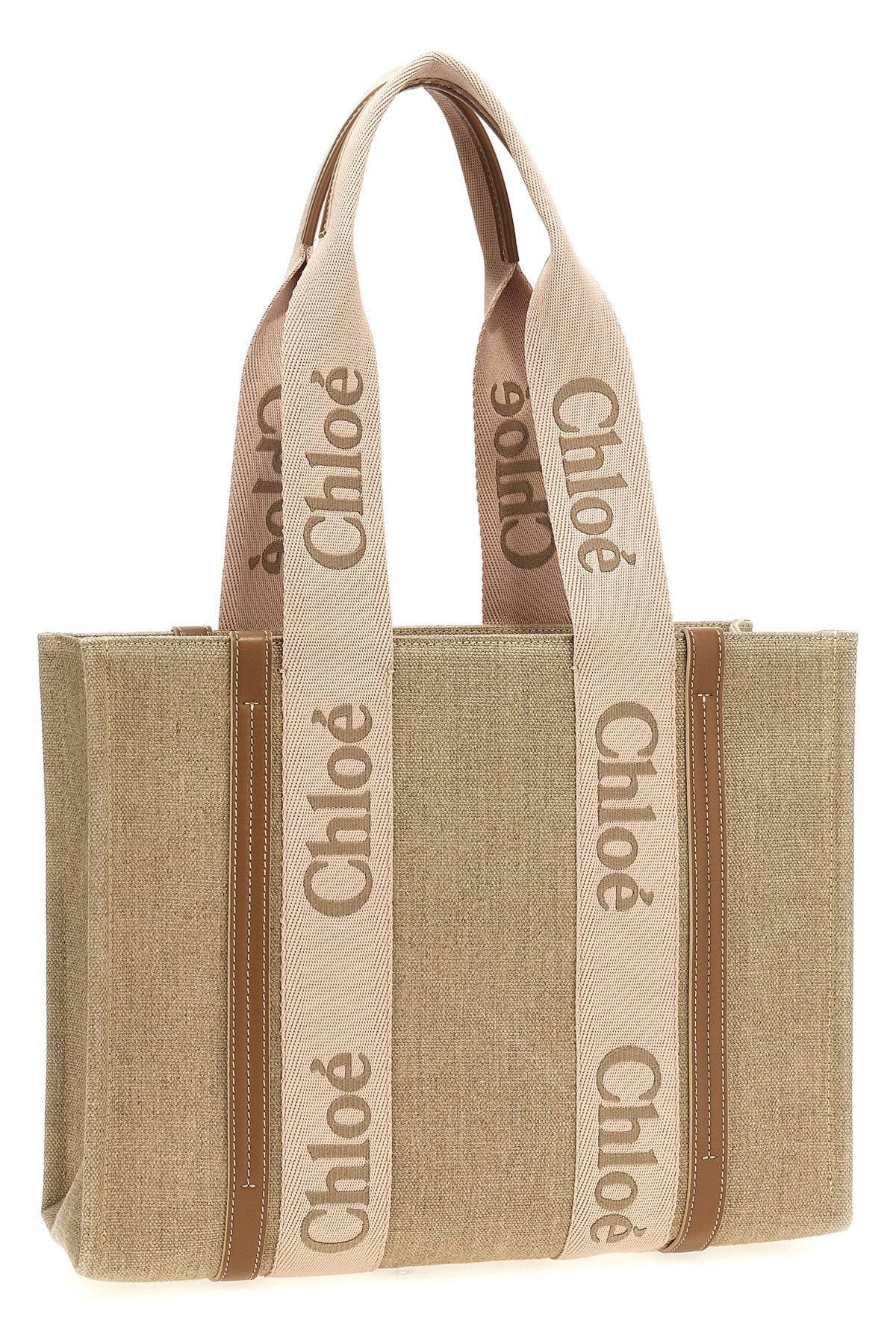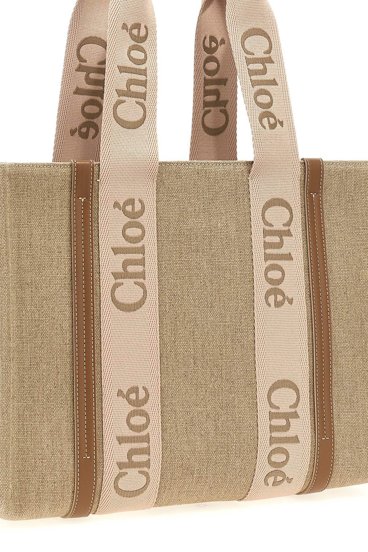'Woody Medium' canvas shopping bag with leather details, logo handles.