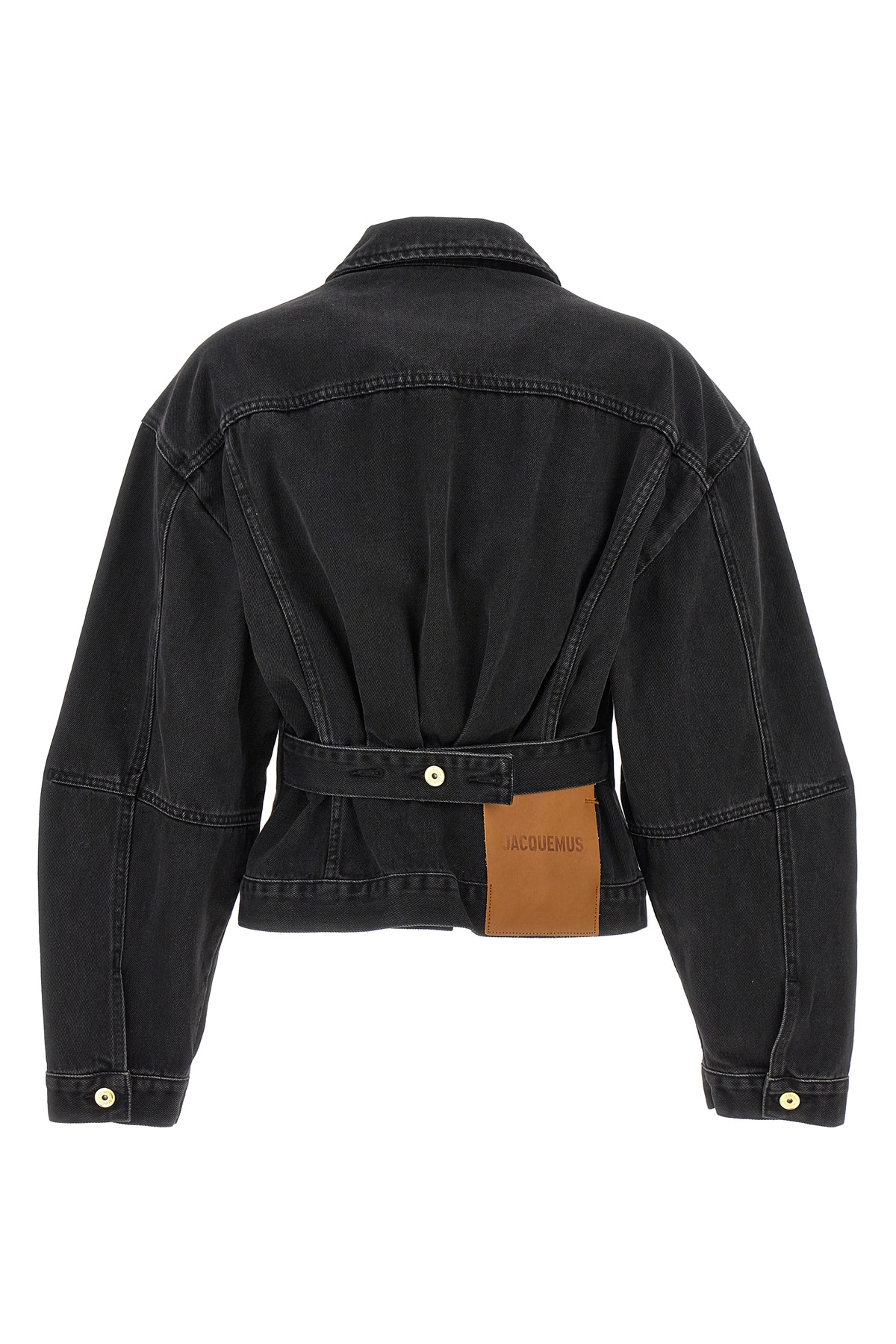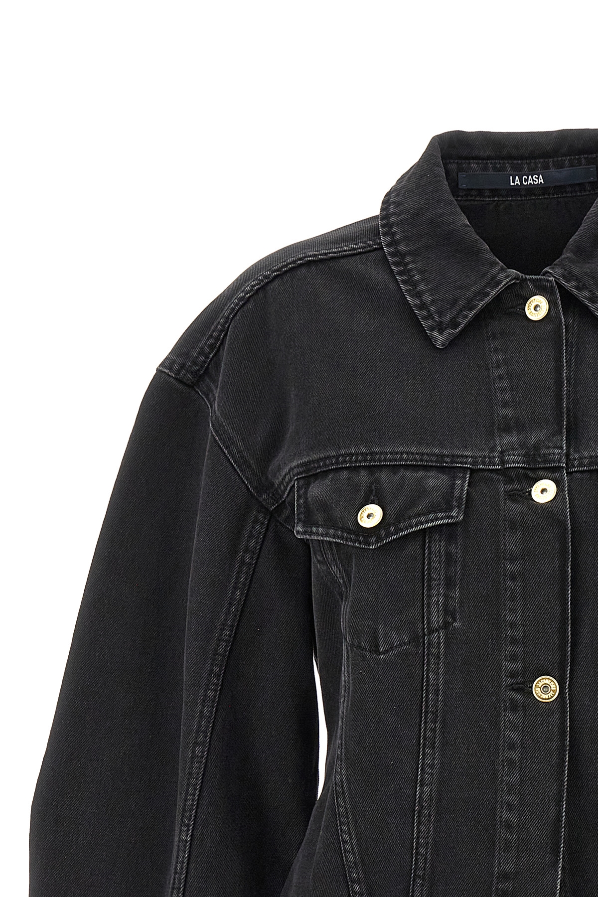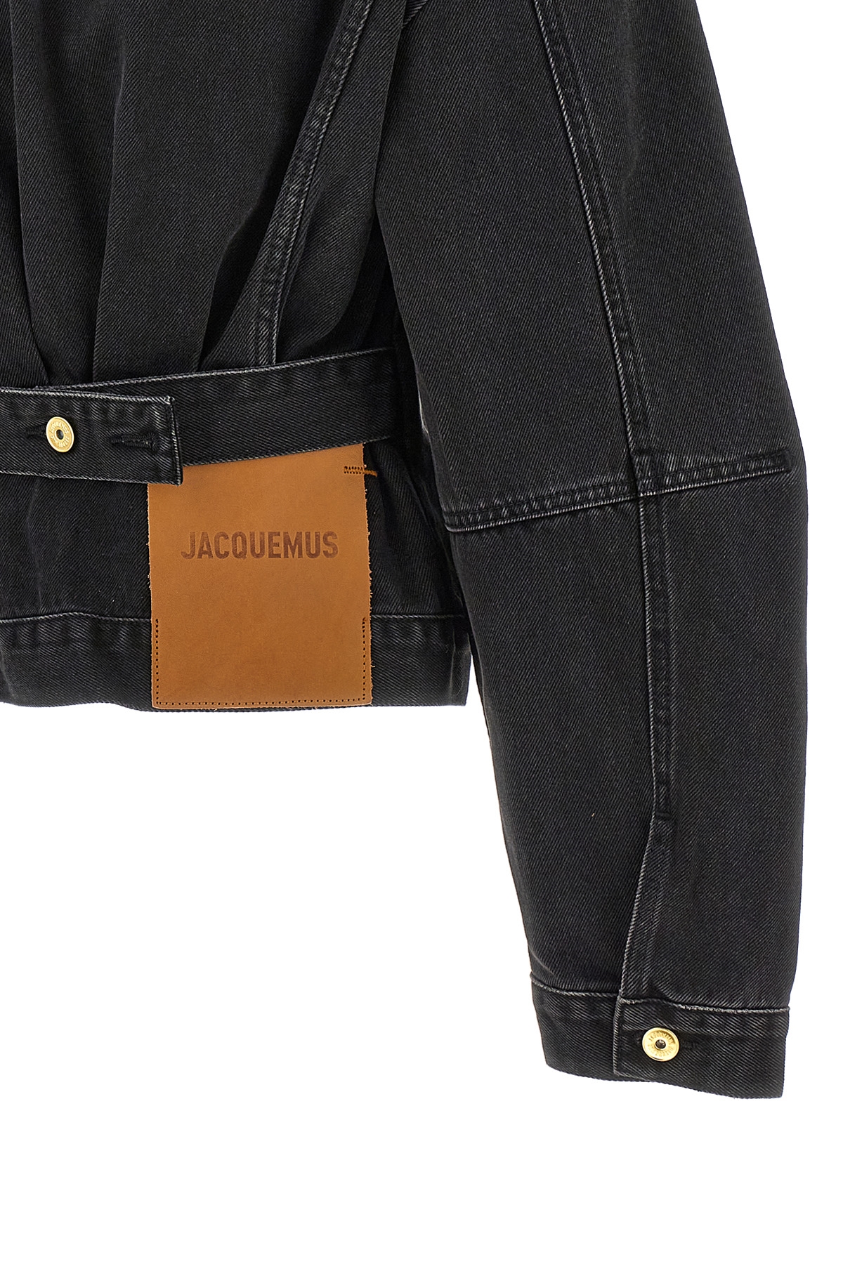 'La Veste de-Nimes' cotton denim jacket with button closure, back strap detail, front pockets, leather logo tag, long cuffed sleeves.