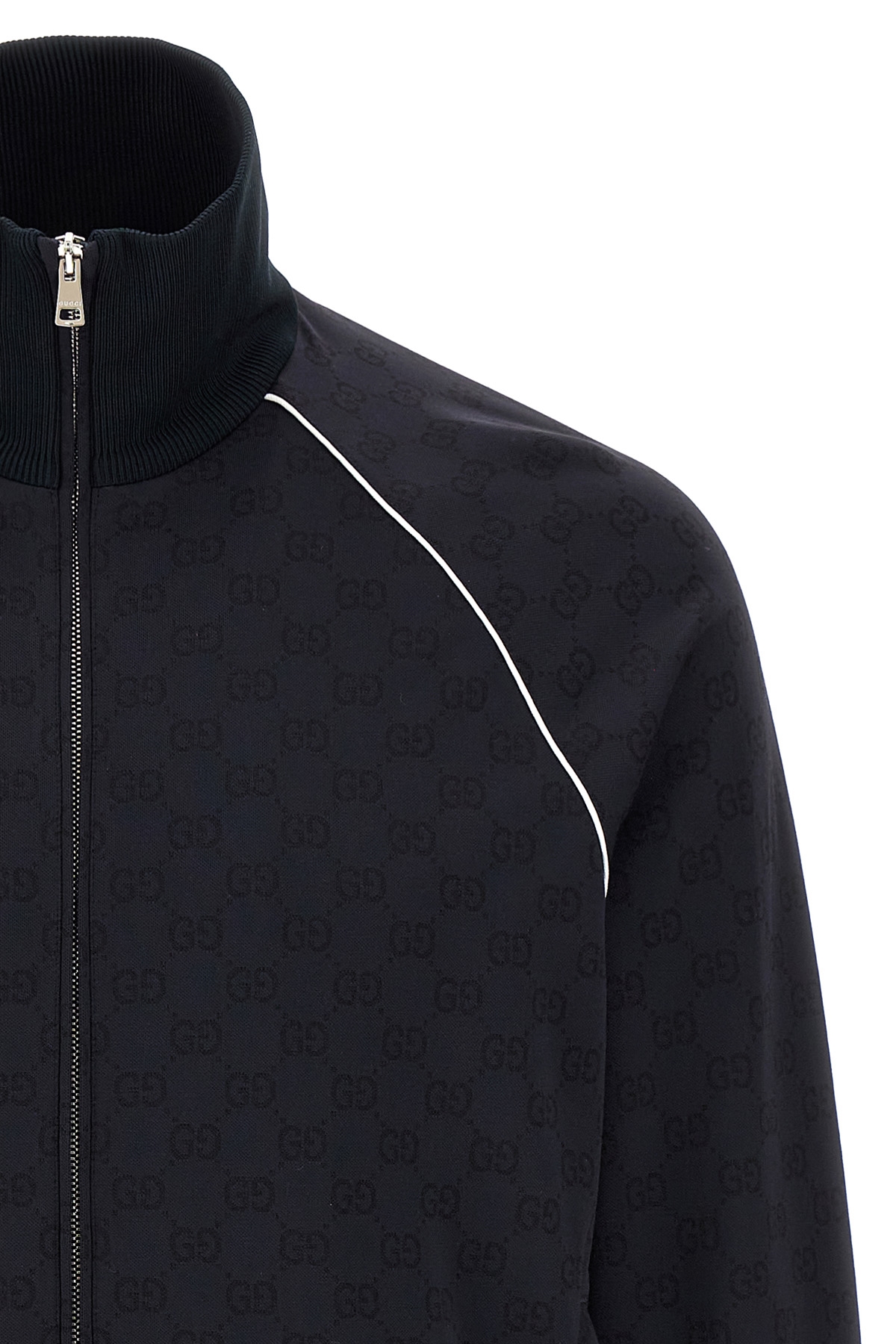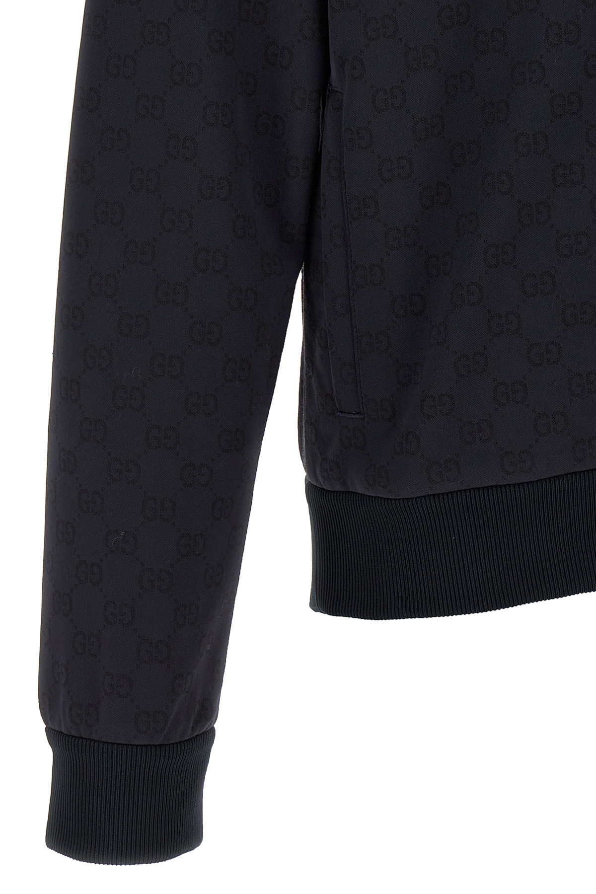 GG jacquard tech cotton nylon and jersey blend sweatshirt, high neck, zip closure, pockets, long cuffed sleeves.