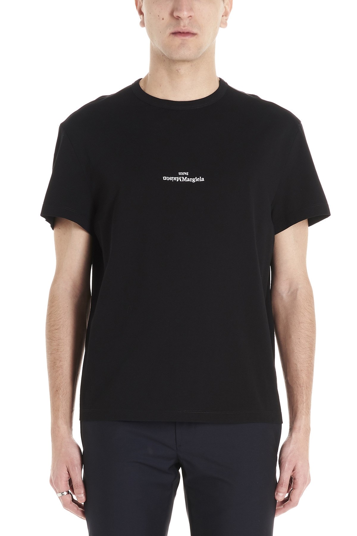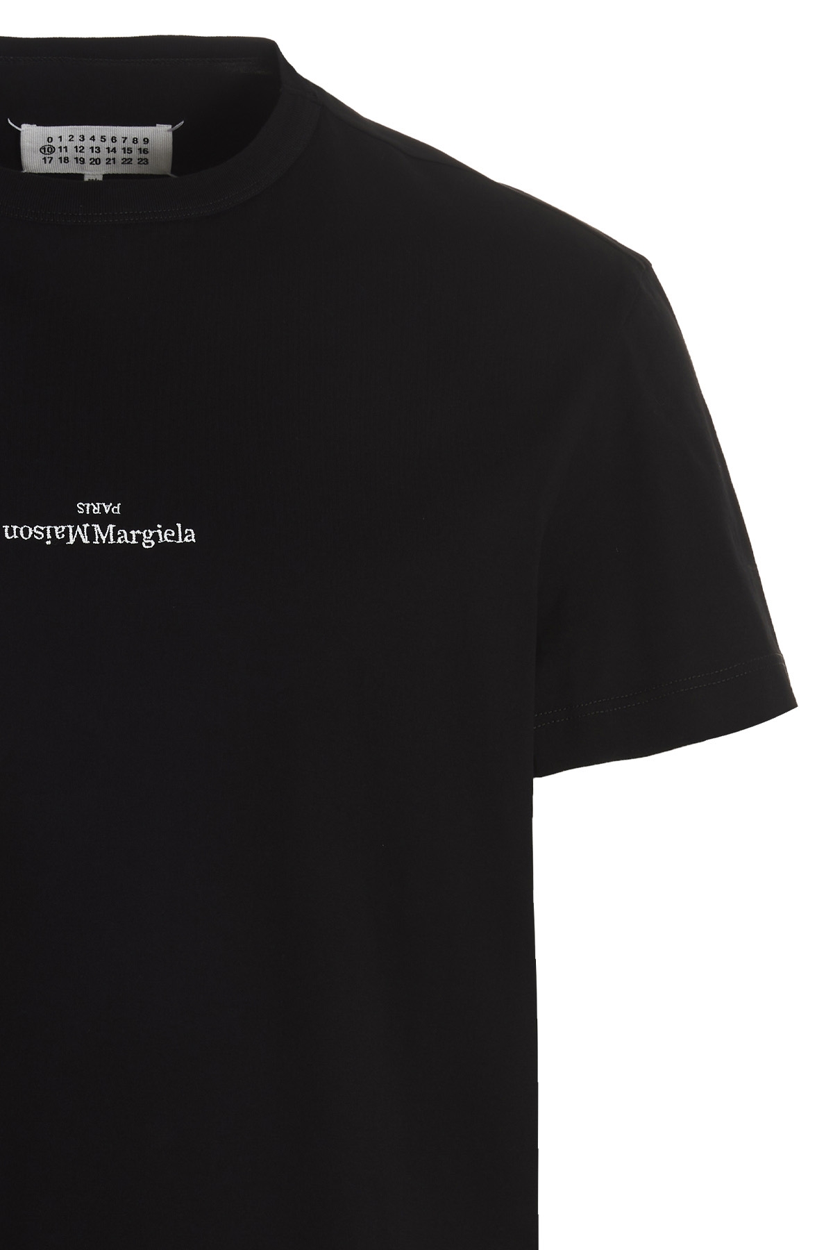 Cotton crew neck T-shirt with embroidered 'Maison Margiela Paris' logo on the front and short sleeves.