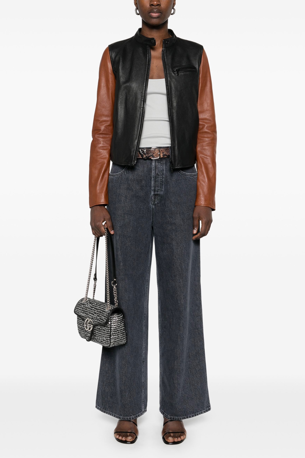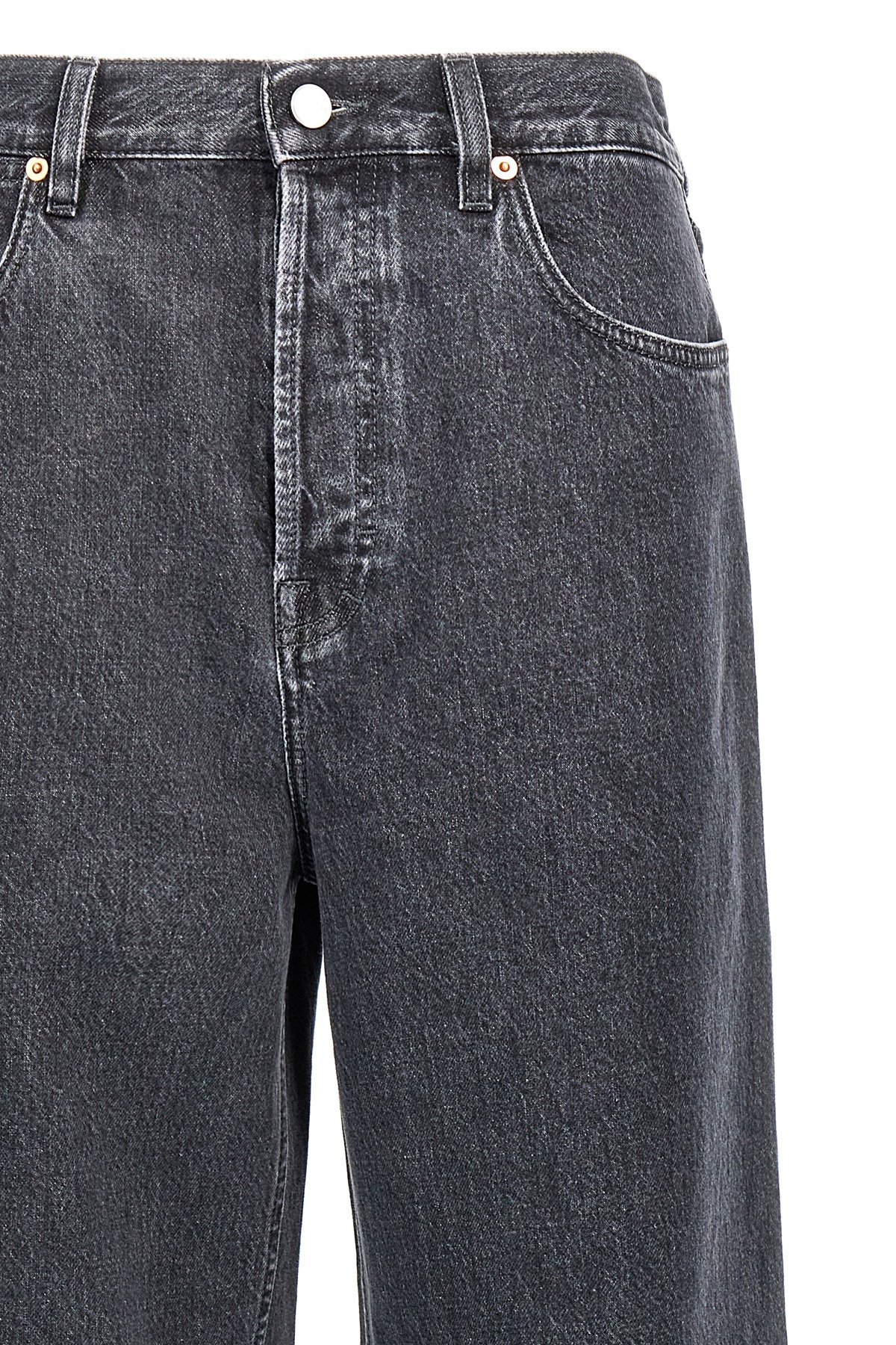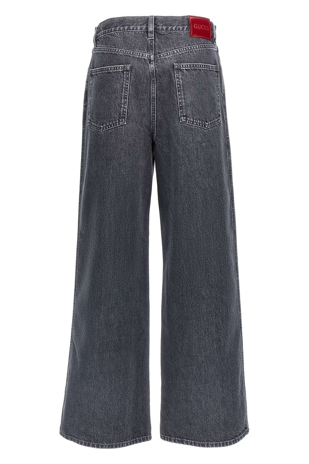 High-waisted cotton denim jeans with wide leg, pockets, button closure, Gucci Red naplak logo tag Back anchor.
