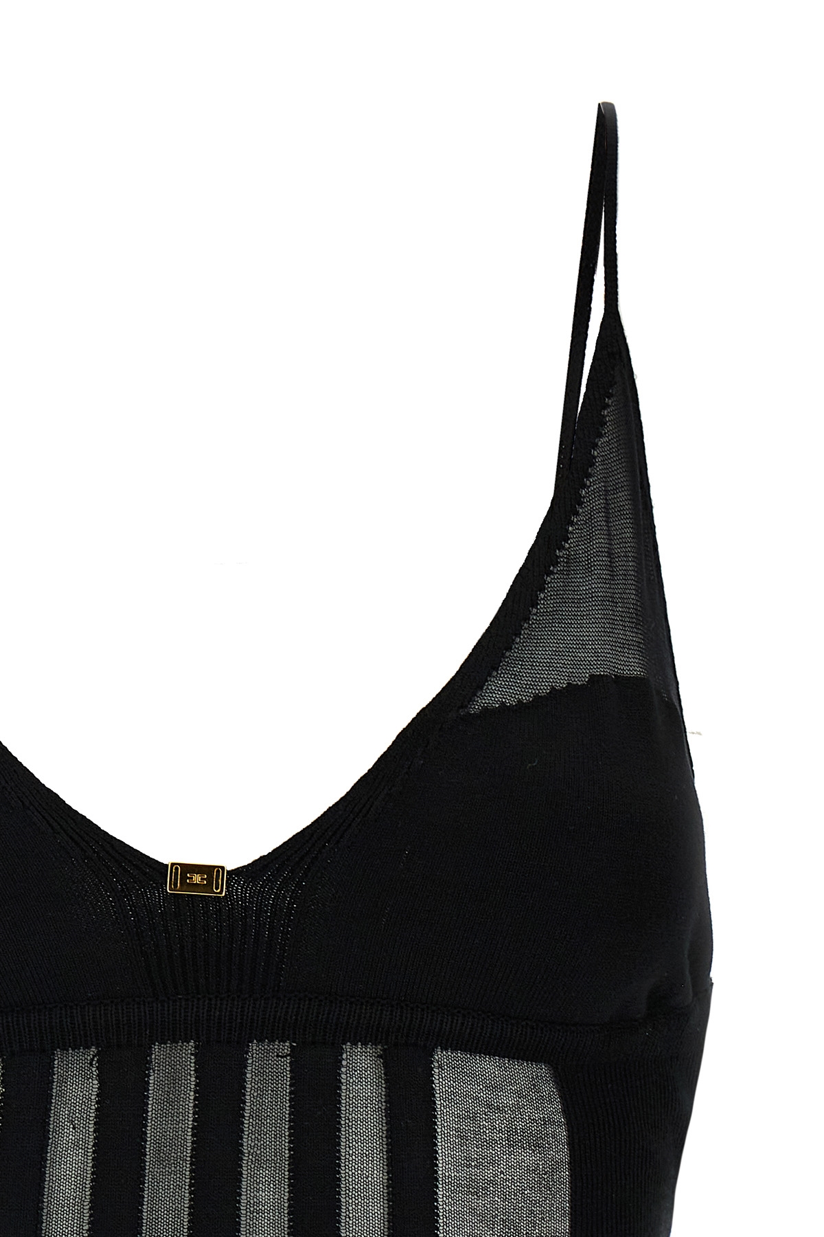 Knit top with transparencies and corset cuts, front metal logo, thin straps, side zip closure.