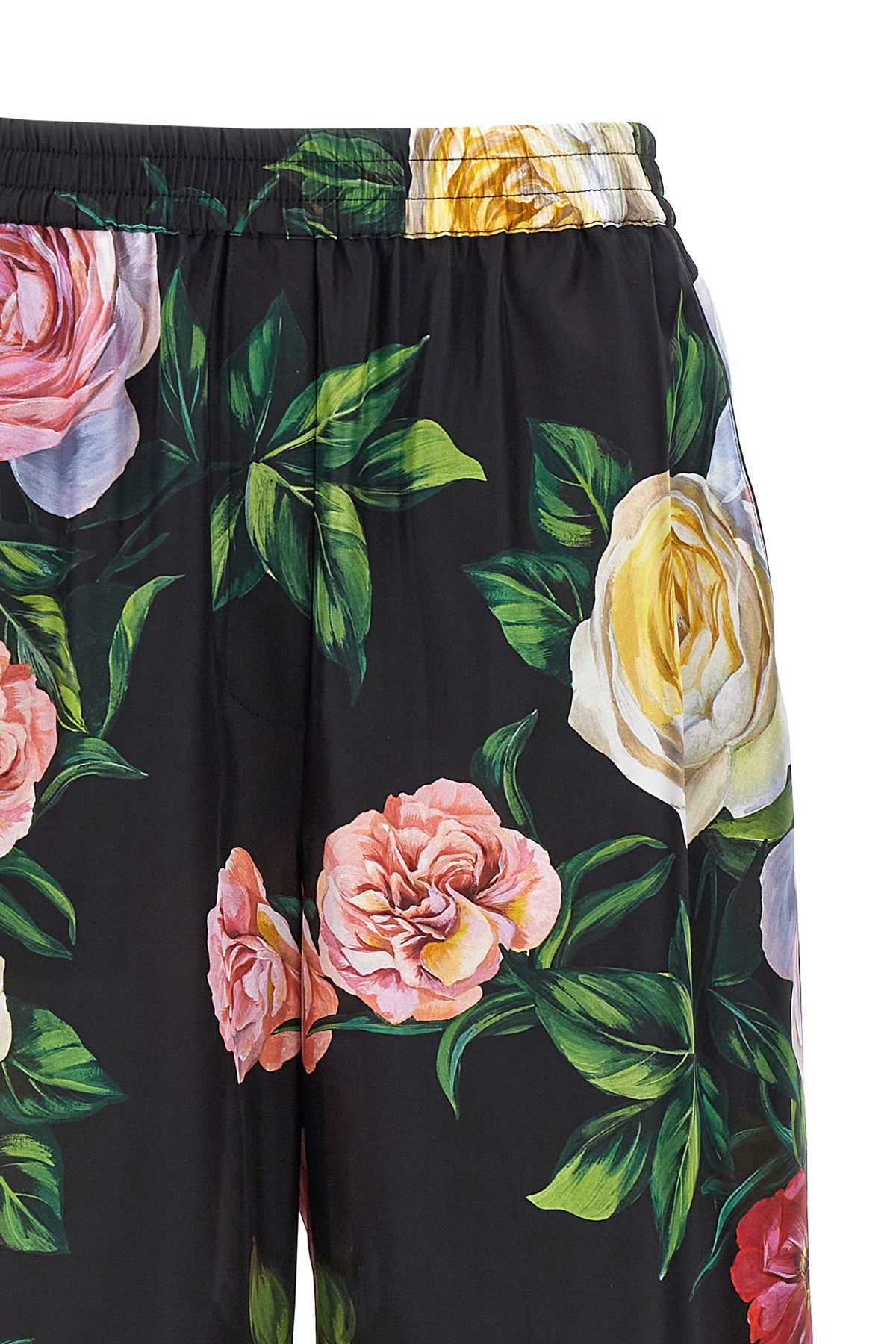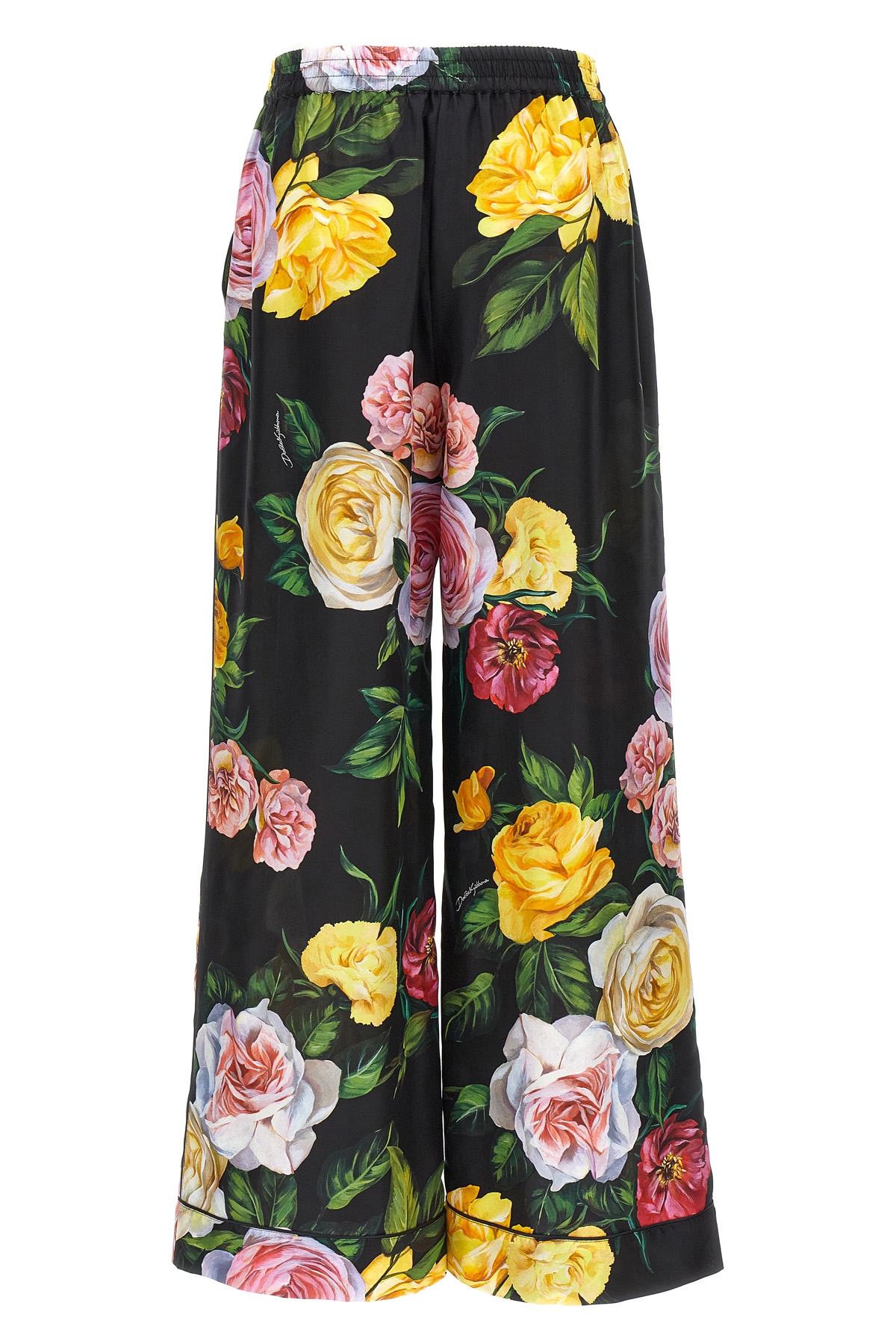 Floral-print stretch silk charmeuse trousers, solid satin piping, pajama style with wide leg, elastic waistband, pockets.