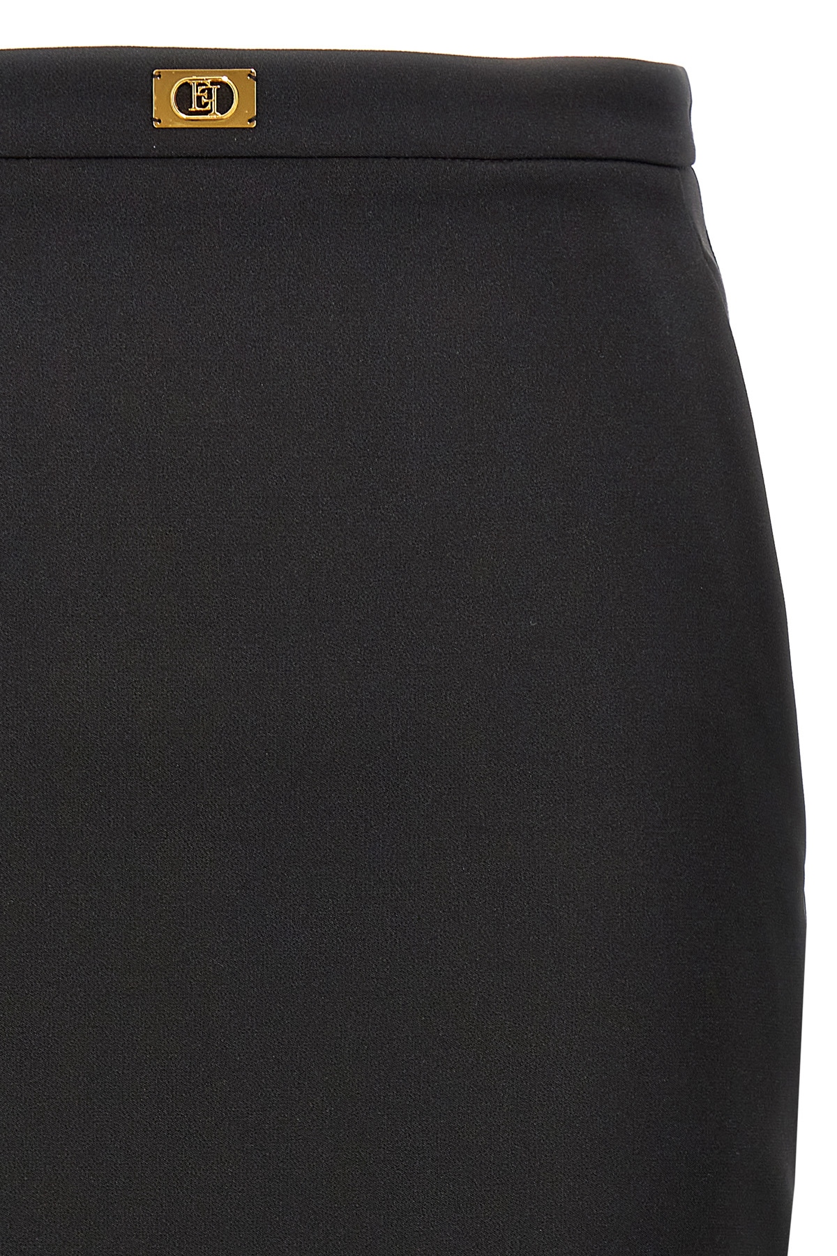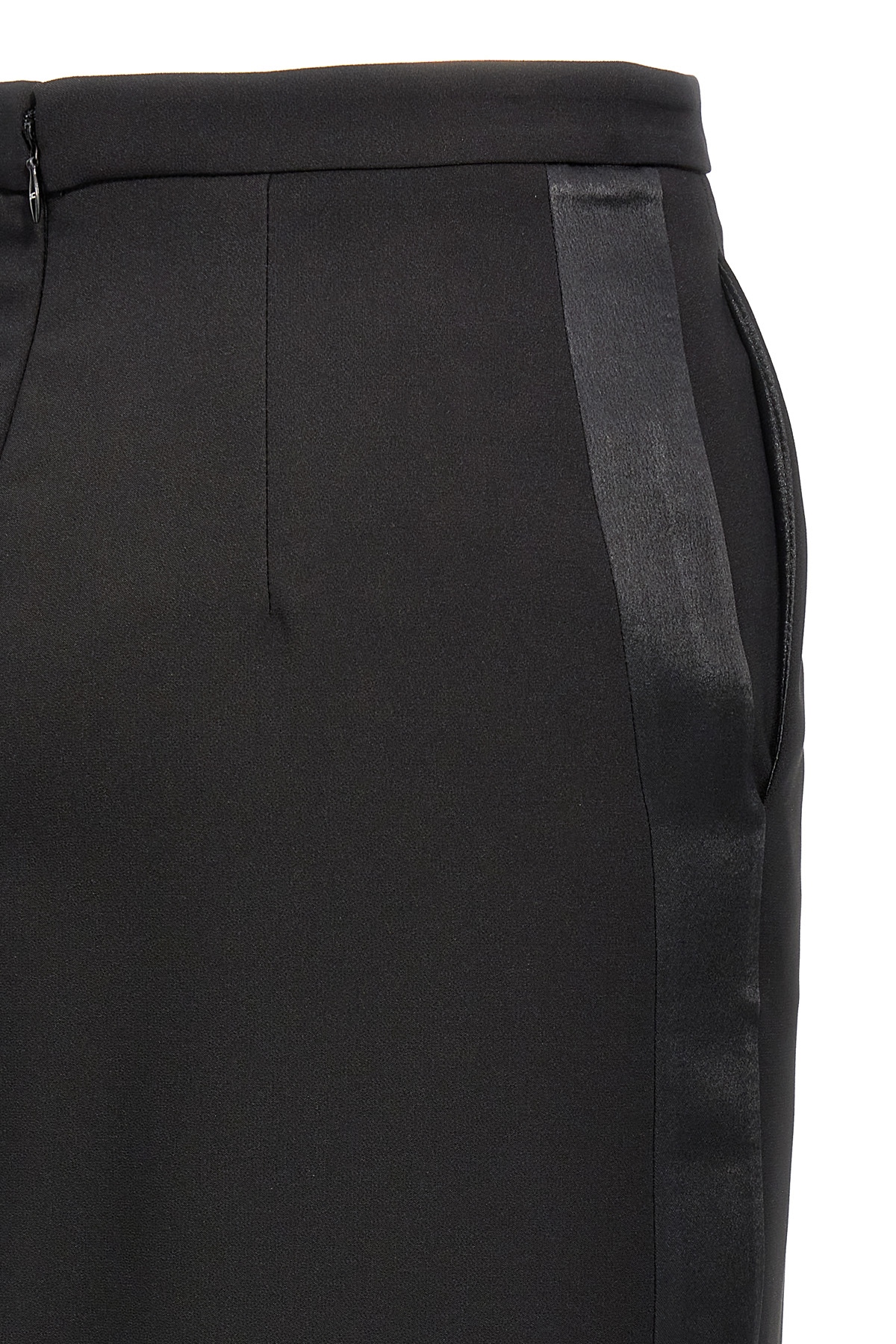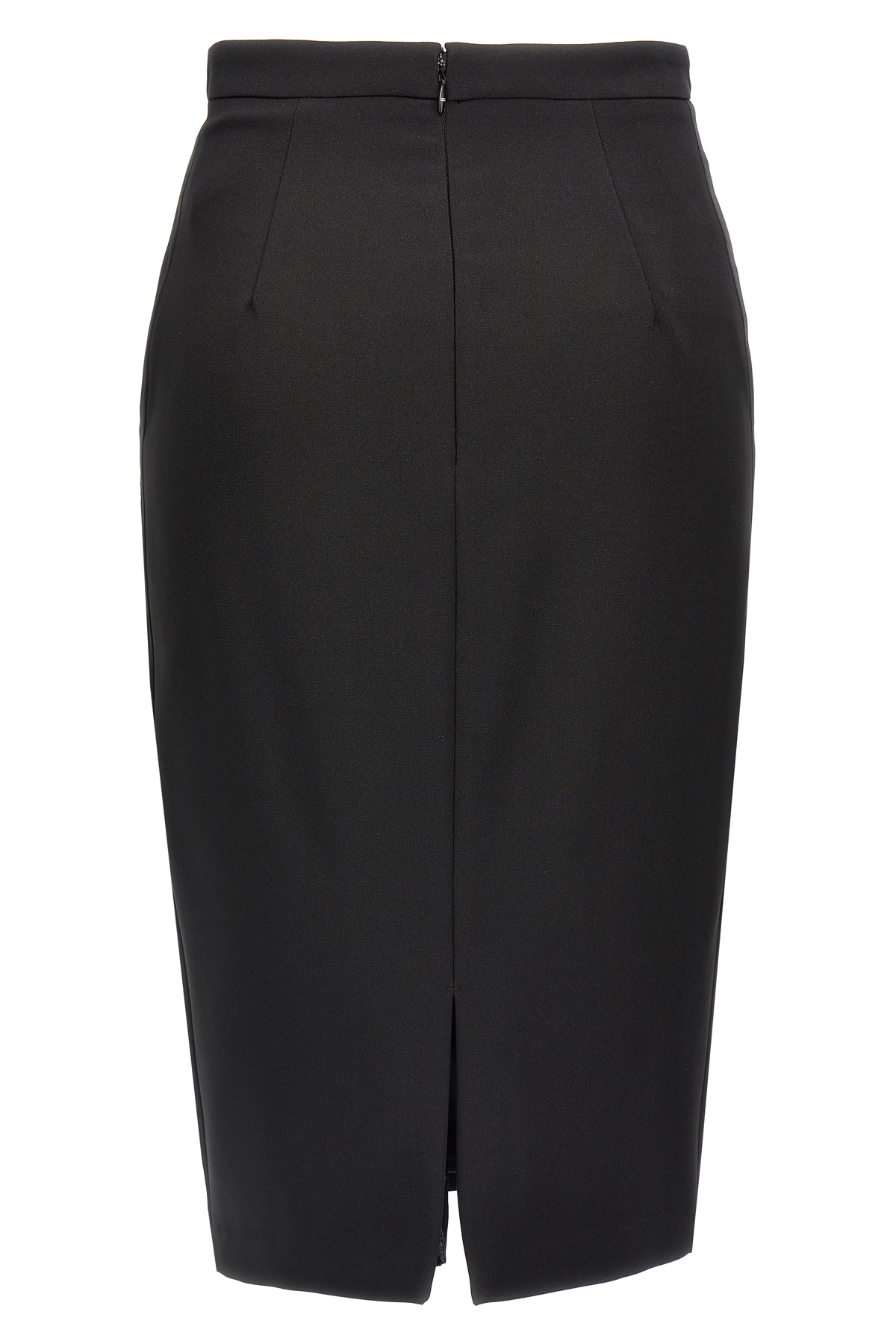Longuette skirt in stretch crepe with side bands in shiny satin, front metal logo, pockets, back zip closure, and back split.