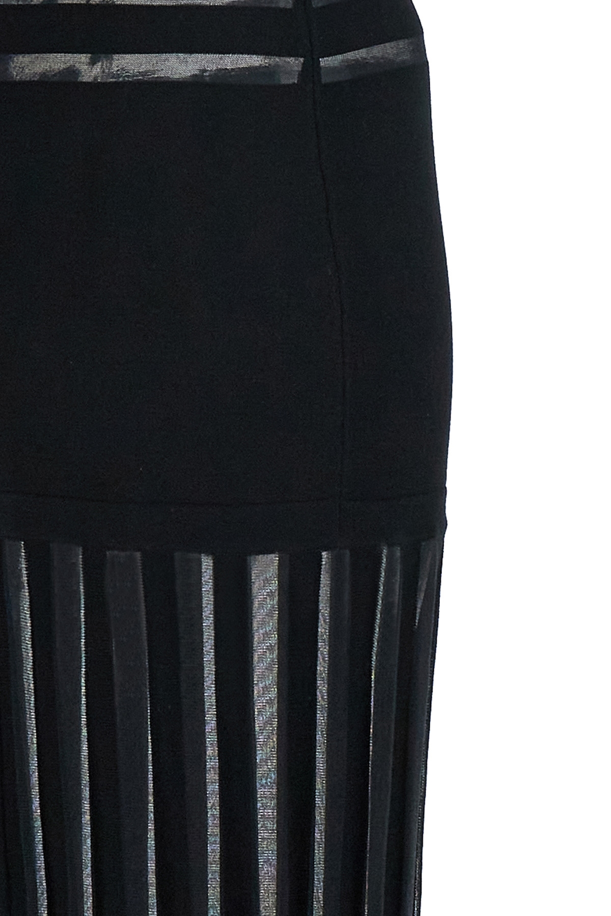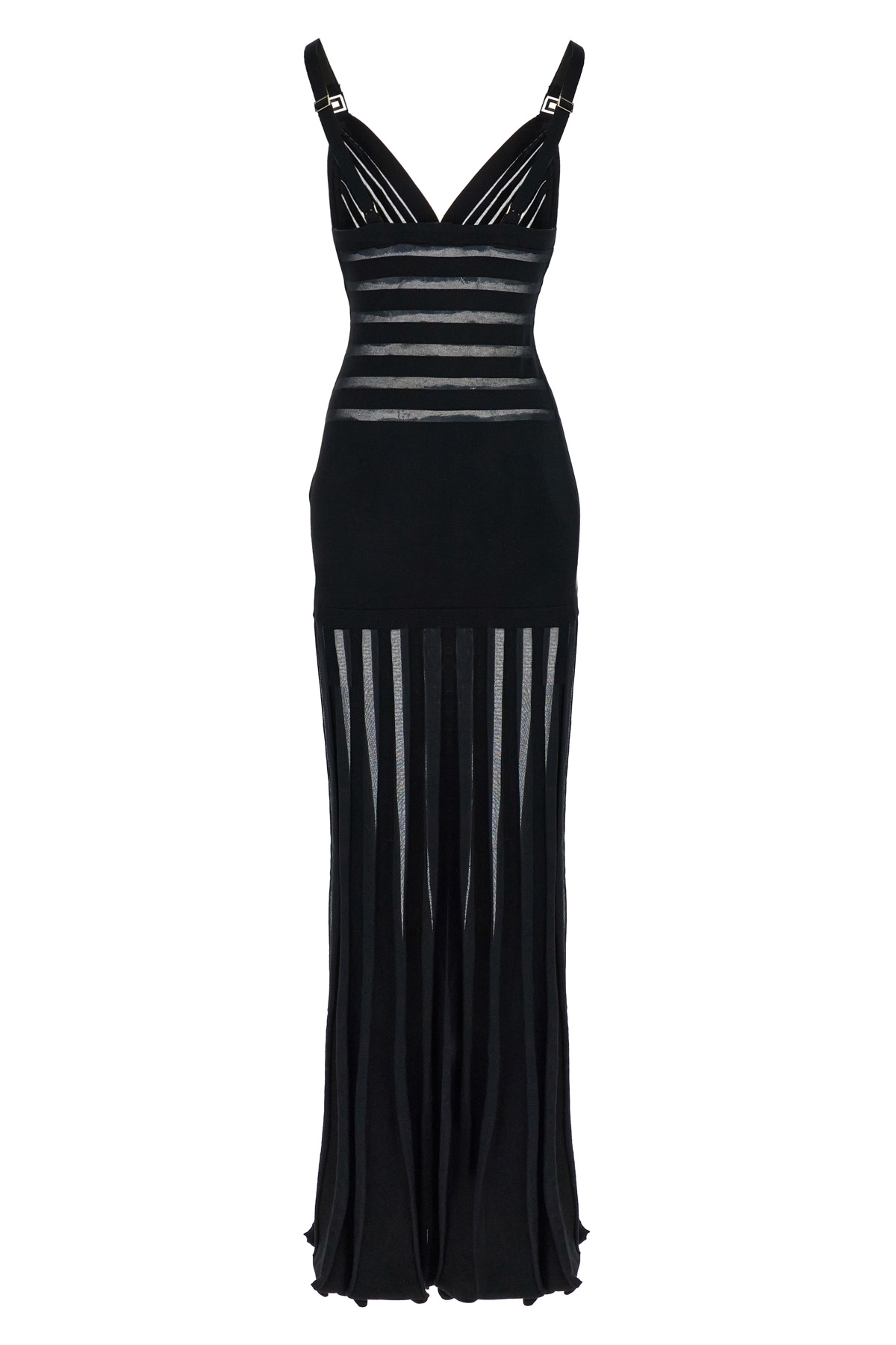 'Red Carpet' knitted dress with transparencies, adjustable shoulder straps, metal details, tight fit up to the basque then the skirt comes down soft.