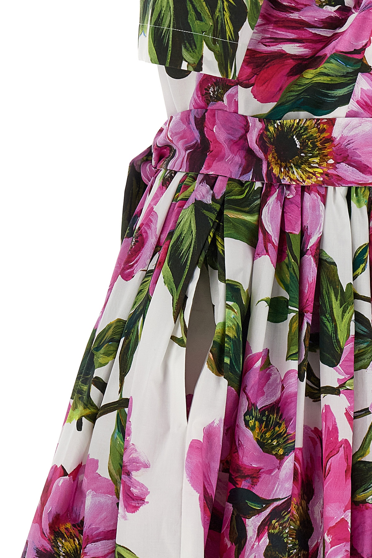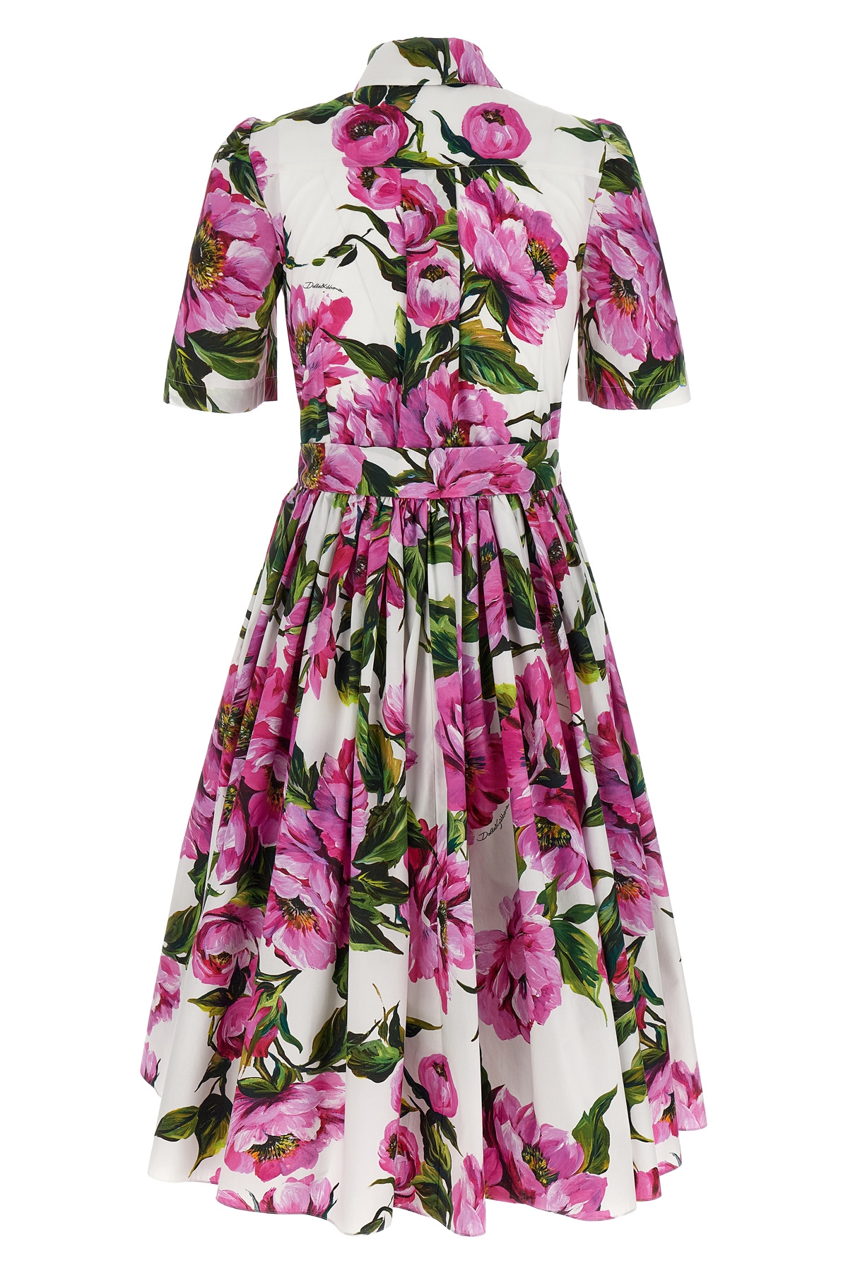 Longuette dress in floral print cotton poplin with shirt model with full skirt, removable matching belt, logo button closure, pockets, and short sleeves slightly puffed.