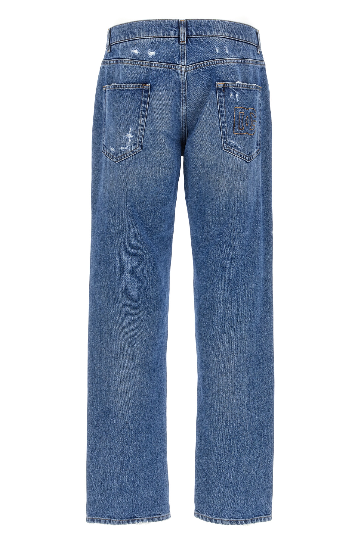 Cotton denim jeans with destroyed details, back logo embroidery, five pockets, zip and button closure, straight leg.