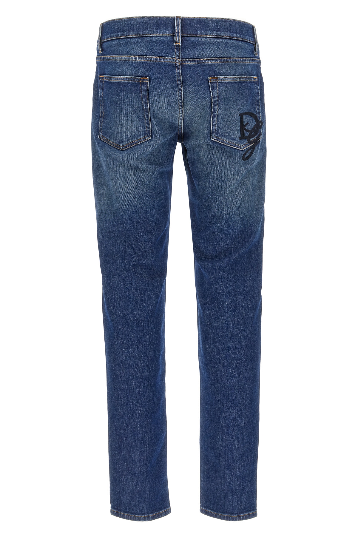 Skinny stretch cotton denim jeans with contrasting logo embroidery at the back, five pockets, and zip and button closure.