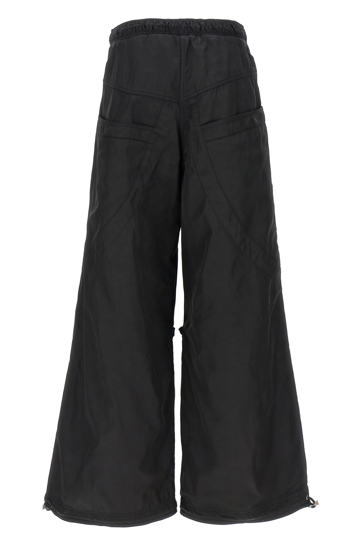 Nylon pants with oversized leg, adjustable drawstring elastic waistband, pockets, drawstring pockets, drawstring at the hem.