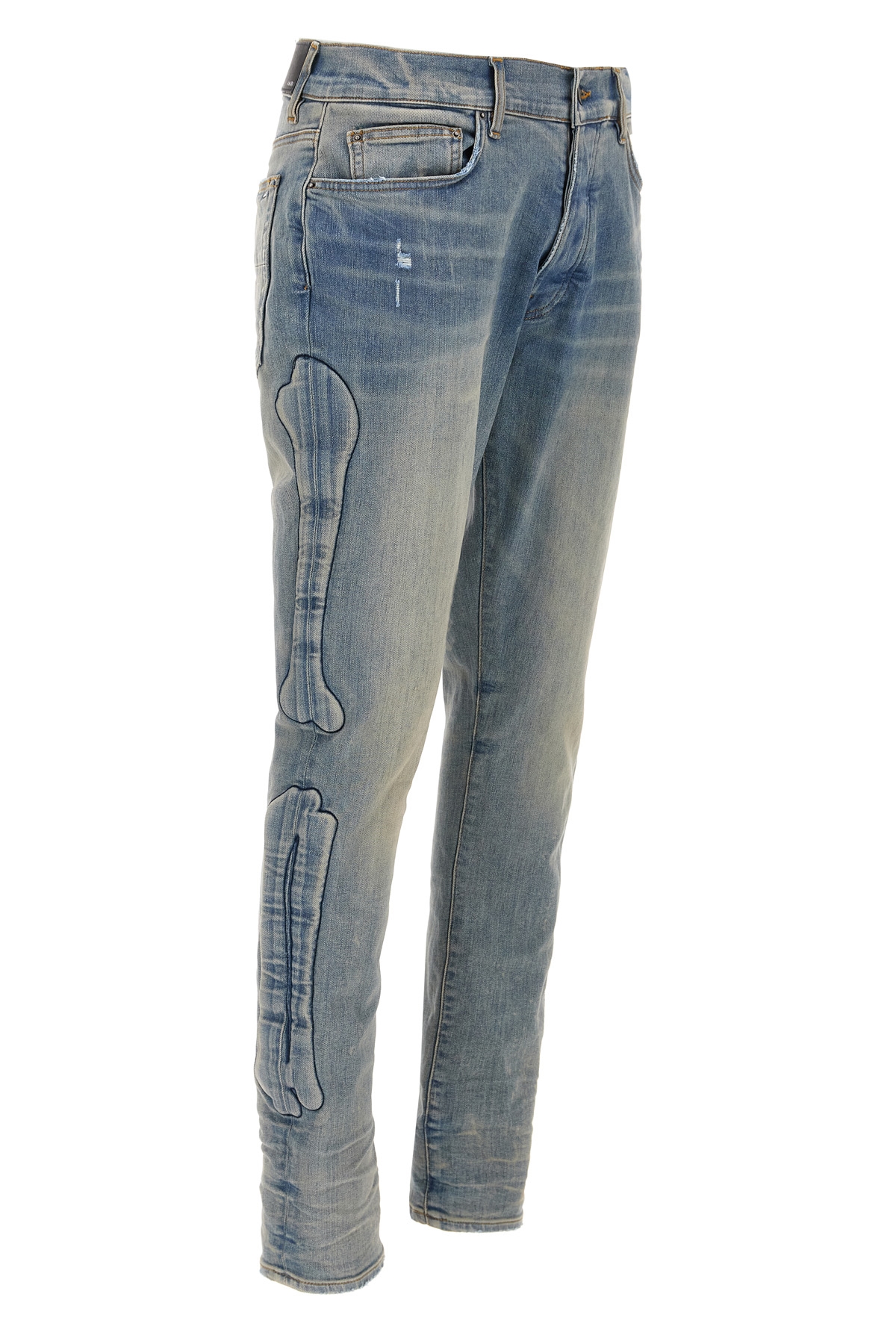 Delave and used stretch cotton denim jeans with side '3D Bones' applications, skinny model, button closure, five pockets, back logo embroidery.