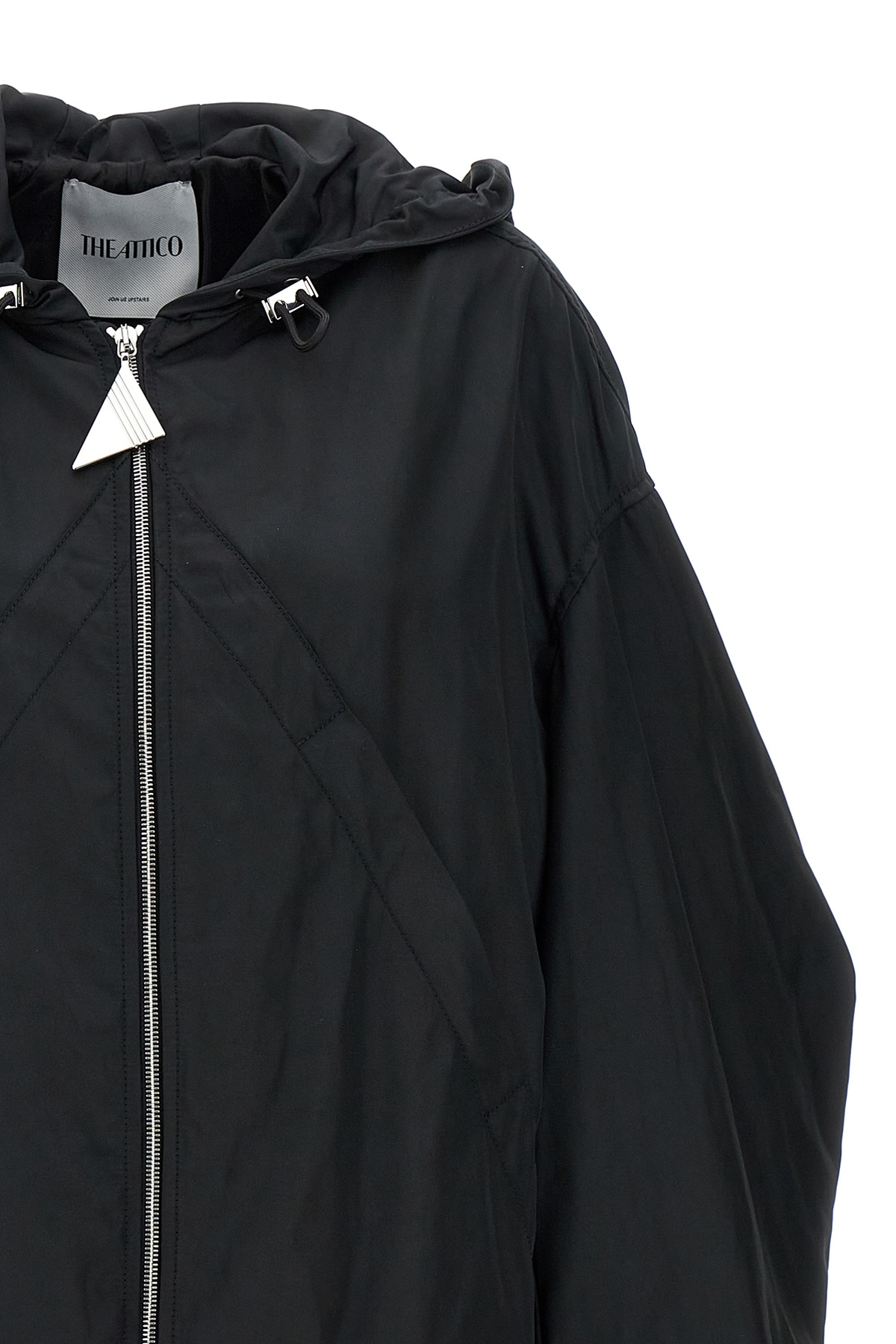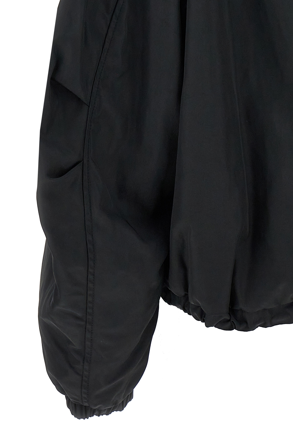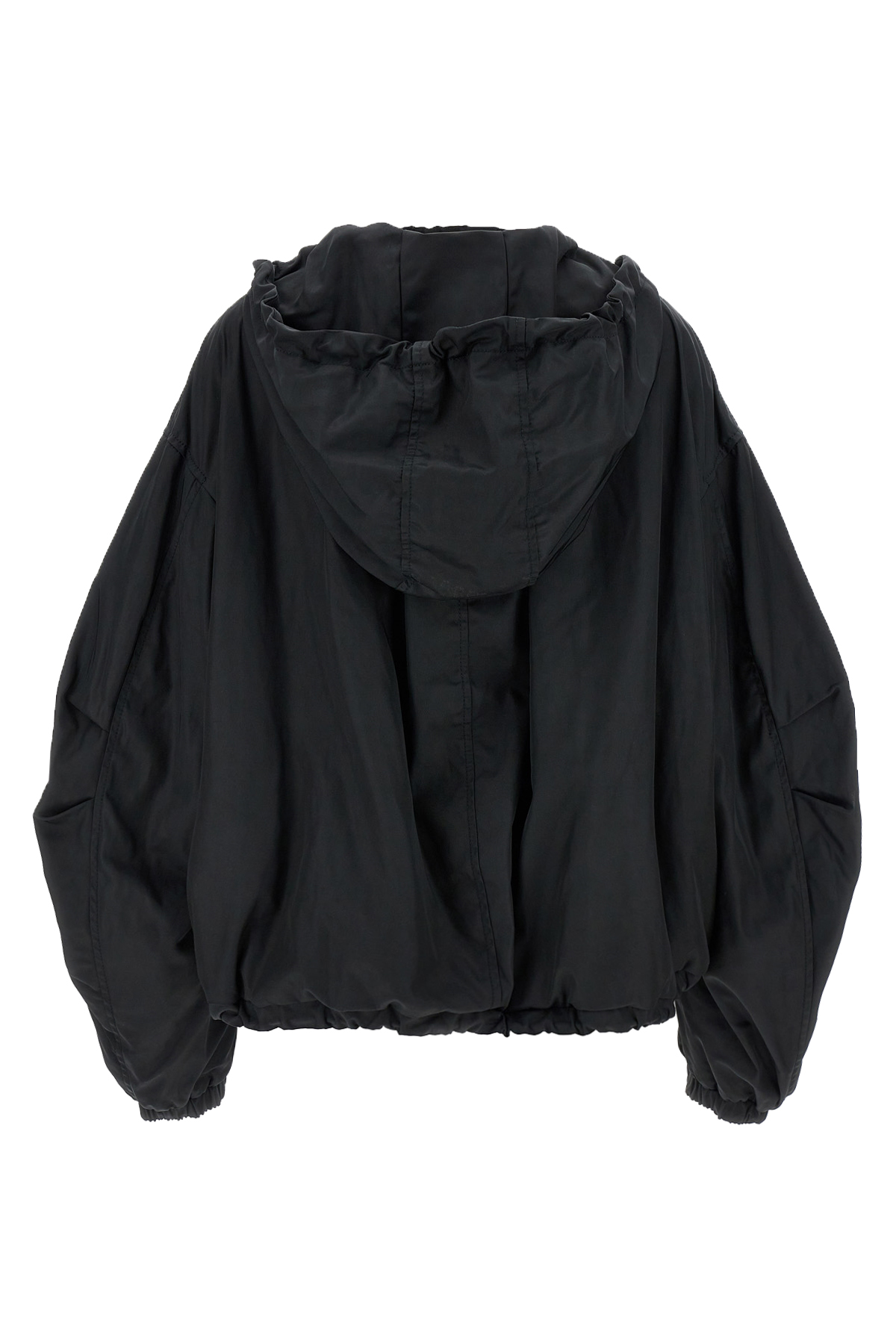 Asymmetrical nylon bomber jacket, hood with adjustable drawstring, zip closure, pockets, long wide sleeves with elastic cuffs, drawstring at the hem.