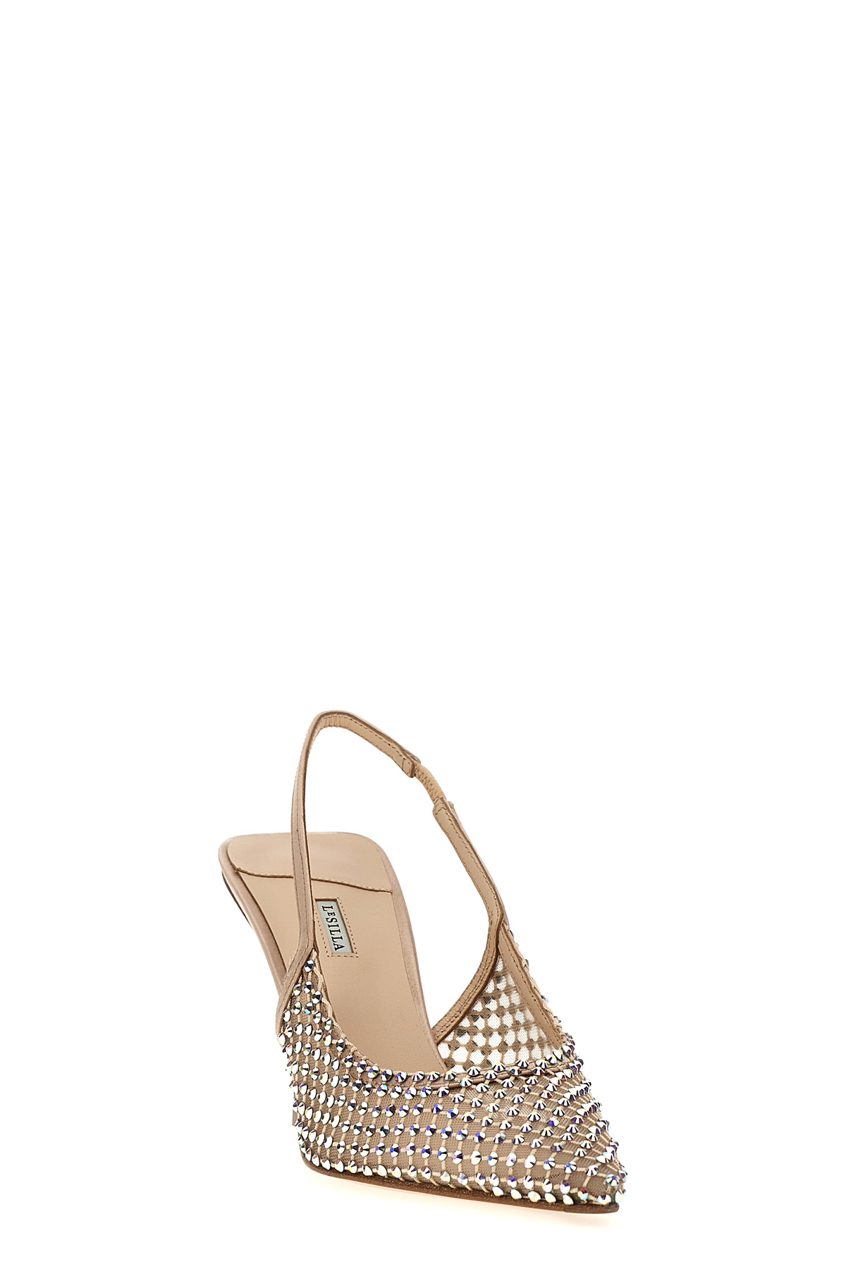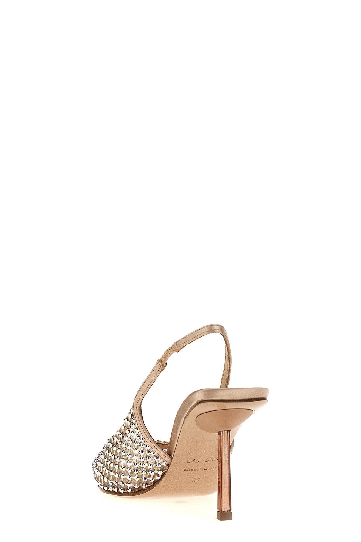 'Gilda' leather slingbacks with rose gold stretch knit, finished with crystals, stiletto heels.