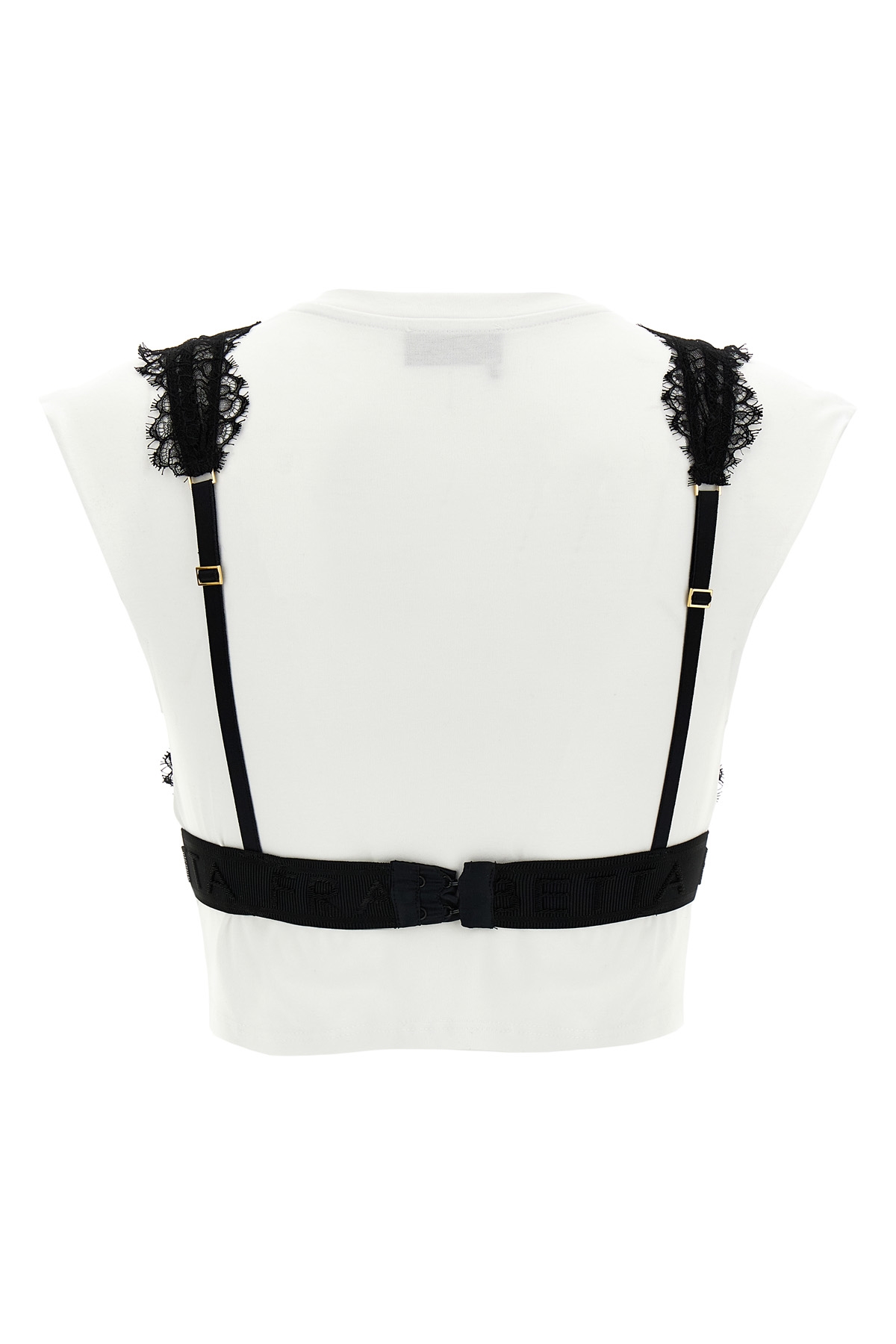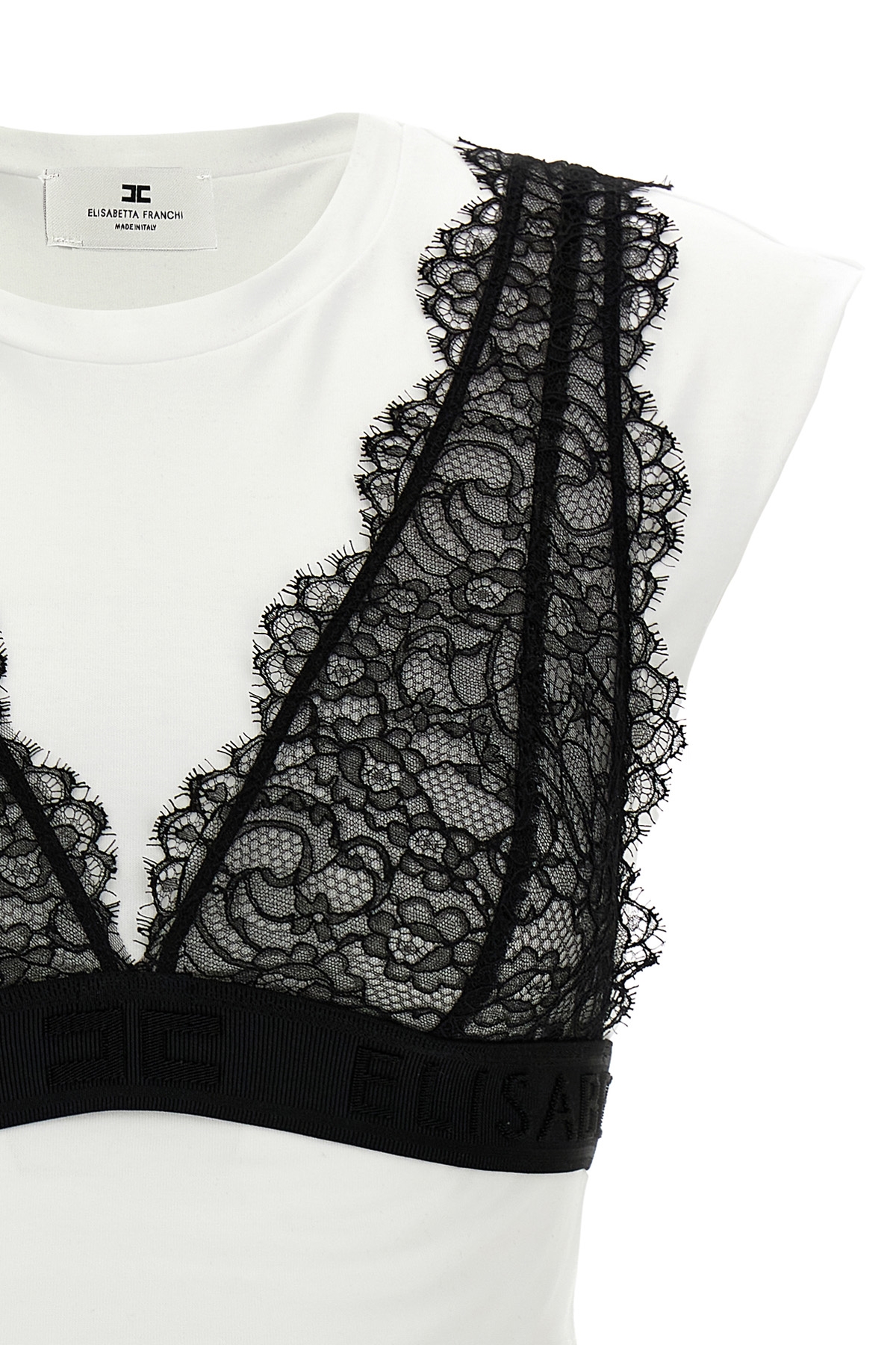 Crop style cotton jersey crew neck t-shirt set, short sleeves and contrasting lace bralettes, logo elastic on the hem, adjustable shoulder straps, hook closure.