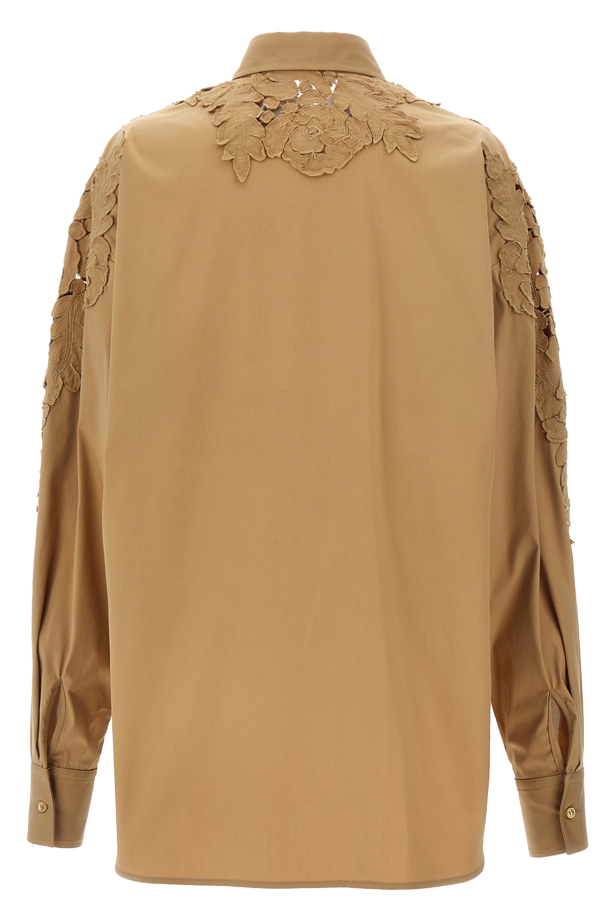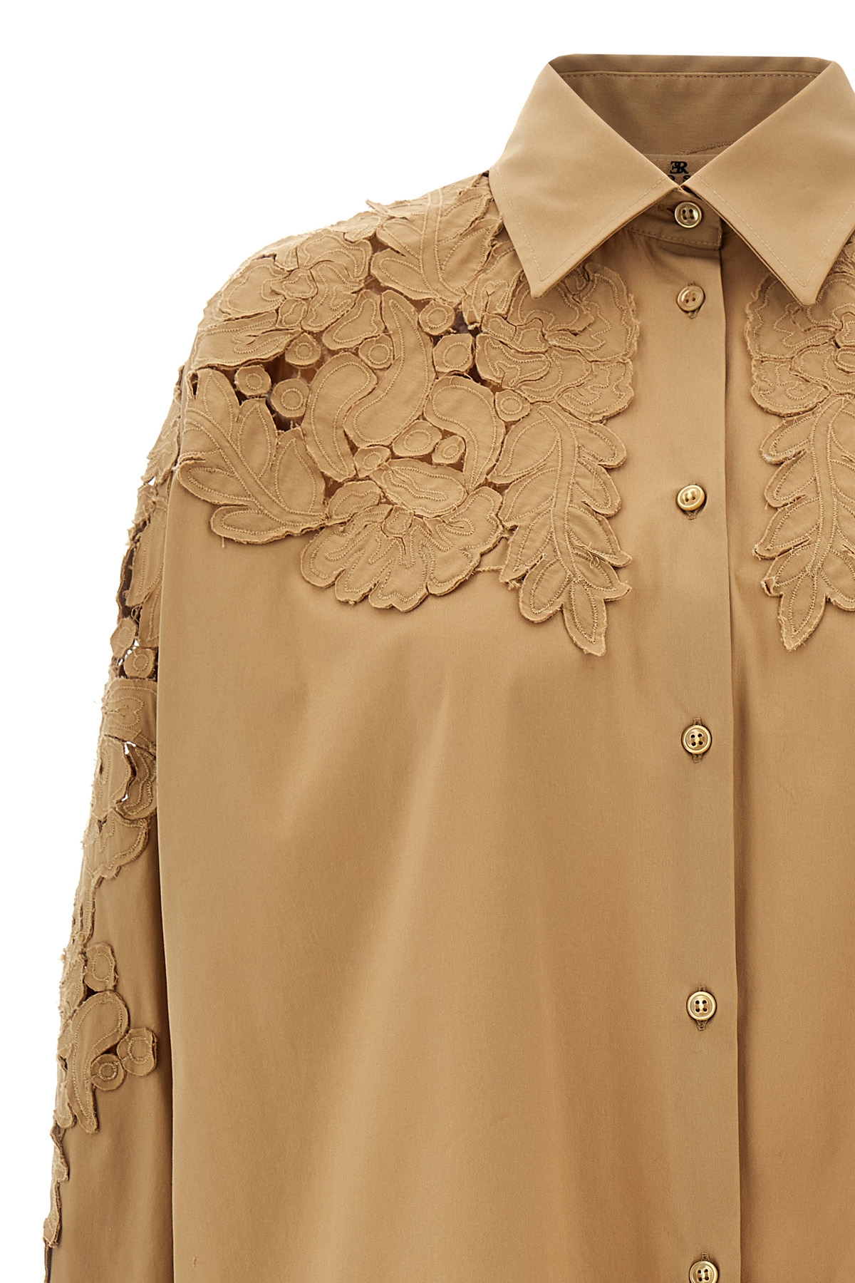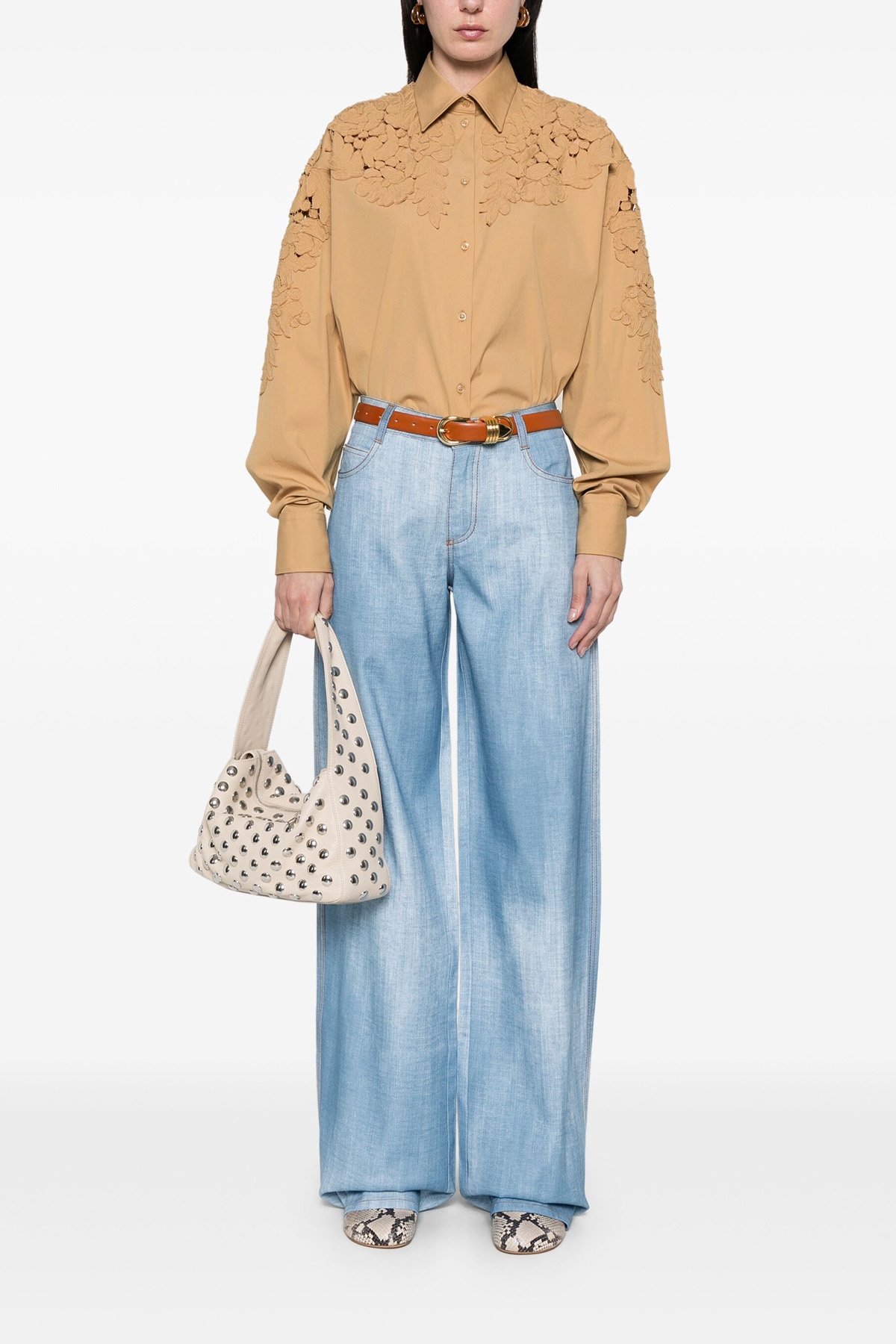 Cotton blend shirt with cut-out floral details, button closure, long wide cuffed sleeves.
