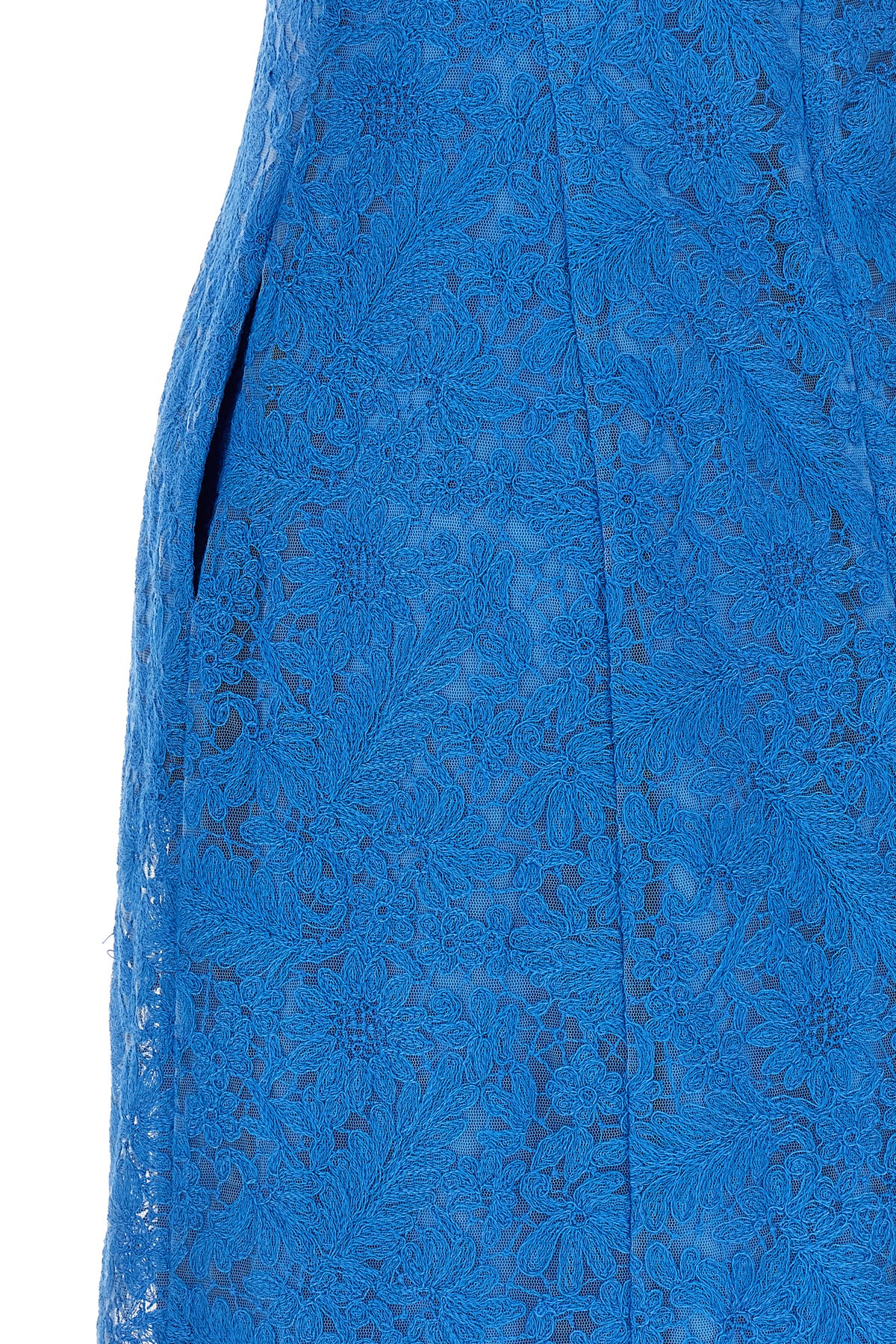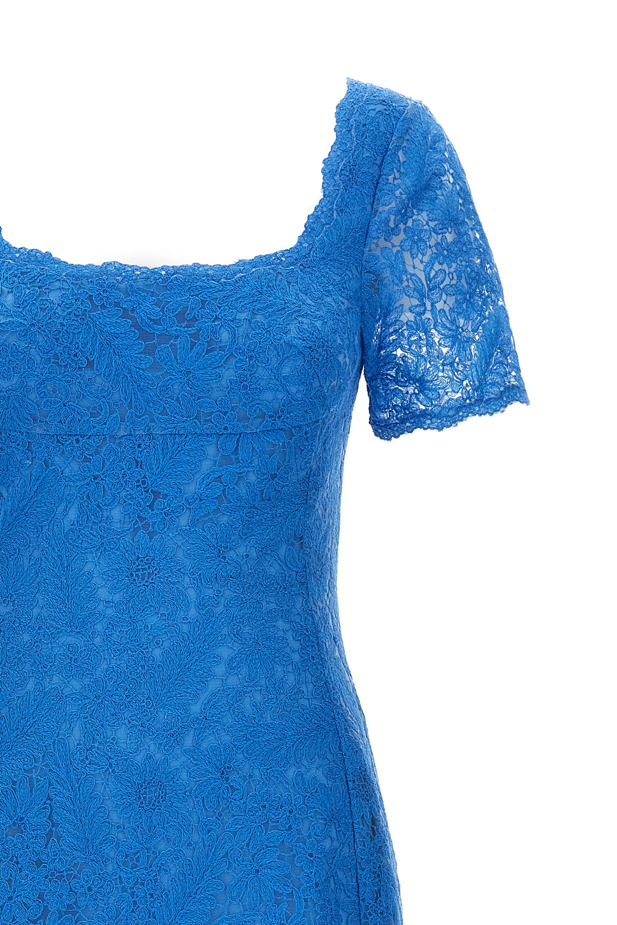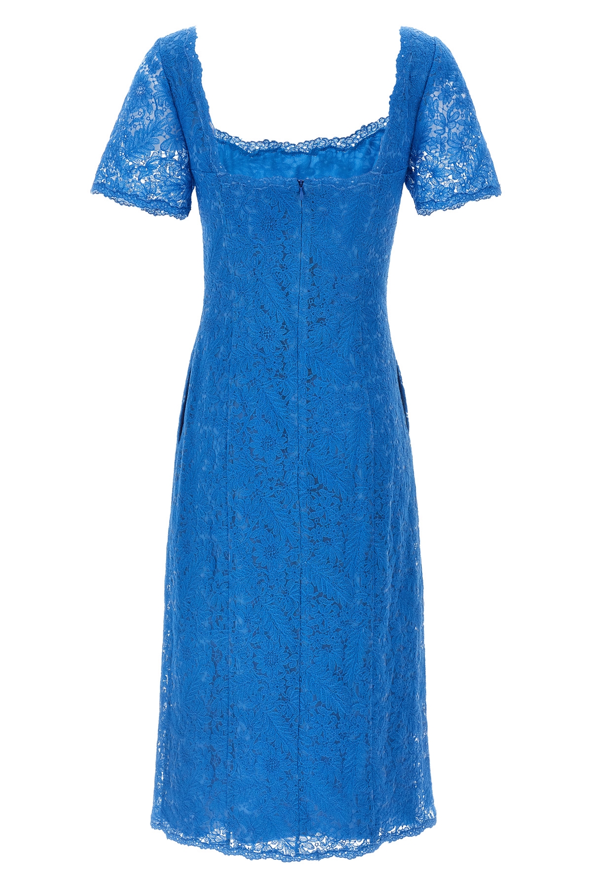 Floral lace midi dress with square neckline at the front and back, jagged hem, back zip closure, short sleeves with I see I don't see, petticoat.