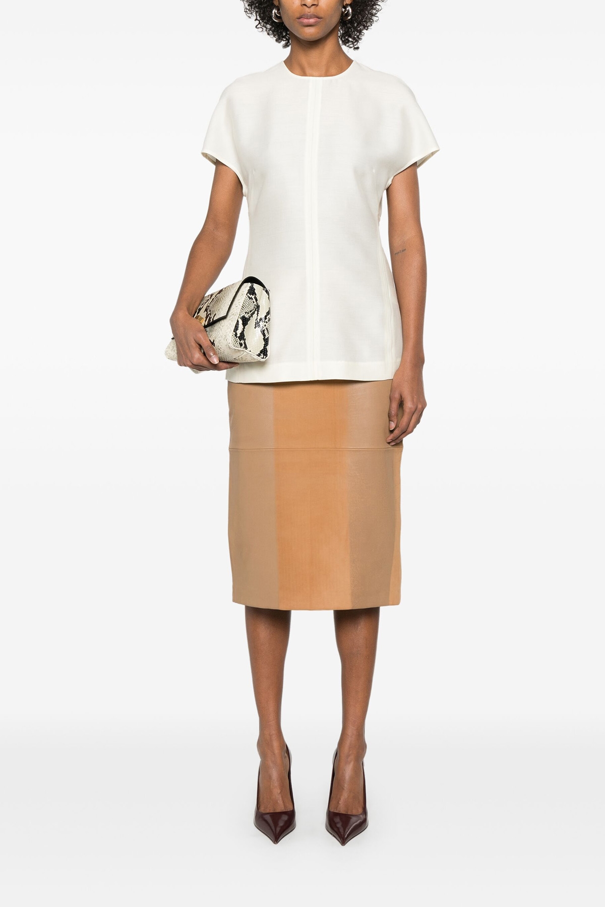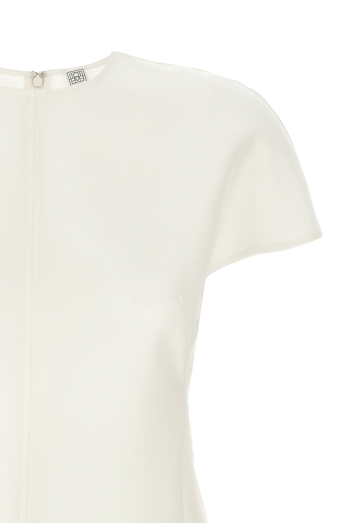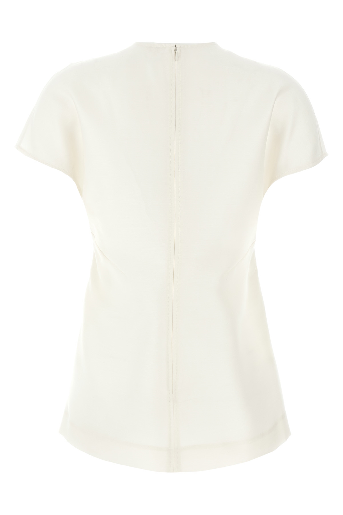 'Cap-sleeve' wool and silk top, crew neck, front stitching, short sleeves, back hook and zip closure.