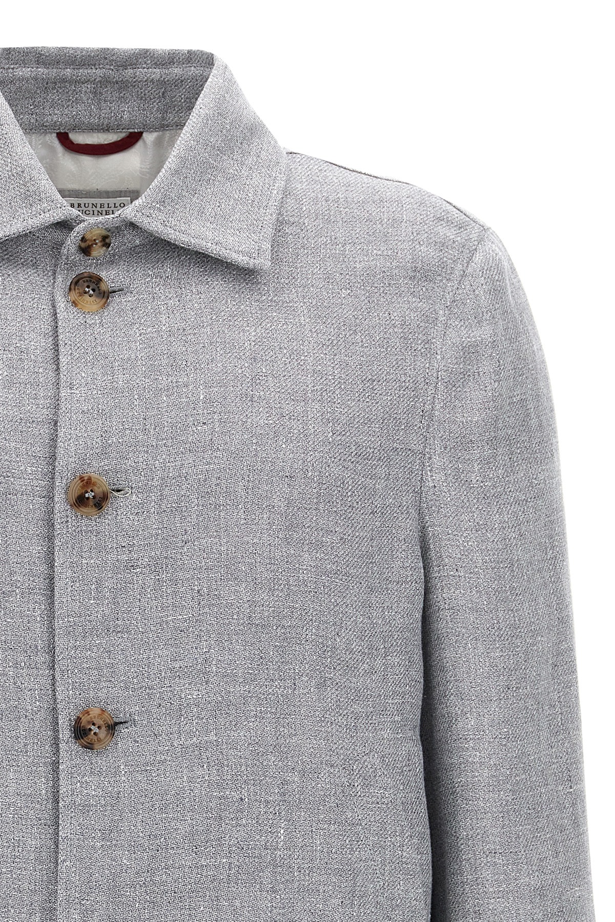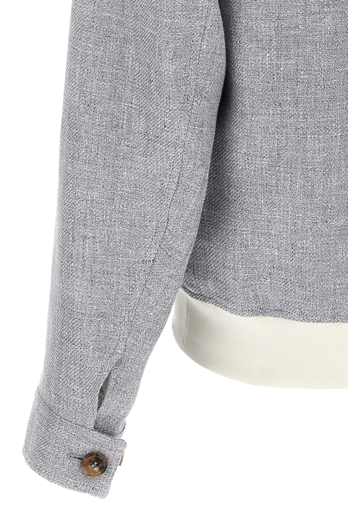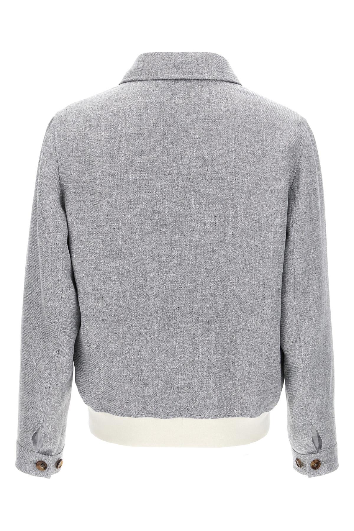 Diagonal jacket in wool and silk linen, collar, button closure, long sleeves with cuffs, pockets, and contrasting knitted hem.