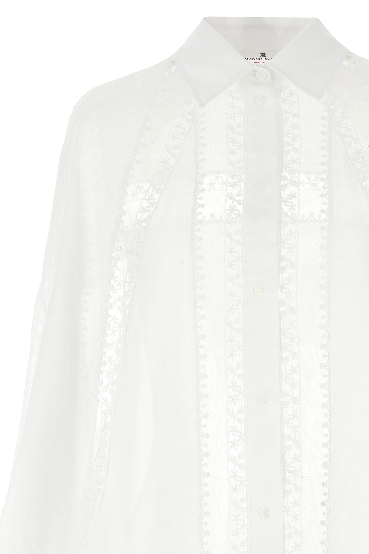 Cotton shirt with macrame lace and transparent tulle inserts, button closure, long bat sleeves with cuffs.