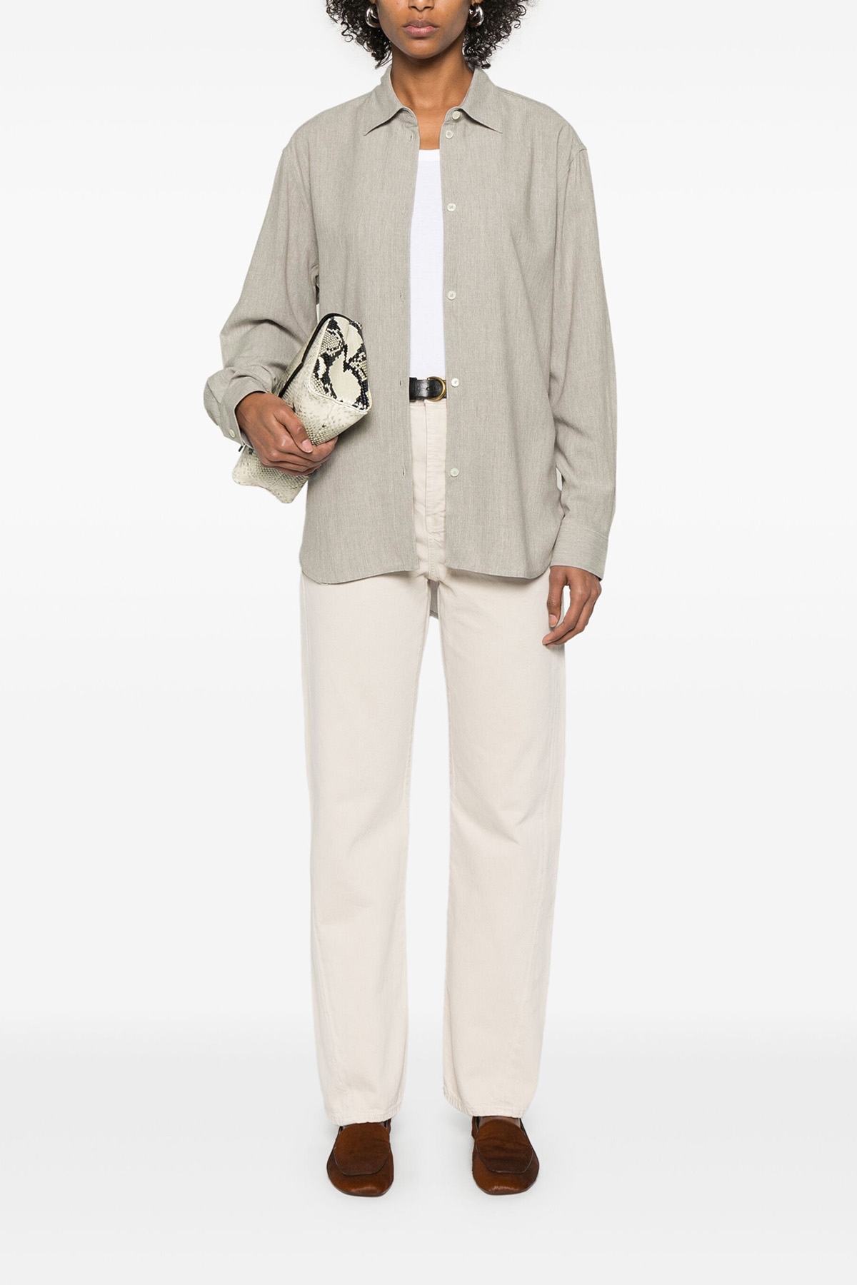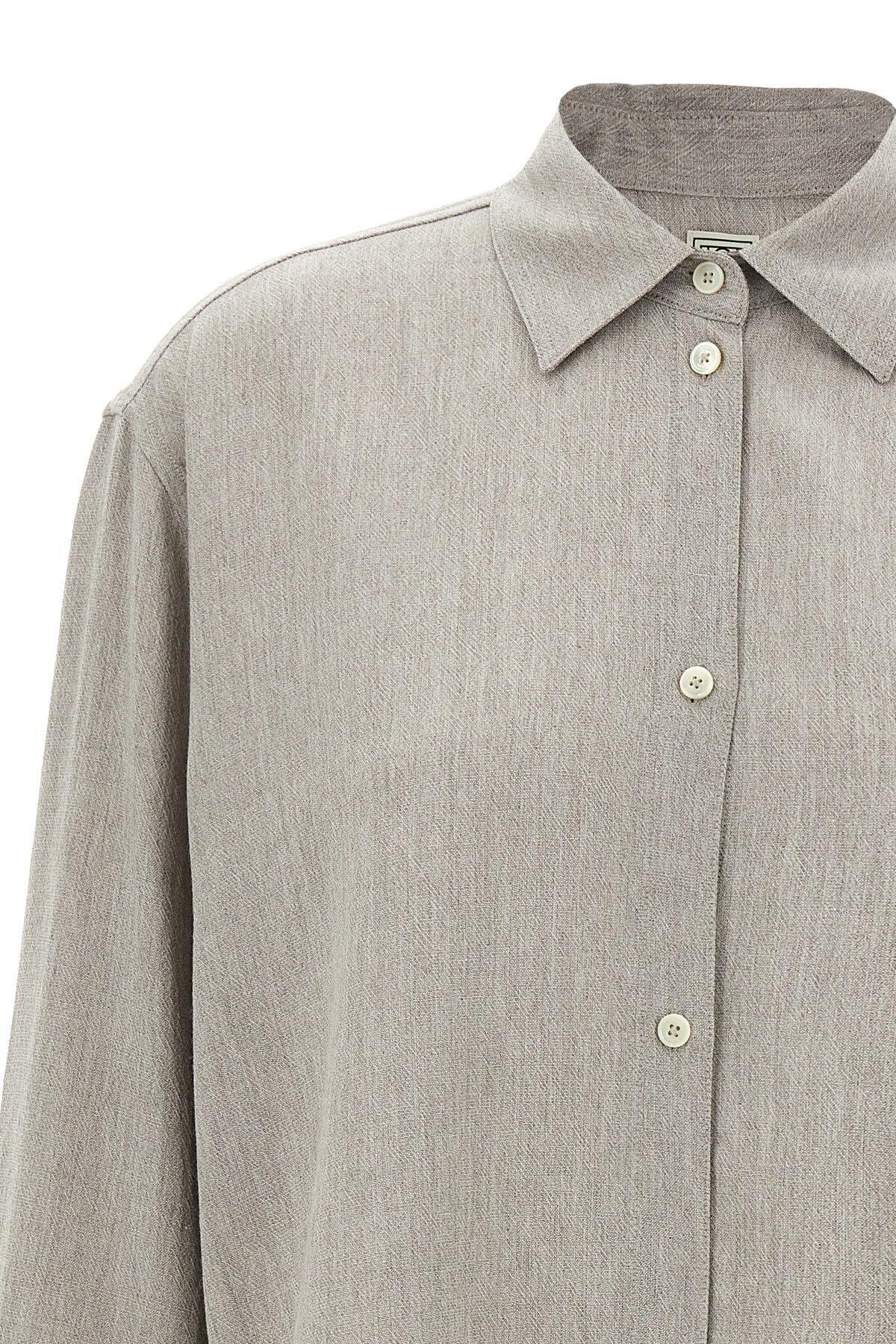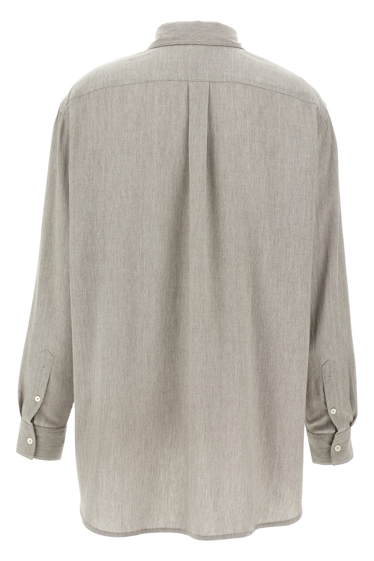 Wool blend shirt with slightly loose fit, side slits, longer at the back, front button closure, long cuffed sleeves.