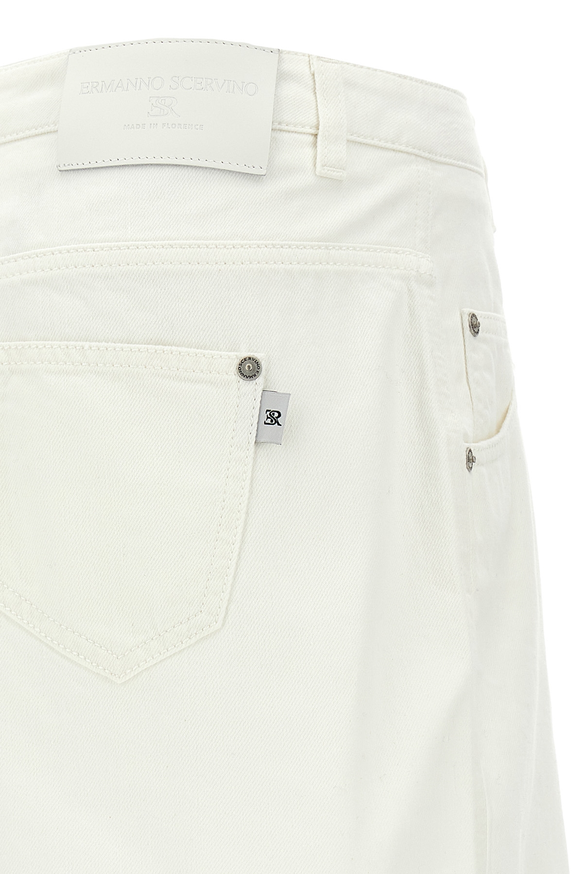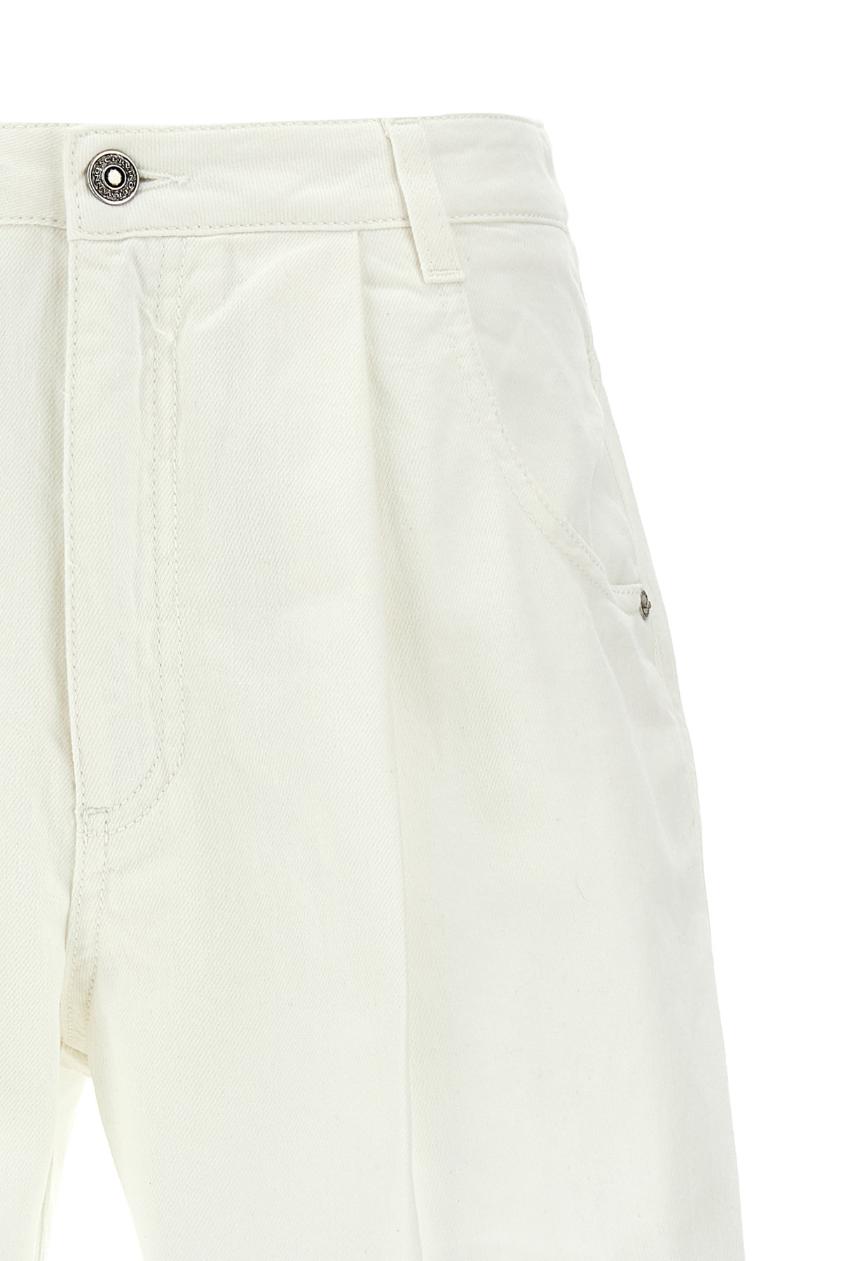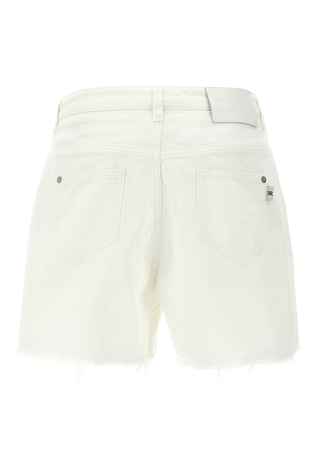 Cotton denim bermuda shorts, wide leg with raw cut, zip and button closure, pockets, back leather logo tag.