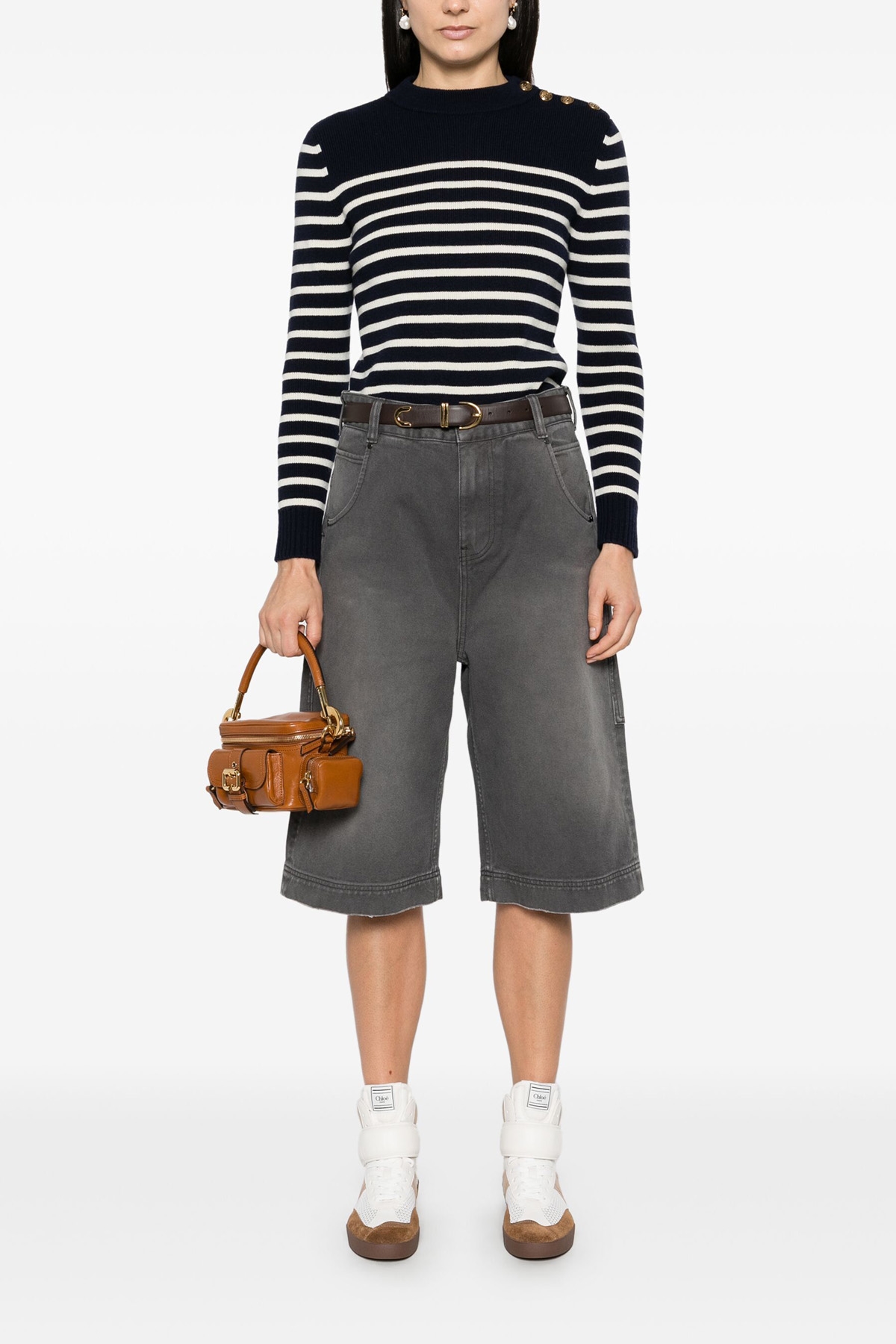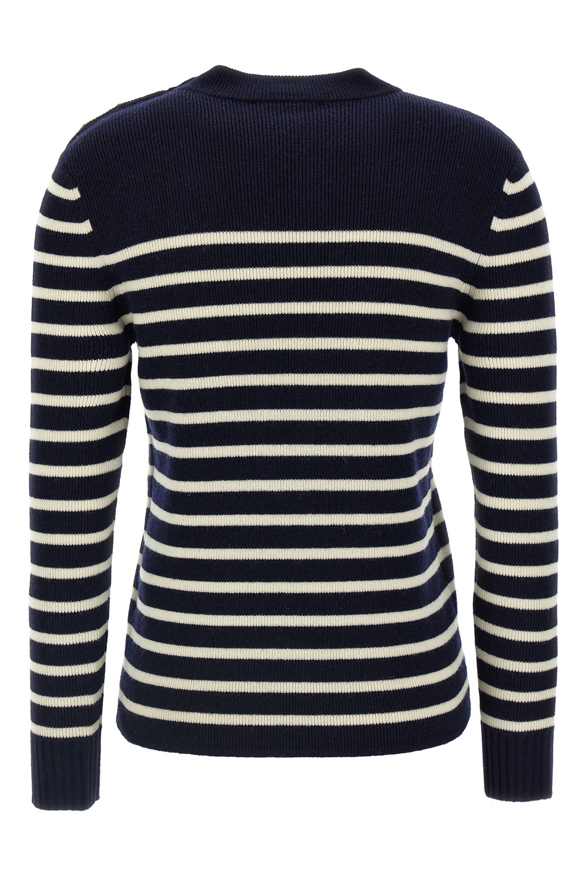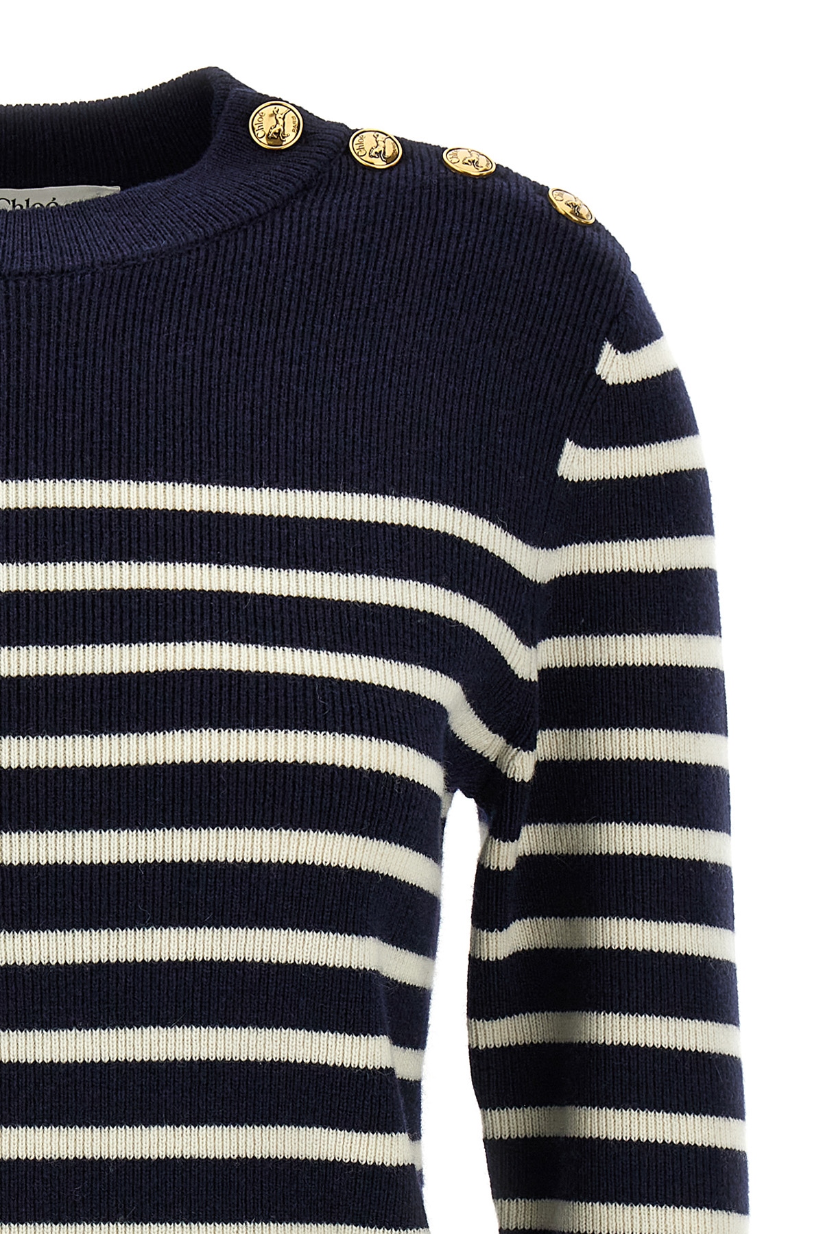 'marinere' striped cashmere blend sweater with gold buttons on the shoulder and long sleeves.