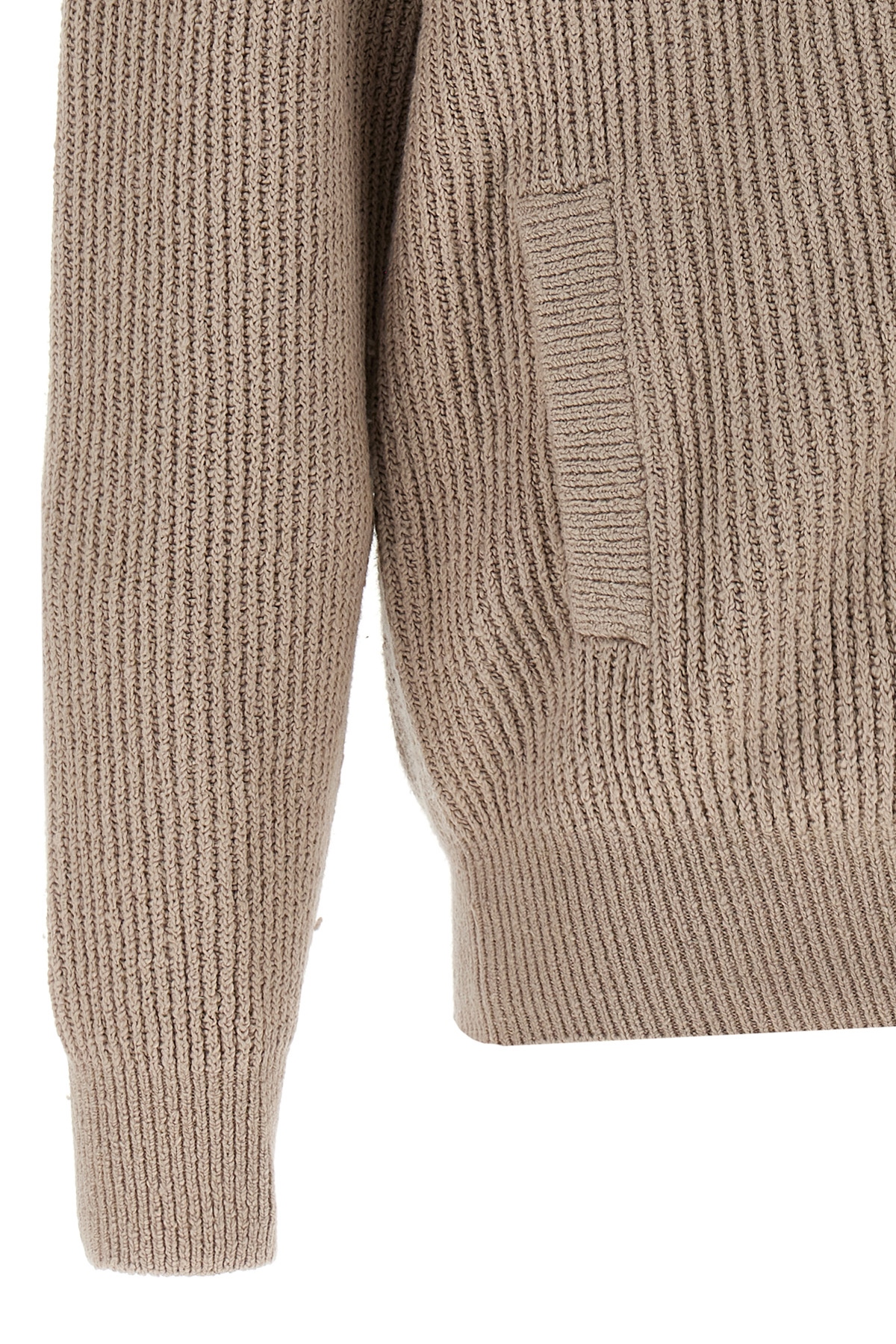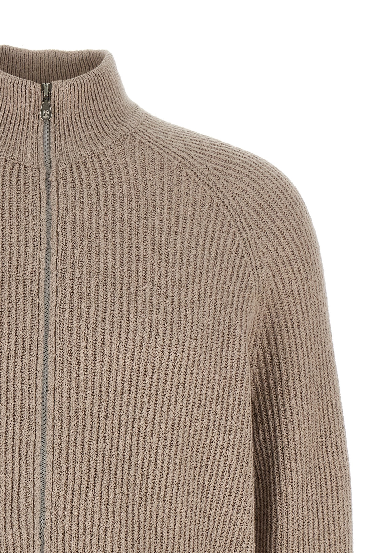 English half-ribbed cotton gauze cardigan, high neck, zip closure, pockets, long cuffed sleeves.