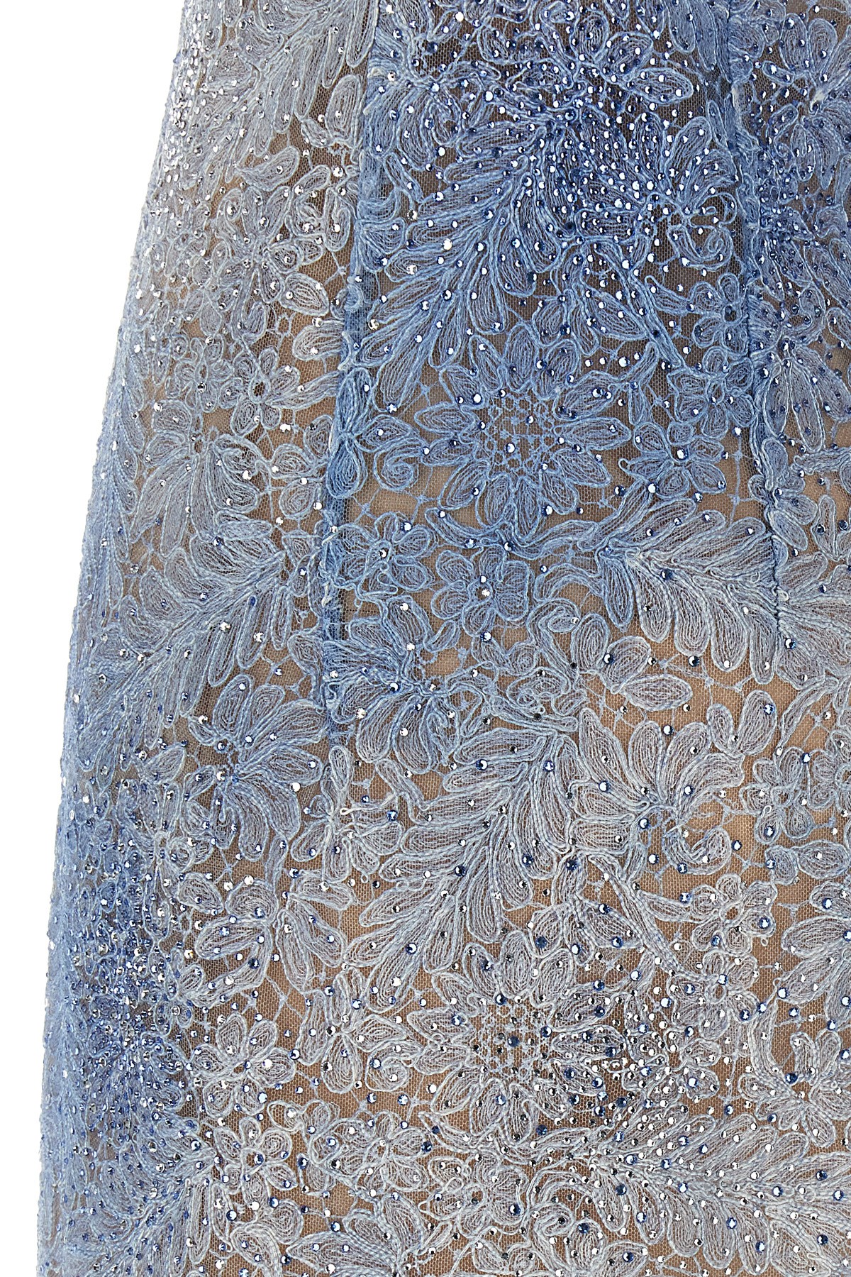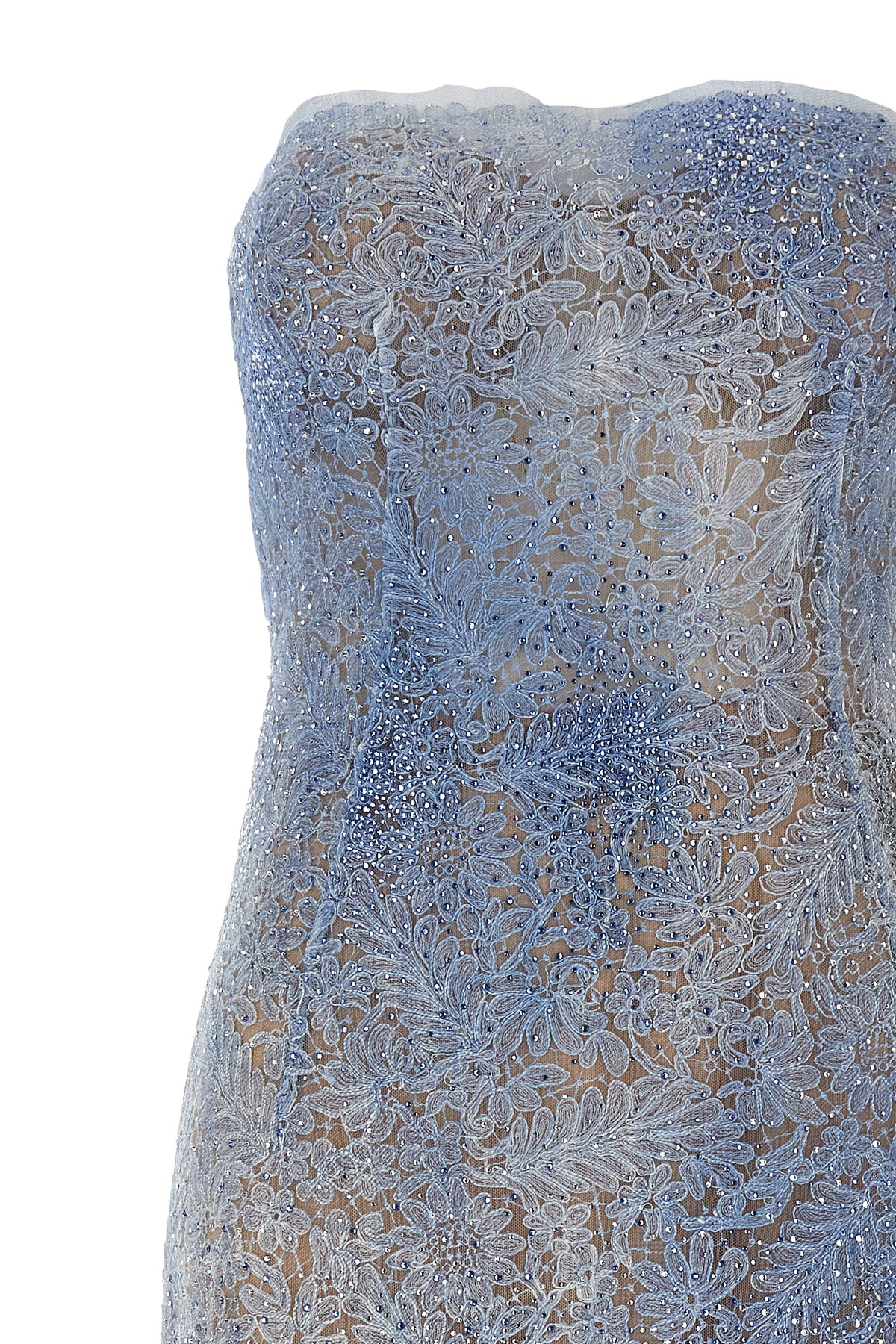 Lace sheath dress with all-over floral pattern and rhinestones, off-the-shoulder style with contoured bustier inside, jagged hem, back zip closure, stretch tulle petticoat.