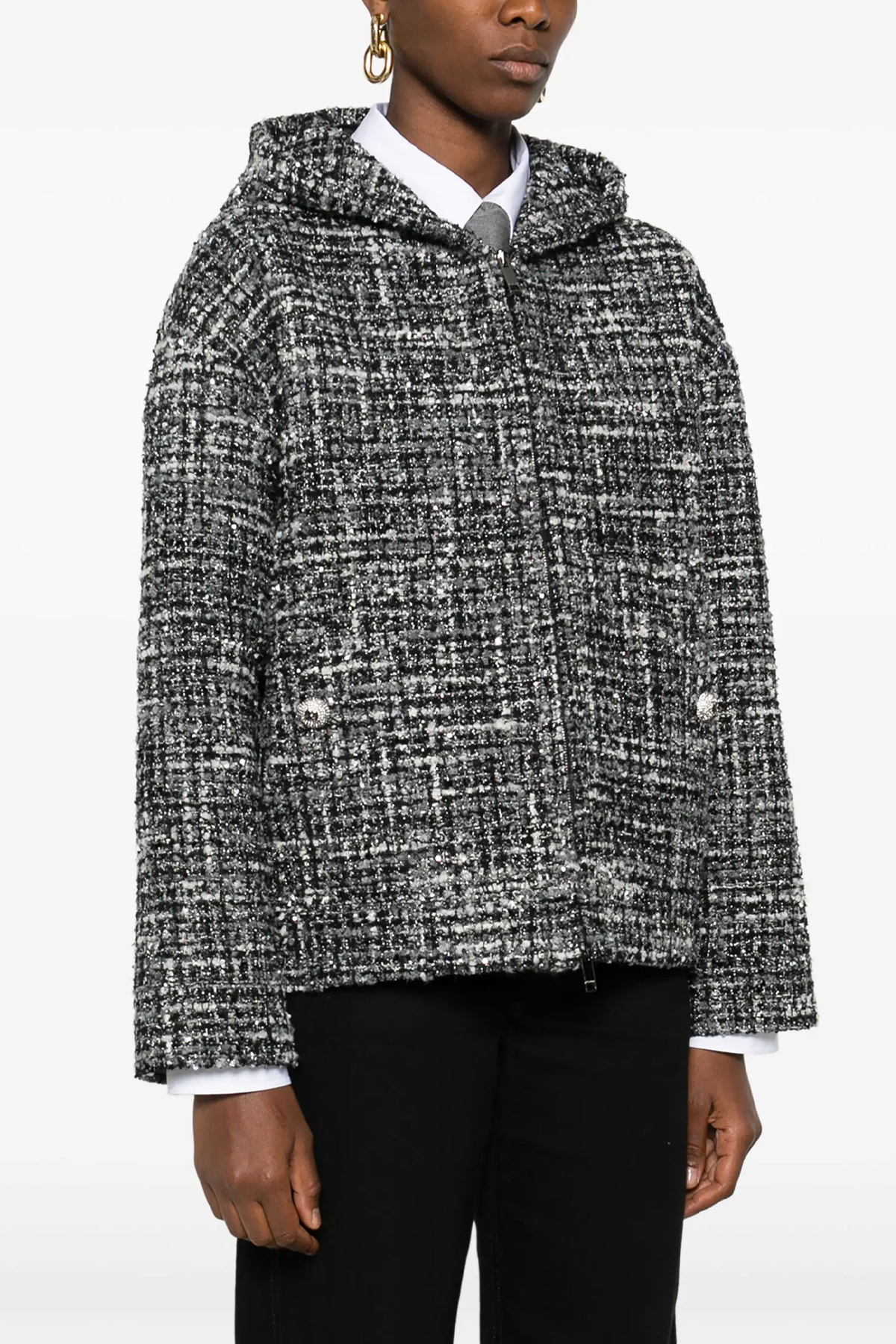 Melange tweed hooded jacket, lined interior, zip closure, jewel button pockets, long sleeves.